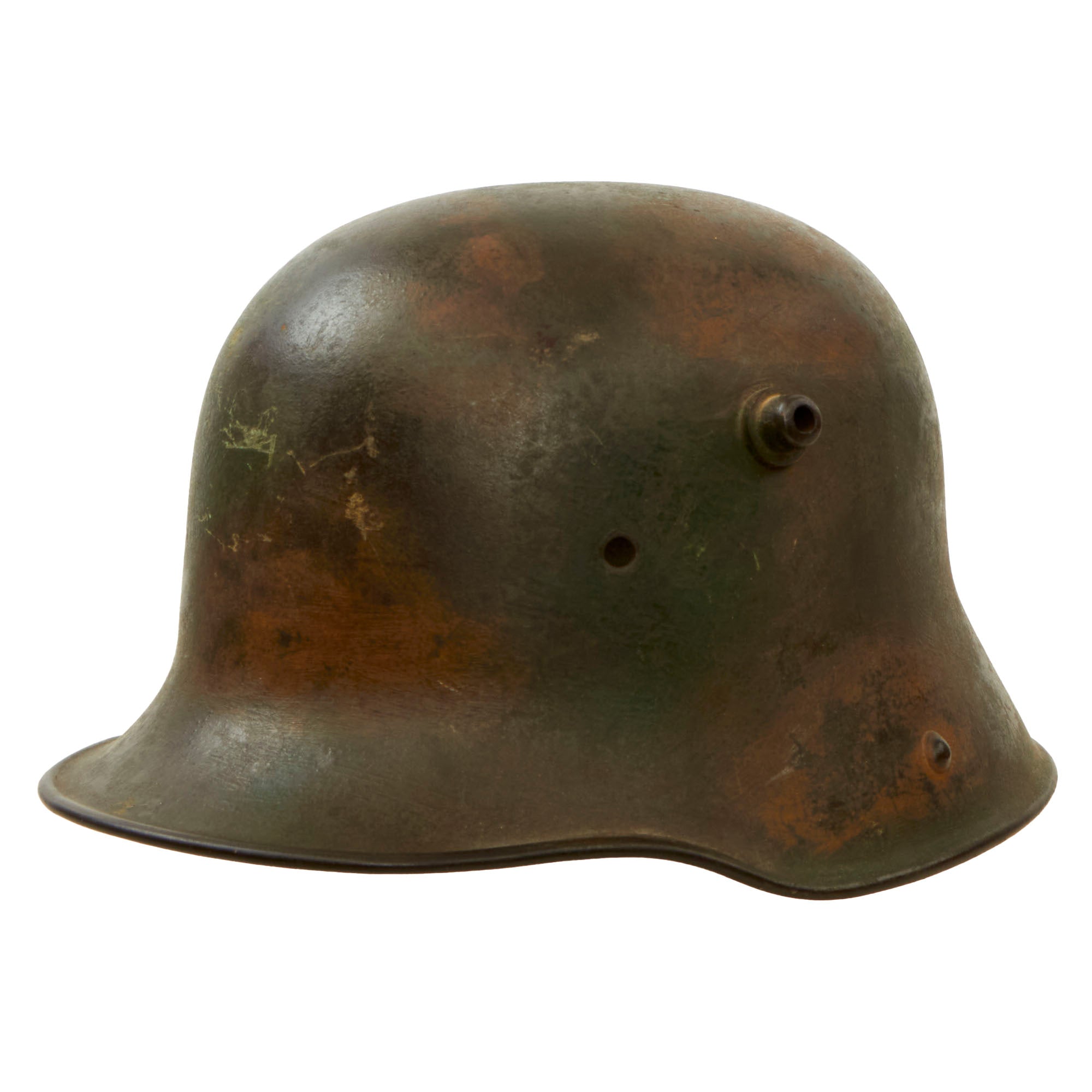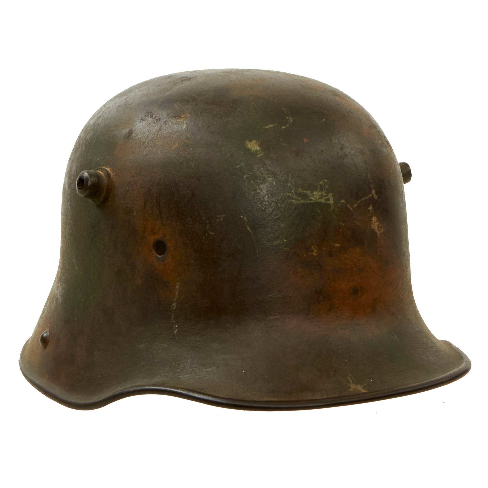 Original Item. One-of-a-Kind. This is a lovely example of a German WWI M1916 Stahlhelm applied with a gorgeous “Splotch” camouflage pattern of mostly yellows and greens. The helmet is missing its liner and chinstrap, but was manufactured by one of the rarer makers, whose helmets are easily recognizable by their rounded ventilation lugs.
