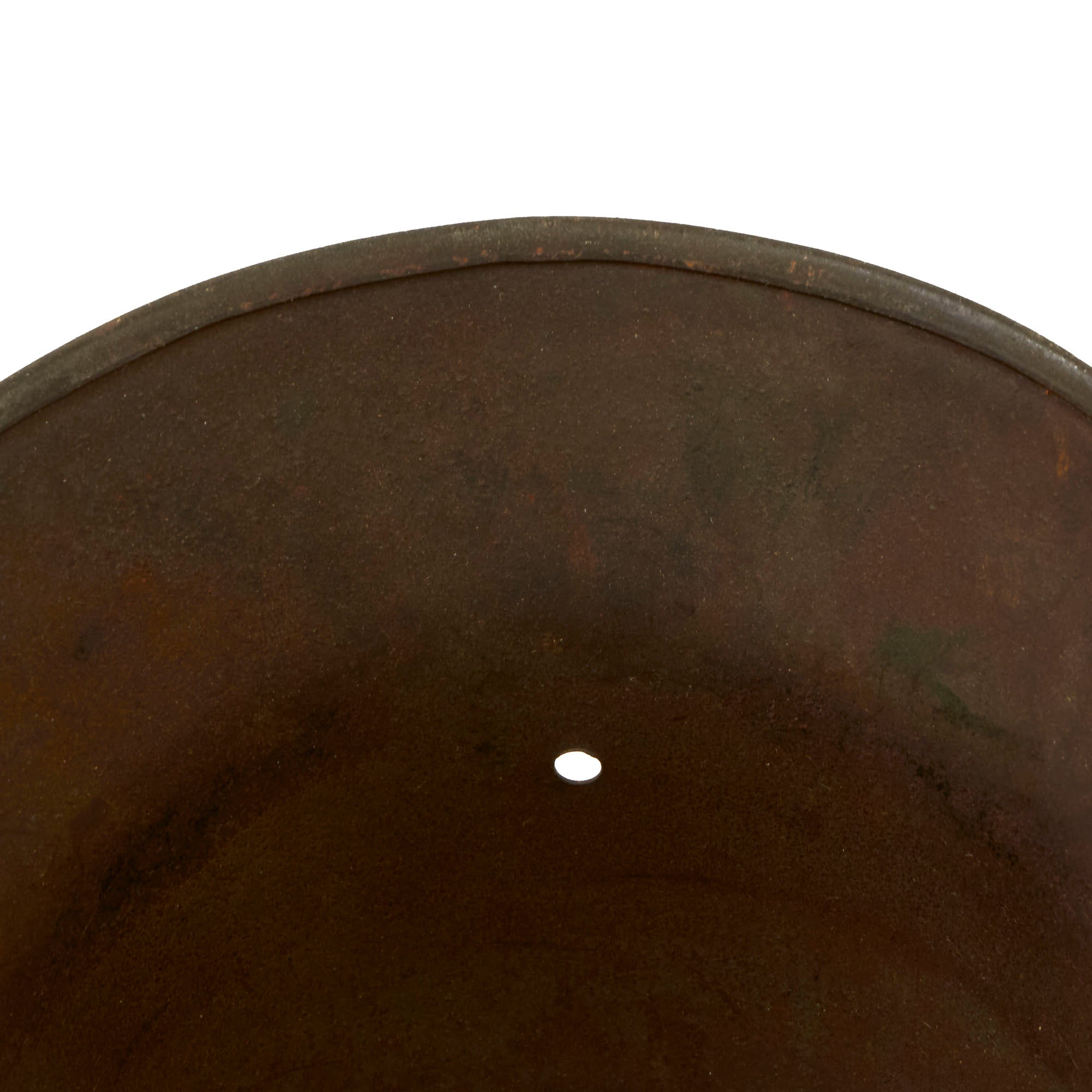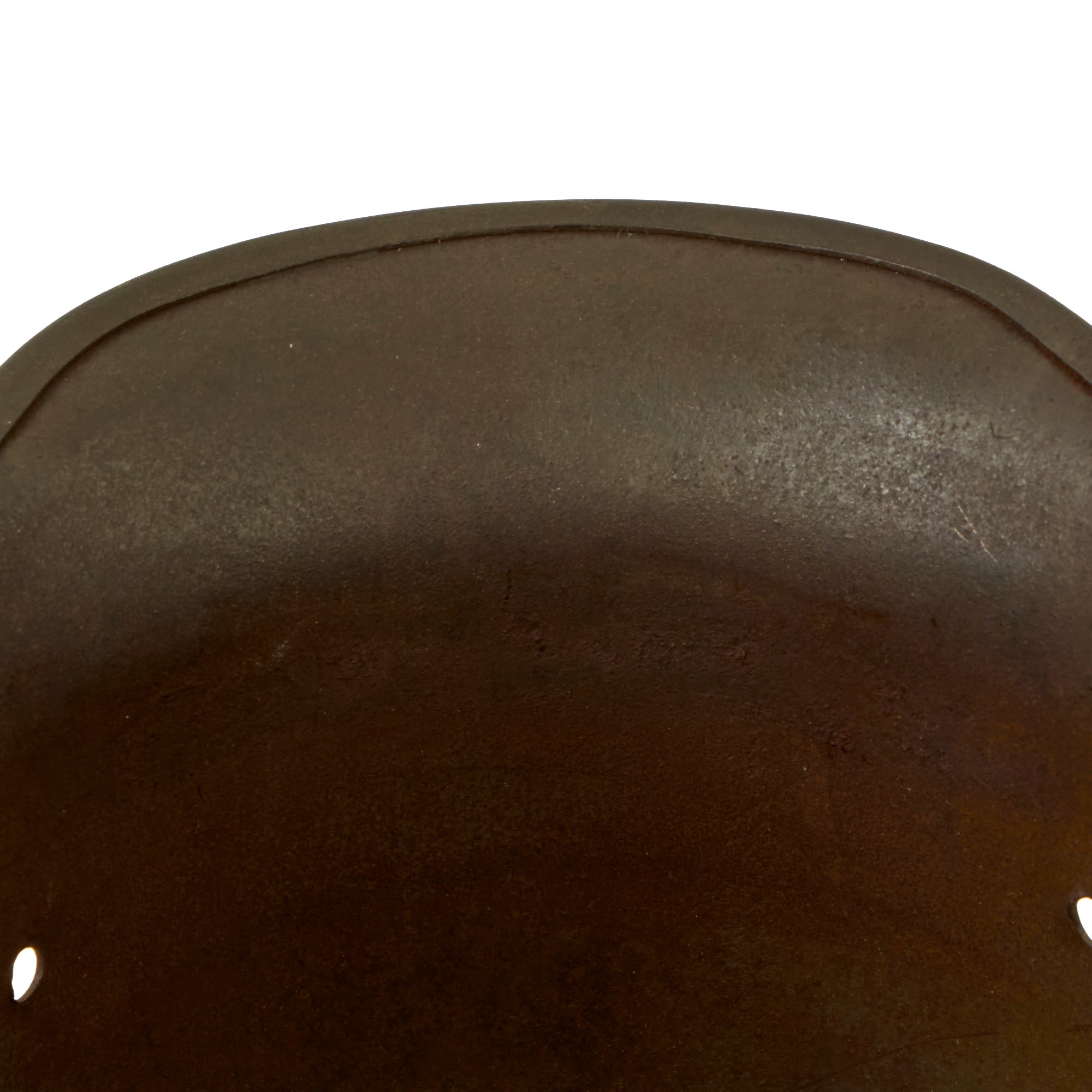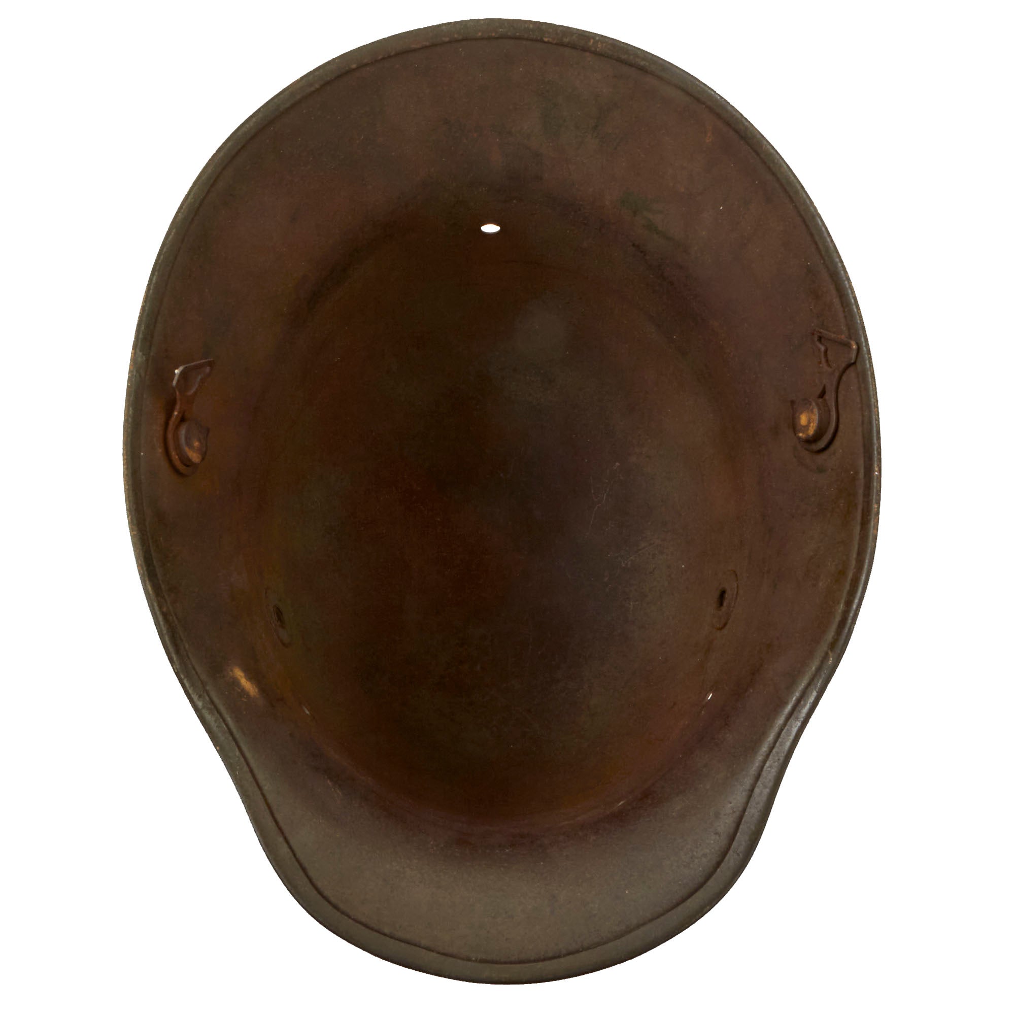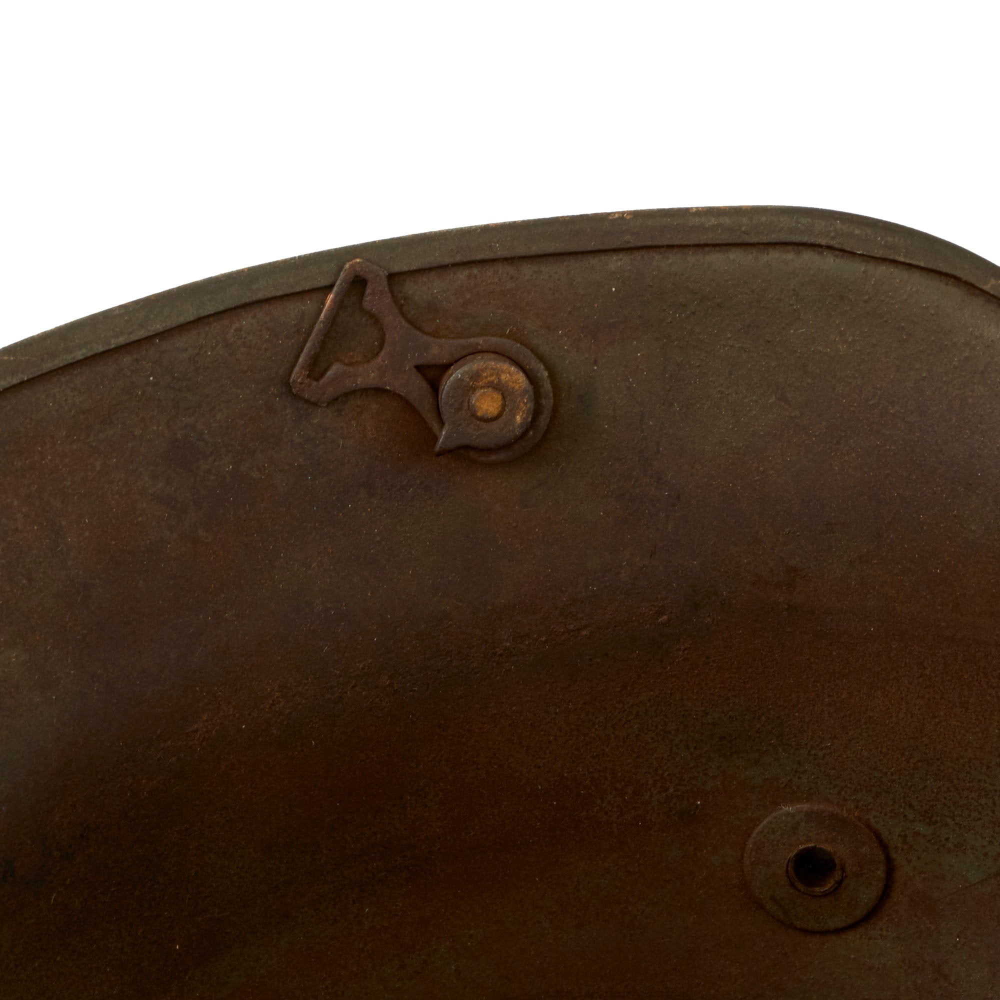 The helmet still has both the dome headed chinstrap retaining rivets, which hold the interior pickelhaube style chin strap lugs in place. Both of the original end pieces for the chinstrap are still attached. It also retains both of the extended ventilation side lugs, which are the correct longer type with a small step for the small size 64 shell. This would ensure proper installation of a Stirnpanzer brow plate regardless of shell size. These lugs have rounded ends, which are only noted on helmets manufactured by one specific manufacturer.