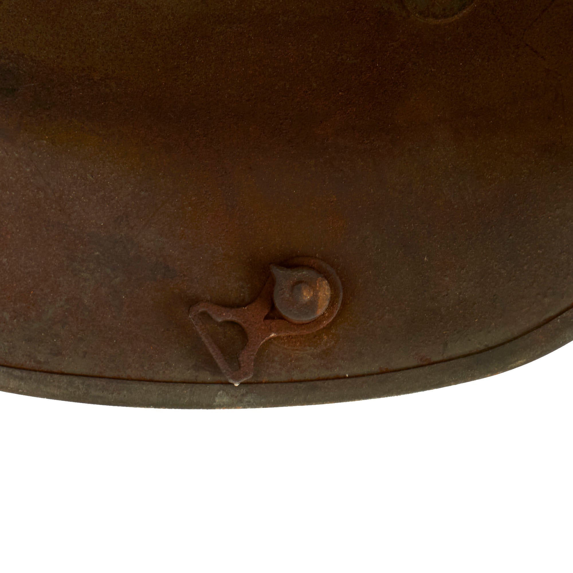 Above the left ear interior of the apron of the shell has a faintly stamped manufacturer's code and size “Bell” L. 64, also called the rattle logo, which indicates manufacture by R. Lindenberg A.G. of Remscheid-Hasten, who produced shells in only size 64 during WWI. Due to the paint on the shell it was not possible to get a clear picture, but the marking is definitely there. Size 64 is a medium size shell, which can accommodate size 56-67 liners. We found a partial rolling mill stamp, 85S, which we do not recognize.