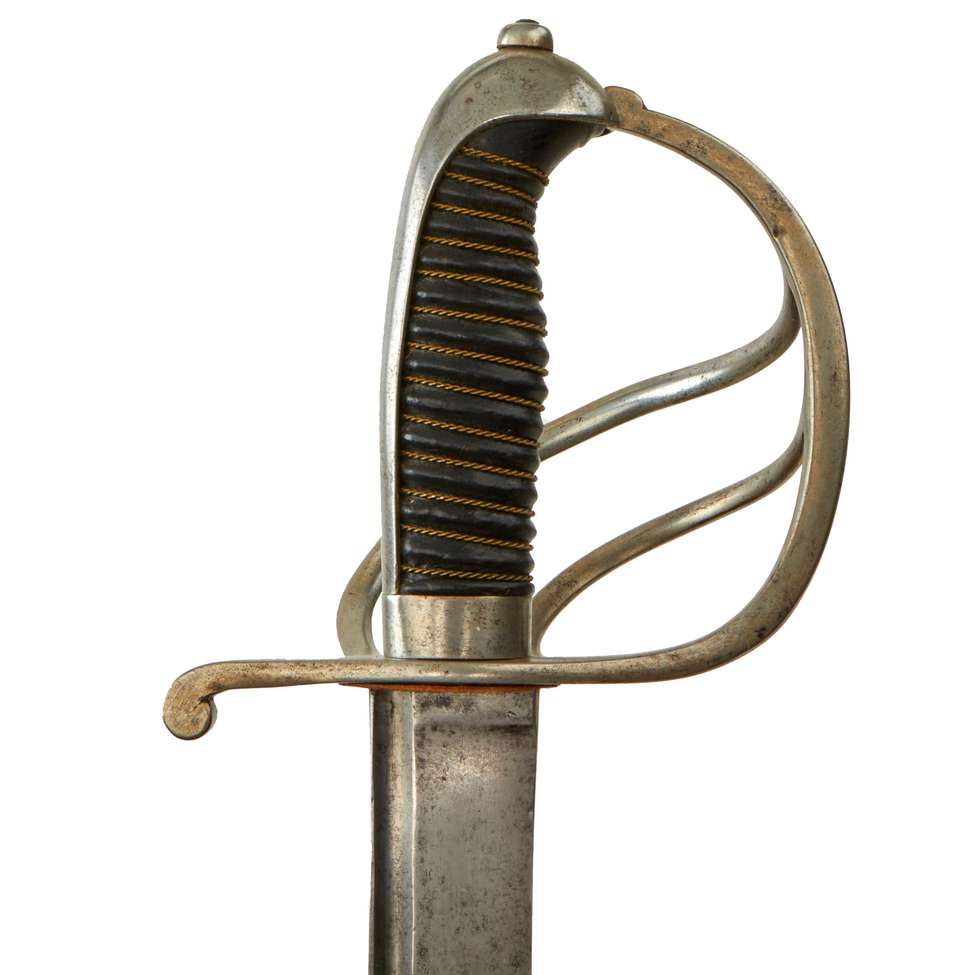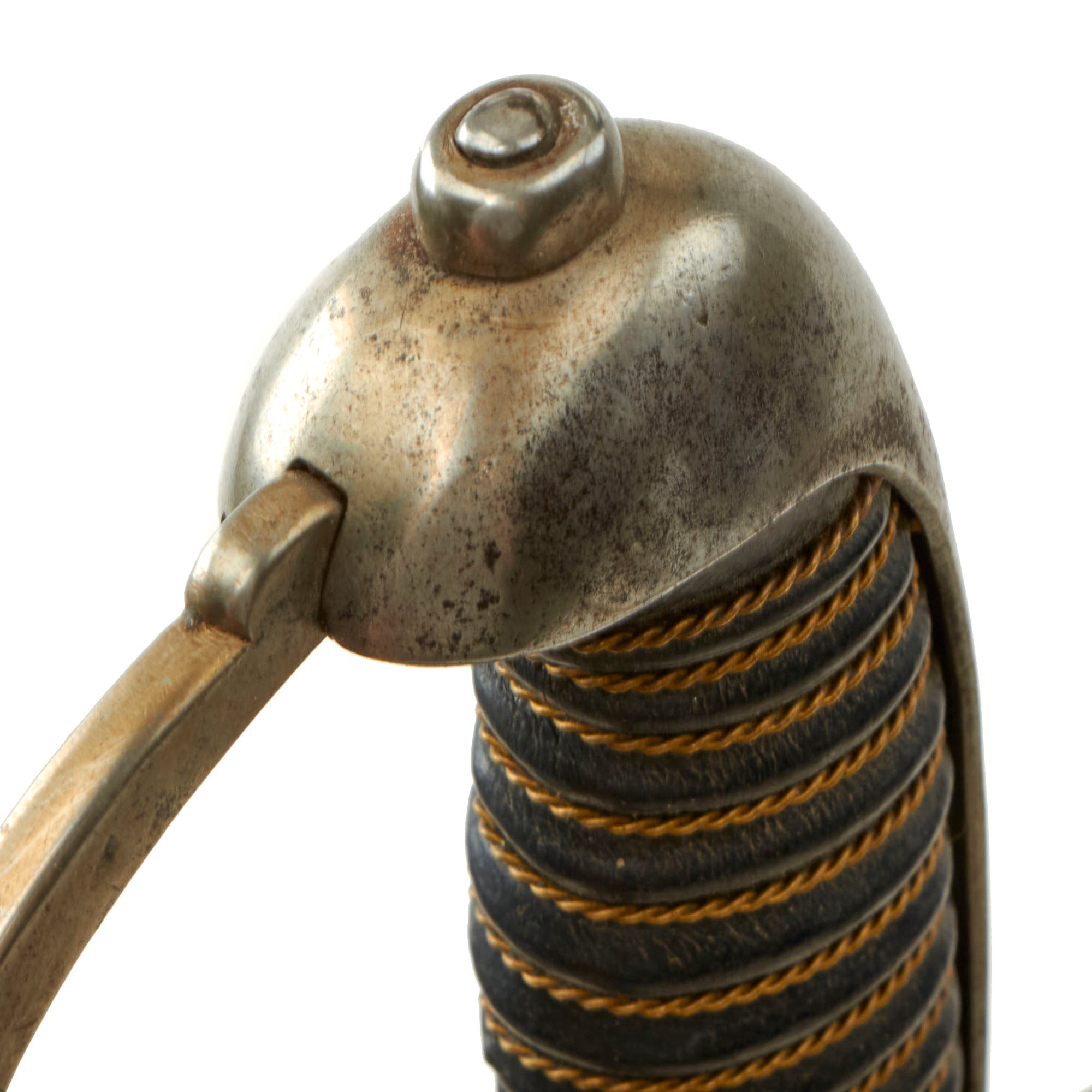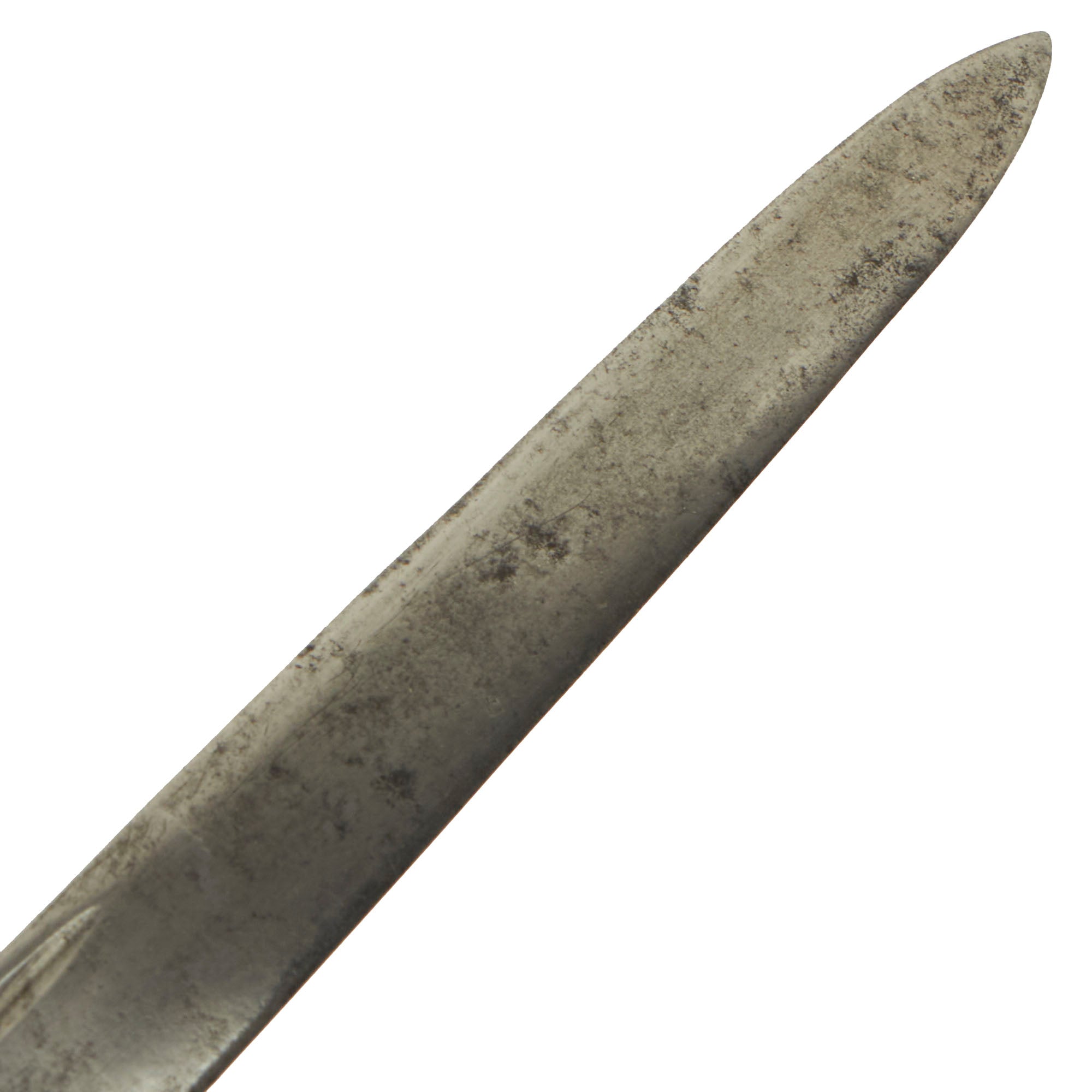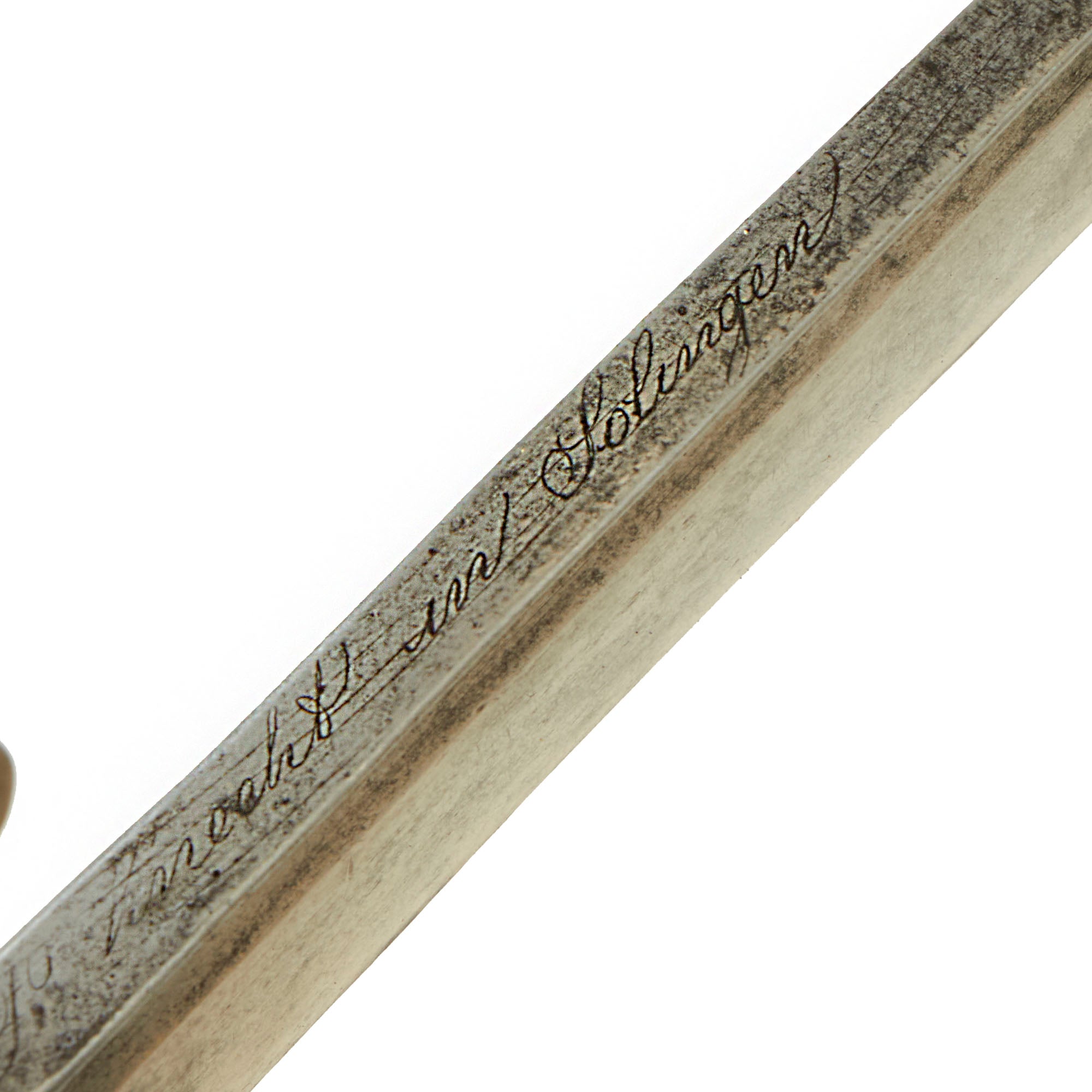 The 34” straight blade has a small fuller across its first ¾, with evidence of past oxidation having been cleaned away. The spine is engraved P. Knecht in Solingen, for a known maker of the period who also manufactured blades for swords on both sides of the American Civil War.