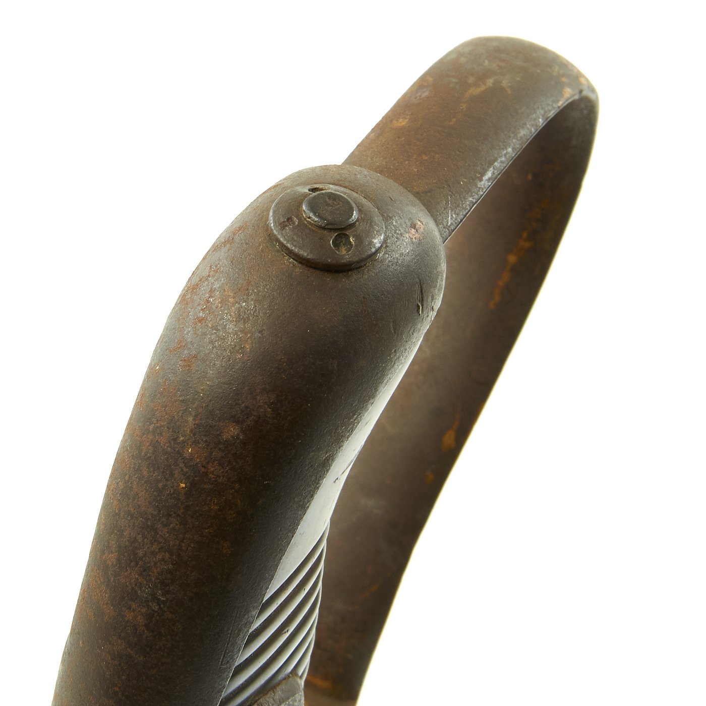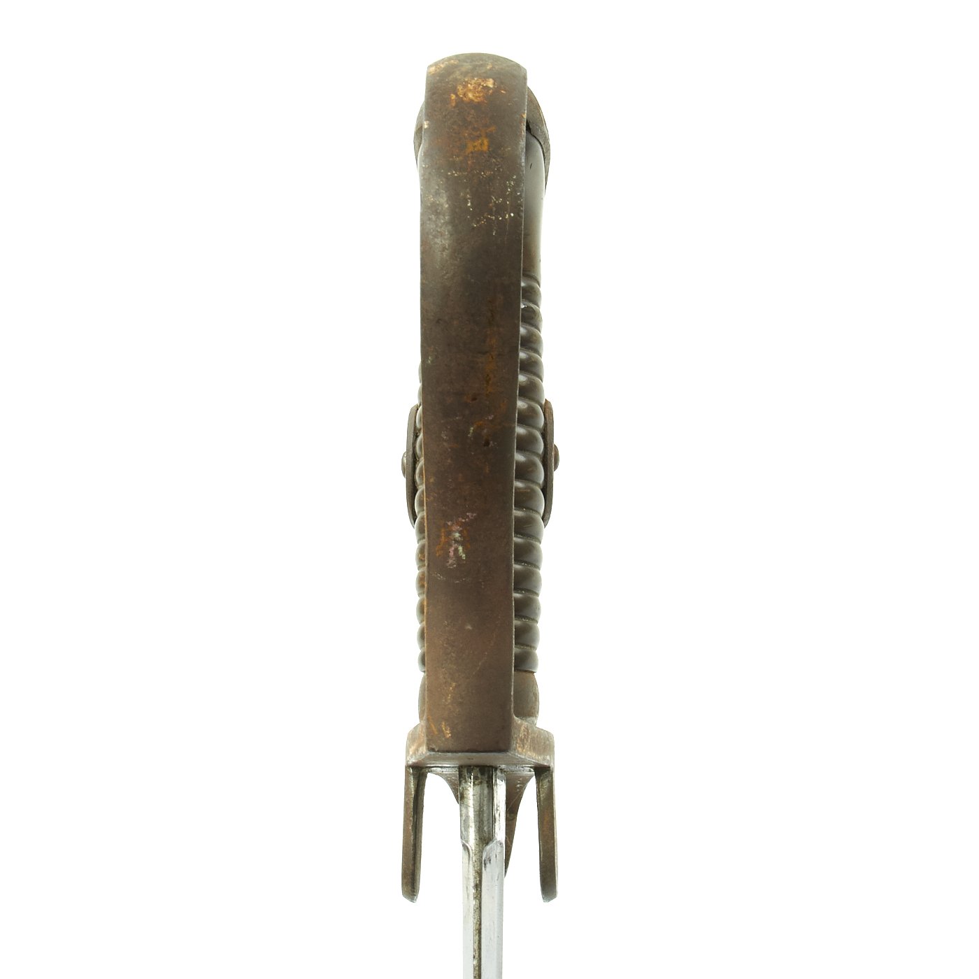 This example is in very nice "attic find" condition showing ver nice blade condition, with only a few areas of light oxidation on the otherwise bright blade. The machining marks can even still be seen on most of the blade body. The blade has been sharpened, and there are a few small nicks, but it is still quite nice. It is stamped on the upper spine near the hilt is a small Crown over W over 16 for Kaiser Wilhelm II 1916, the year it was accepted into service. The maker of the sword is E. & F. HÖRSTER of SOLINGEN. and is stamped under the rain guard (chappe), which makes it quite hard to see, and even harder to photograph. The sword also has the standard bakelite ribbed grip, as expected on the later model swords, with the characteristic single knuckle bow hand guard.