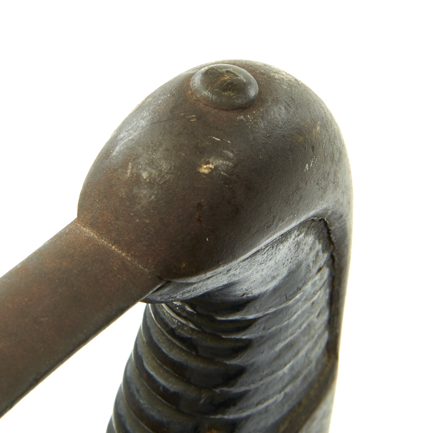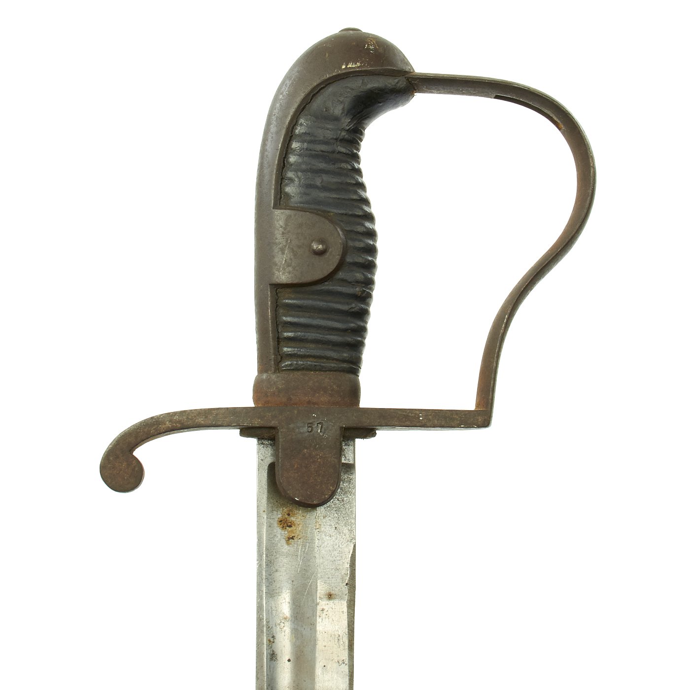 The opposite ricasso is marked CROWN / ERFURT, for the Royal / Imperial Erfurt Arsenal, located in Thuringia. This would indicate possibly that the blade was made under contract, and then shipped to Erfurt for fitting to a hilt. The sword also has an early wooden grip, which has been painted over several times, with the characteristic single knuckle bow hand guard.