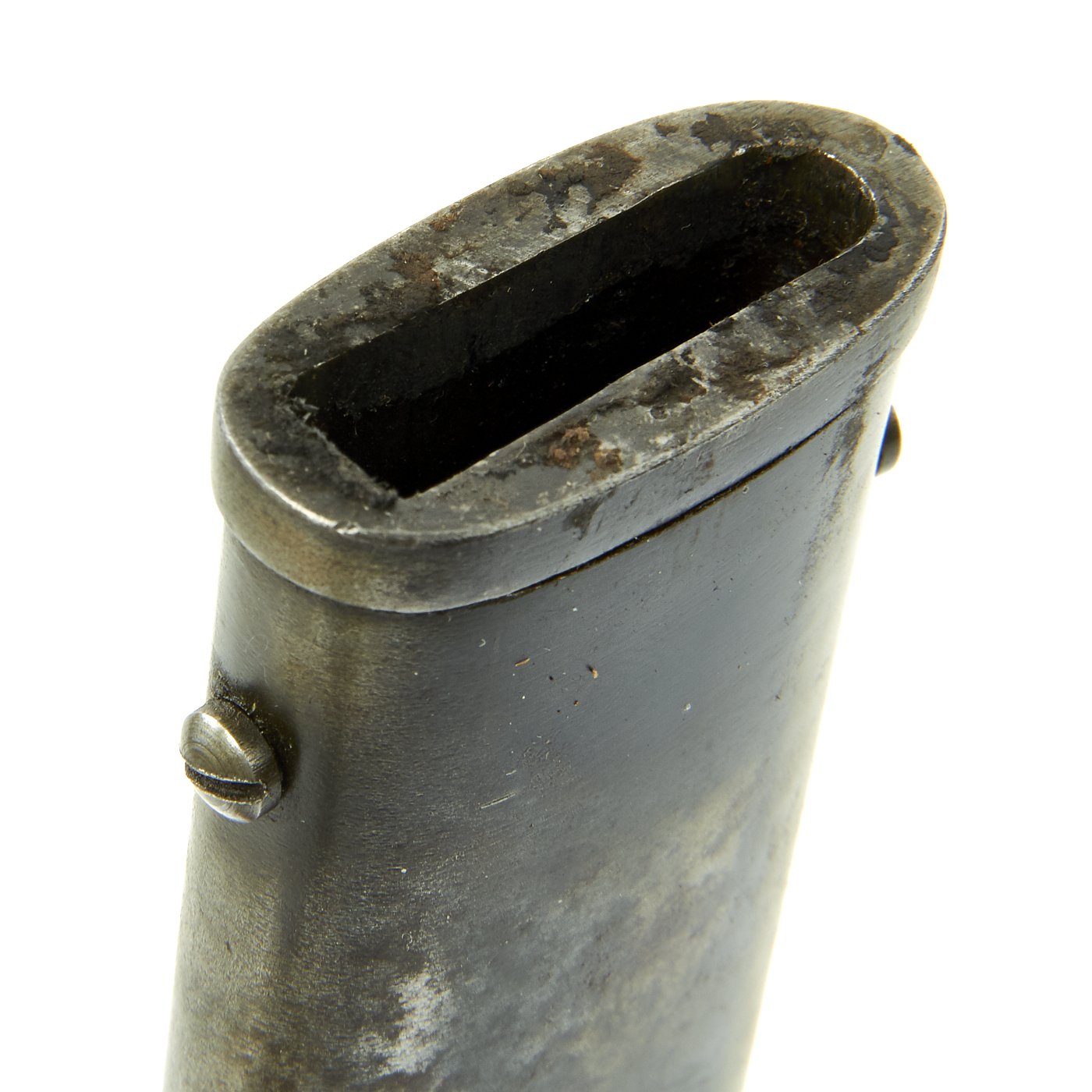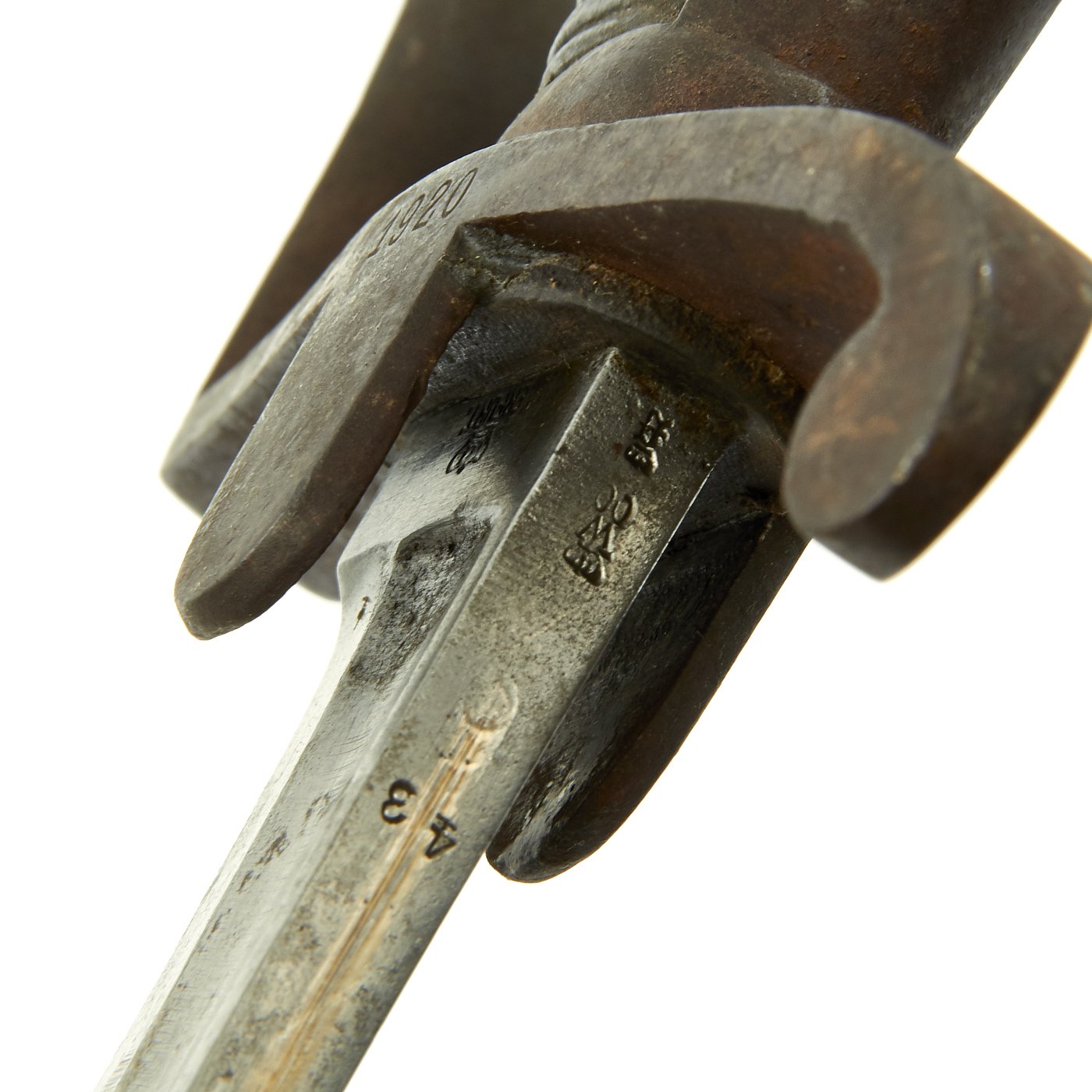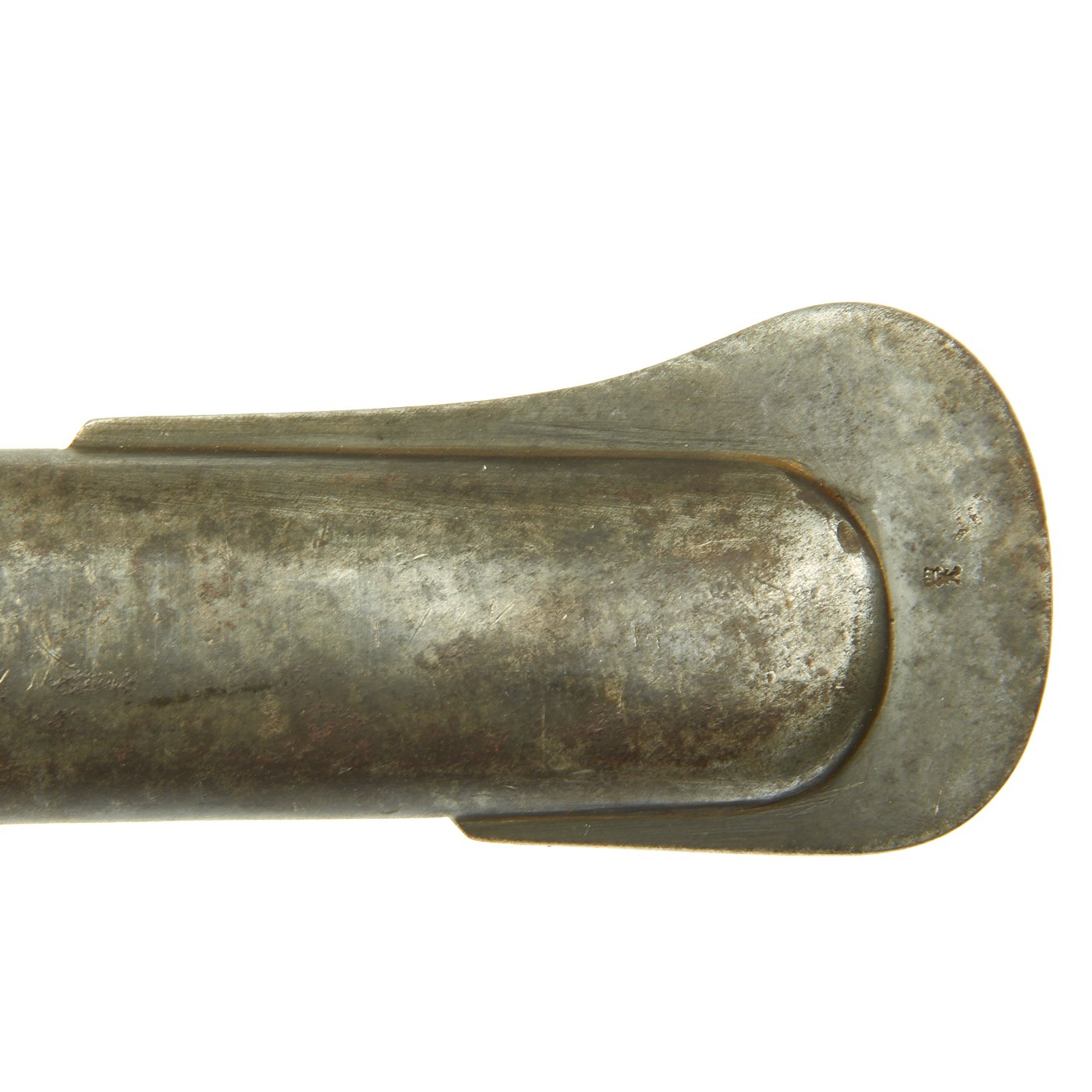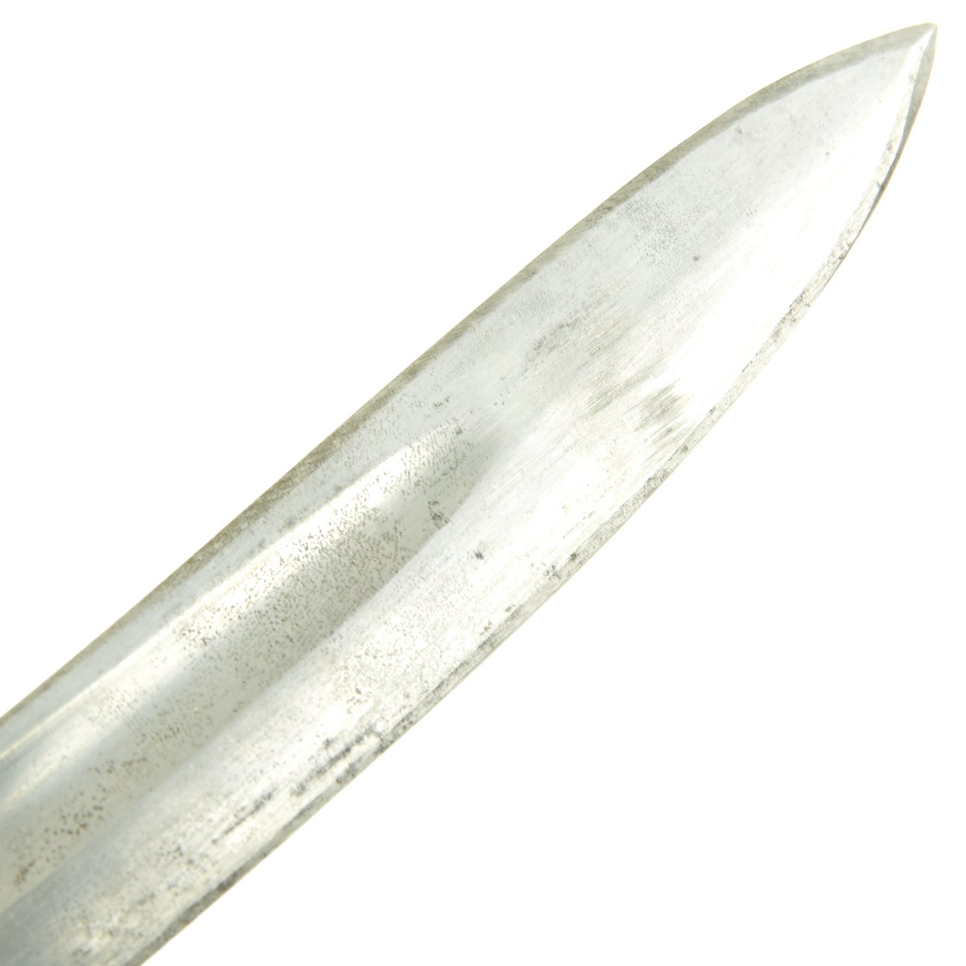 There are various proof marks on hilt and blade, and this sword comes with the original all steel scabbard, which is in good condition. It does have some significant dents in the body, but the sword still can be sheathed. The original hanger loop is still present.