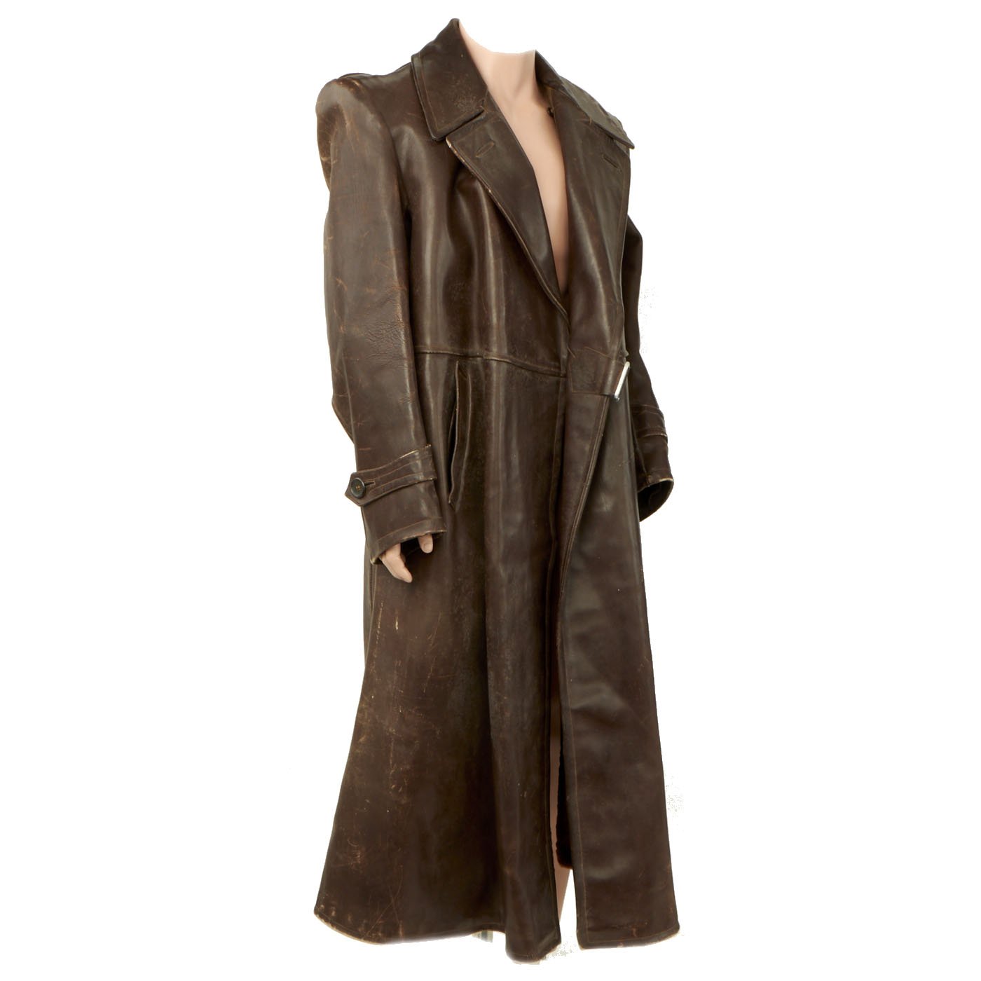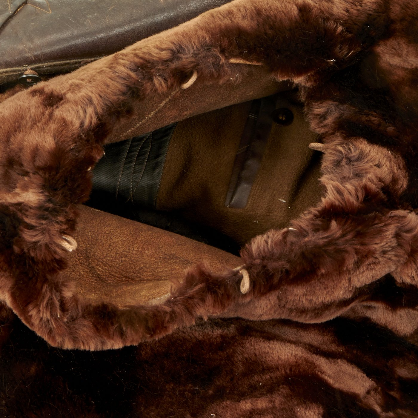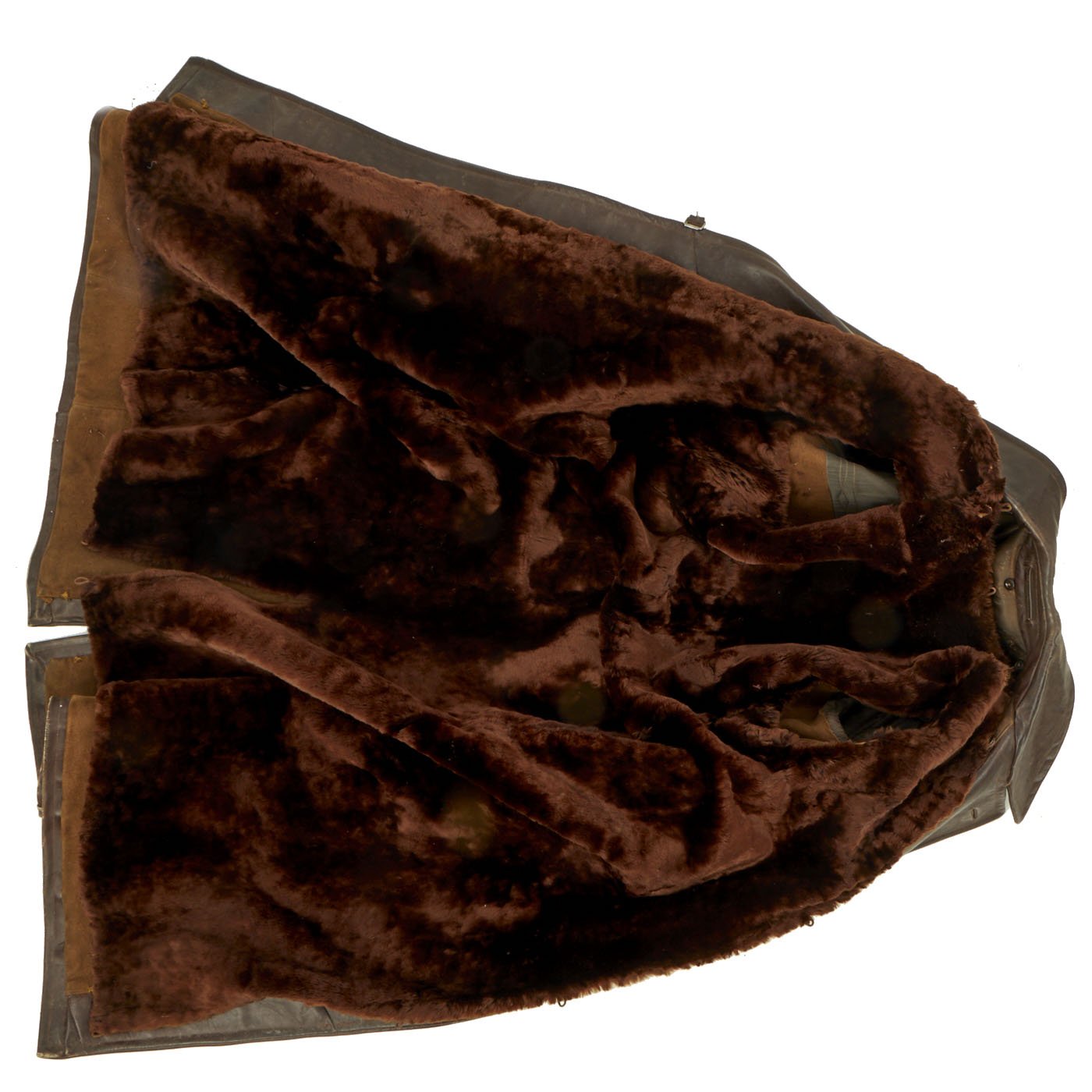 Original Item: Only One Available. Imperial German Aviator’s Full Length Leather Greatcoat with detachable fur liner. An iconic piece associated with the flyers of WWI. This particular jacket is made of heavy brown leather lined with a combination of brown moleskin cotton and Grey artificial silk. The removable liner secures into the coat by means of loops which secure to buttons sewn within the liner of the coat. The coat is in very good condition, especially considering its age. There are a few areas of loose stitching, such as under the right armpit. It is missing its original waist belt.
