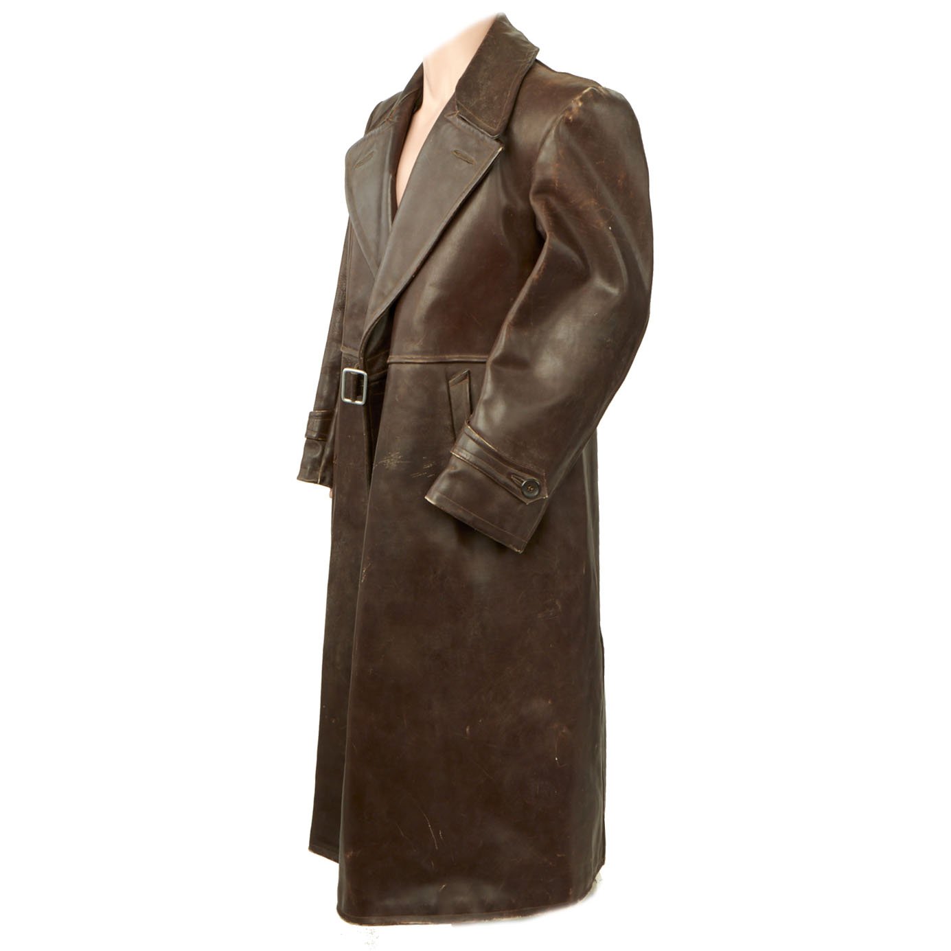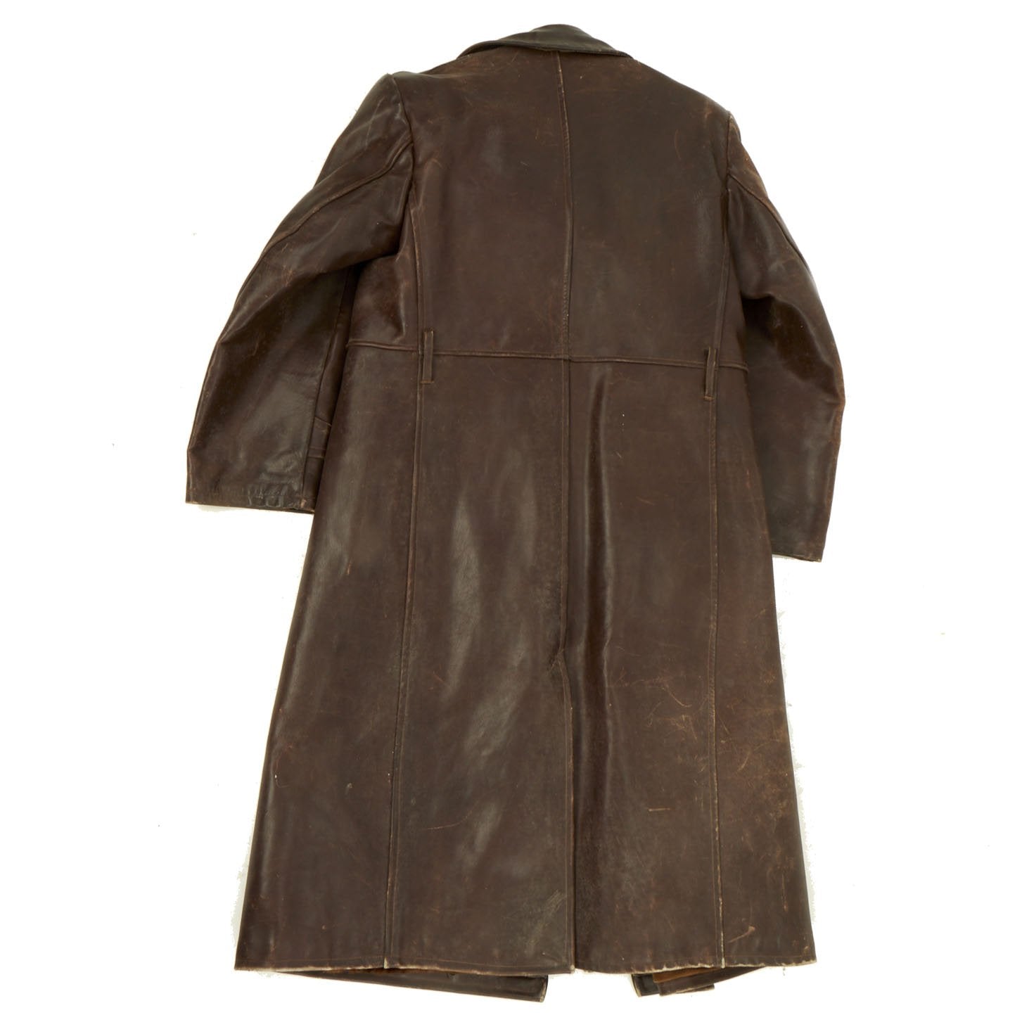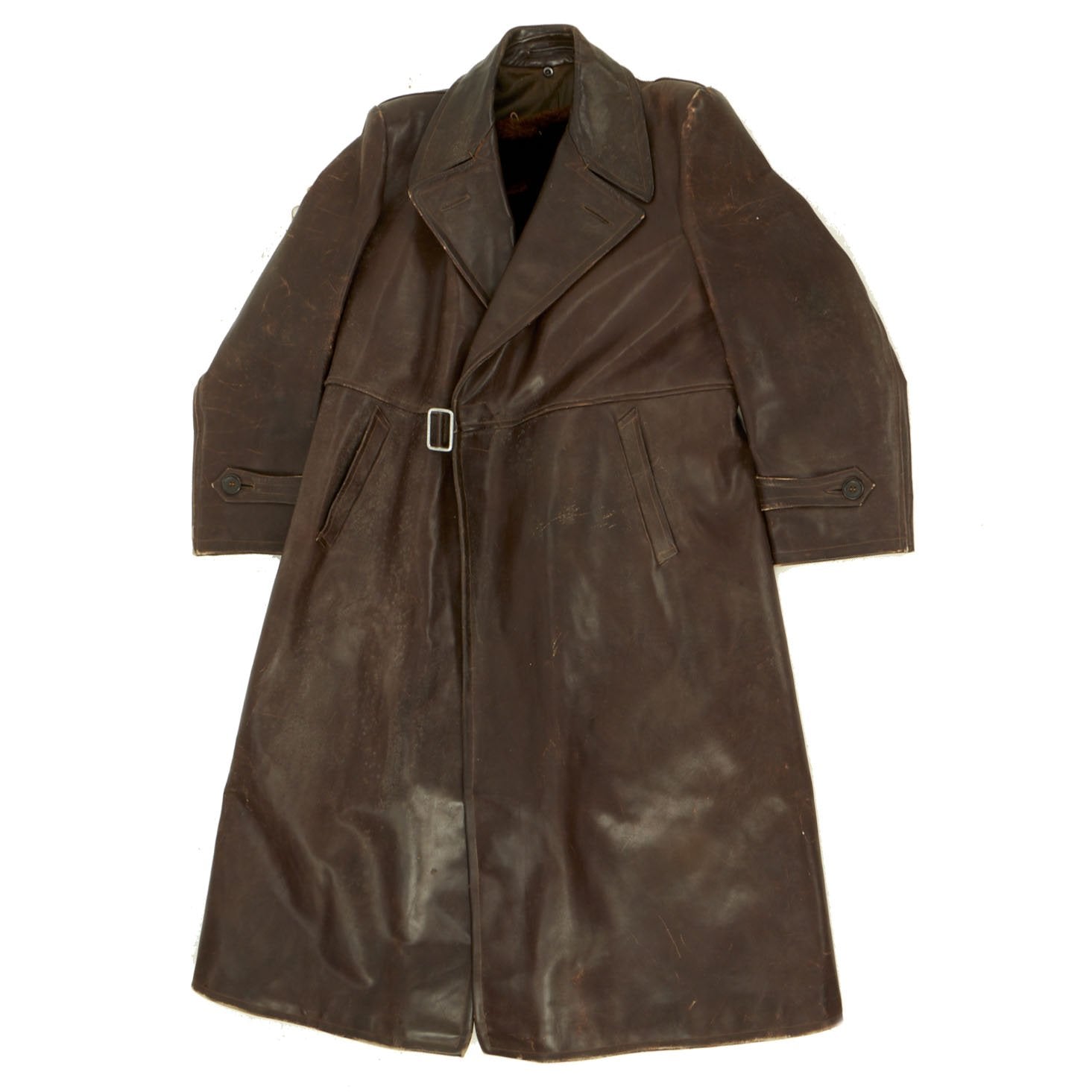 Original Item: Only One Available. Imperial German Aviator’s Full Length Leather Greatcoat with detachable fur liner. An iconic piece associated with the flyers of WWI. This particular jacket is made of heavy brown leather lined with a combination of brown moleskin cotton and Grey artificial silk. The removable liner secures into the coat by means of loops which secure to buttons sewn within the liner of the coat. The coat is in very good condition, especially considering its age. There are a few areas of loose stitching, such as under the right armpit. It is missing its original waist belt.