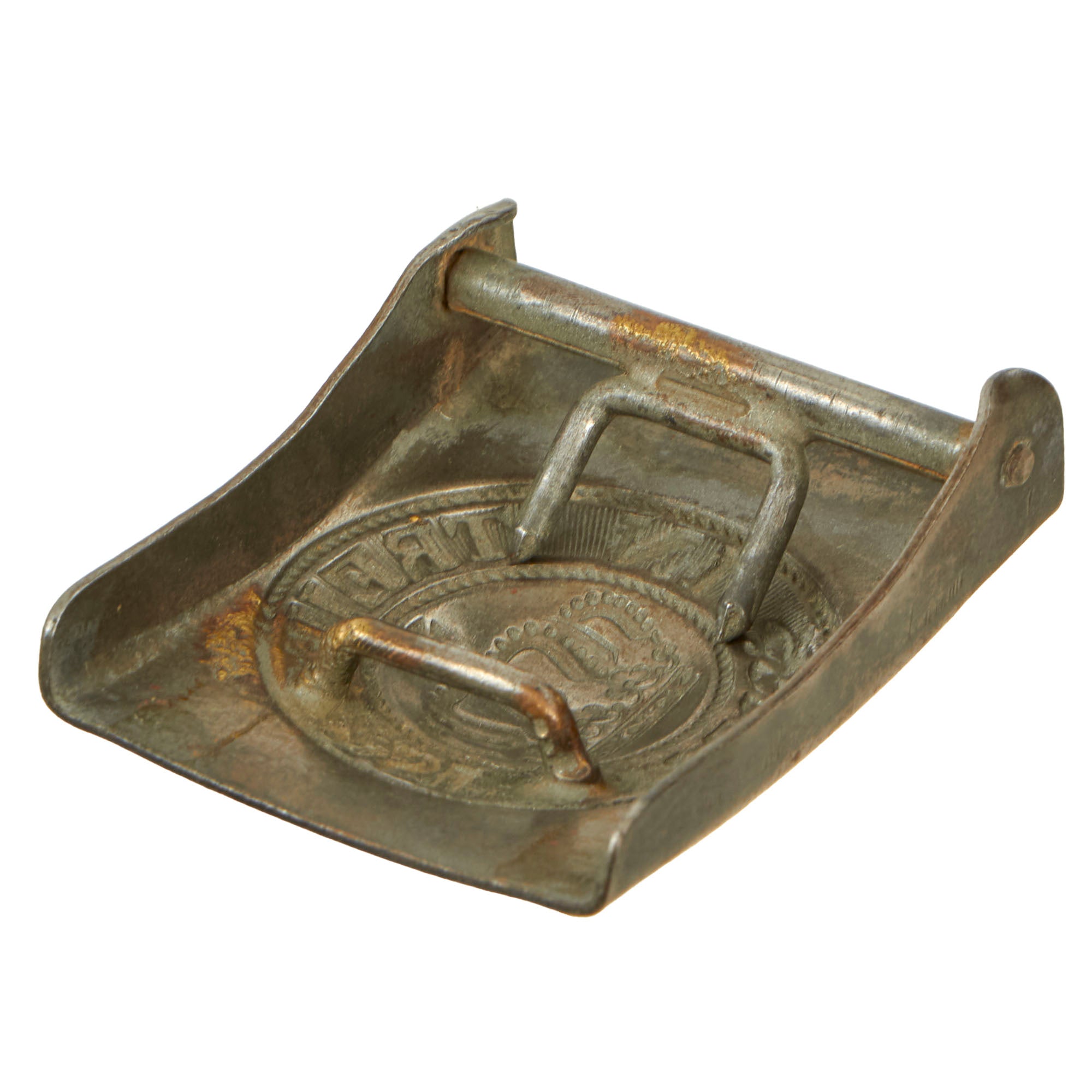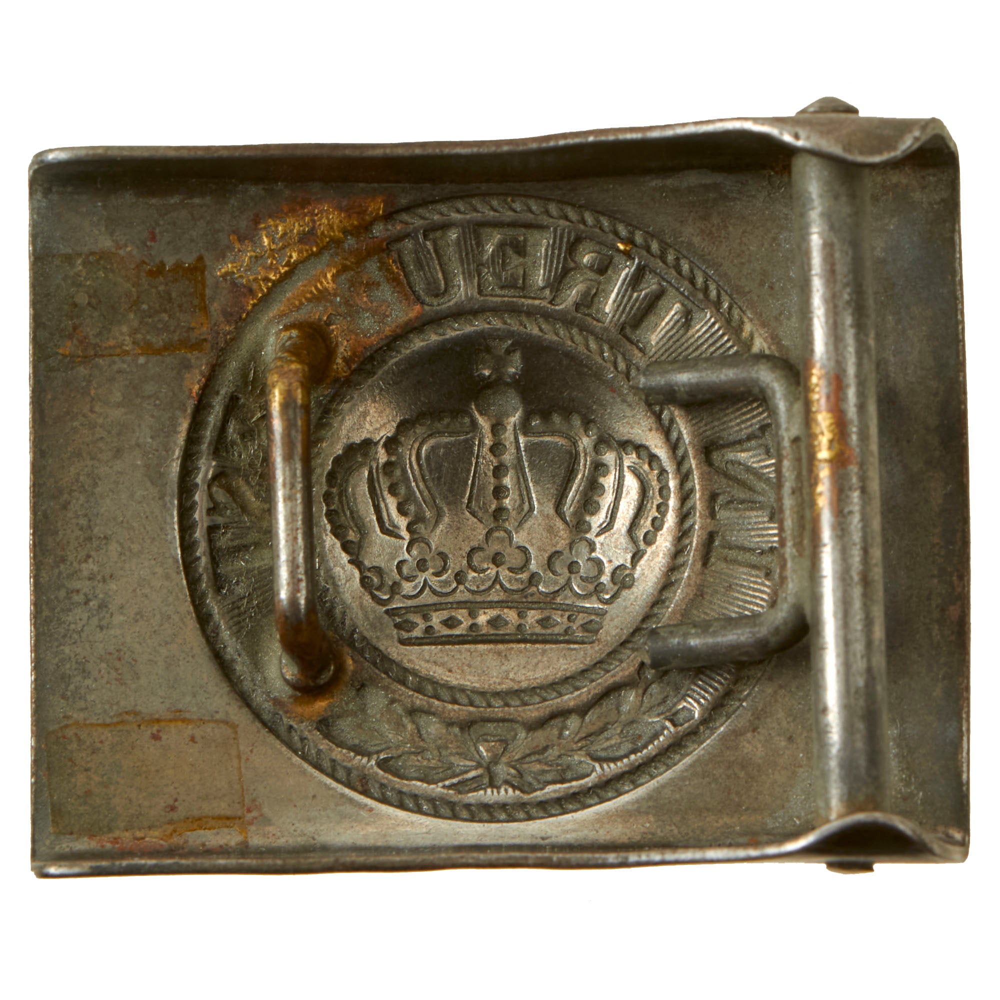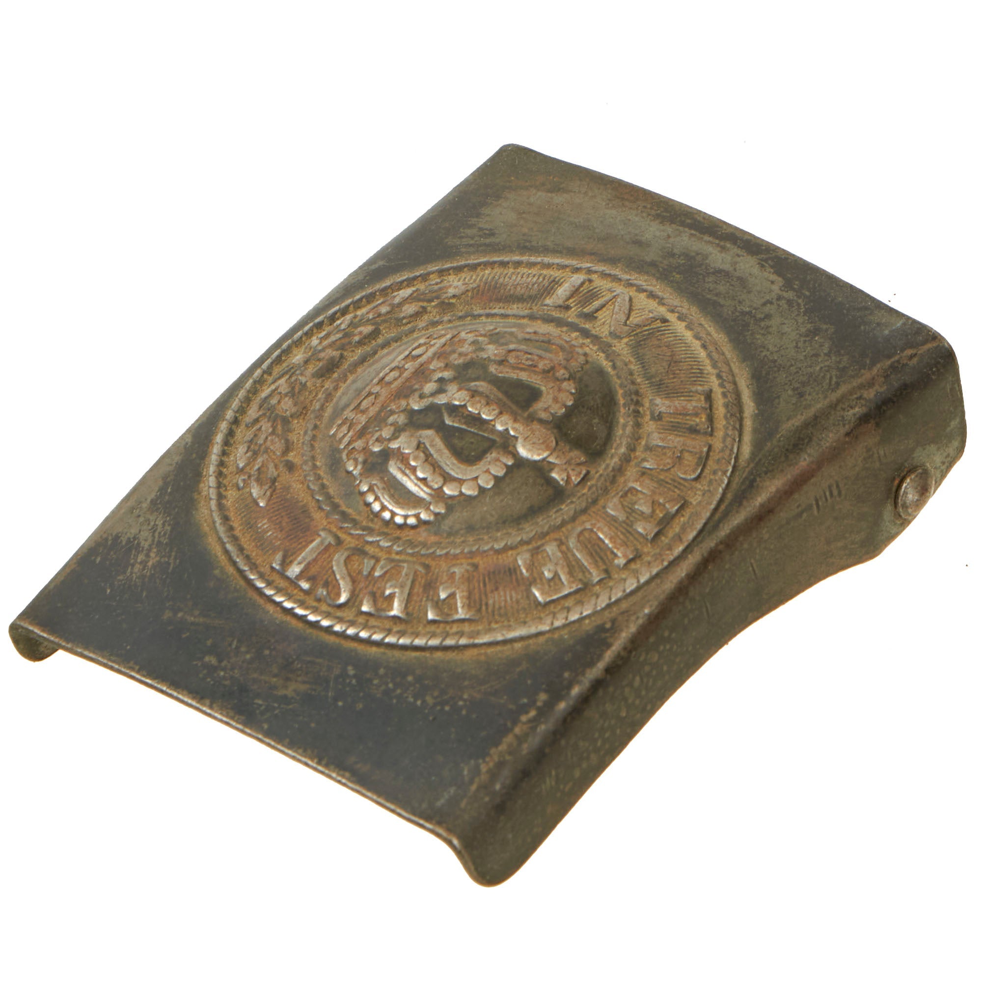 Original Item. Only One Available. German belt buckles remained largely unchanged for over a hundred years spanning the 19th and 20th centuries. Although there were modest changes, the basic manufacture did not change until the Great War. War time would have seen three primary variations of buckles. The first was the standard 1895 model. This model is easily distinguished by its brass body and soldered nickel/silver roundel, which would bear the insignia and motto of the German state for whom it was made. Those states using a roundel were as follows: