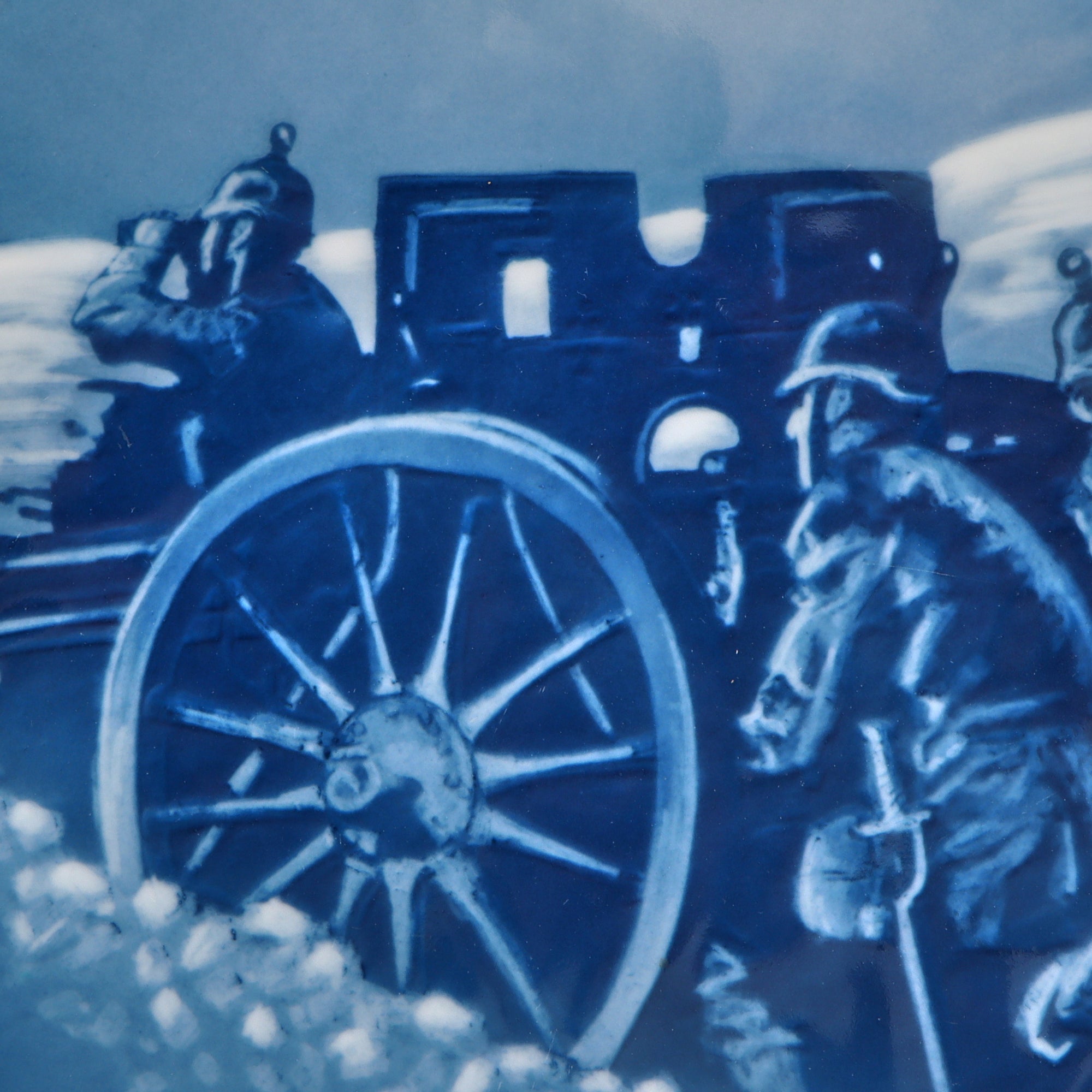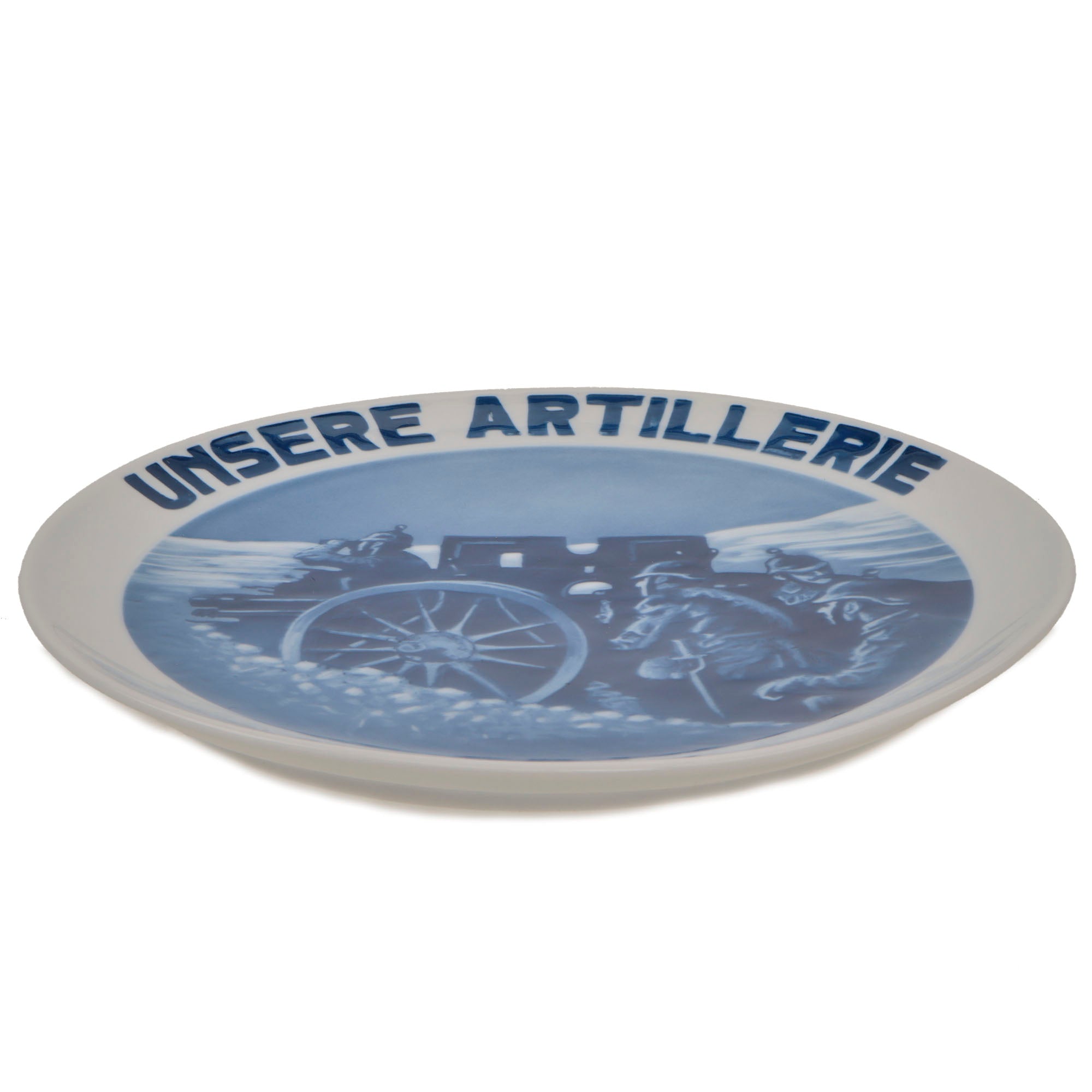 Original Item. Only One Available. This is a tremendous display piece, a 9 1/2” diameter ceramic wall plate depicting four German soldiers manning a large field artillery piece. The depiction is surrounded by the text Unsere Artillerie / 1914 which translates to Our Artillery.