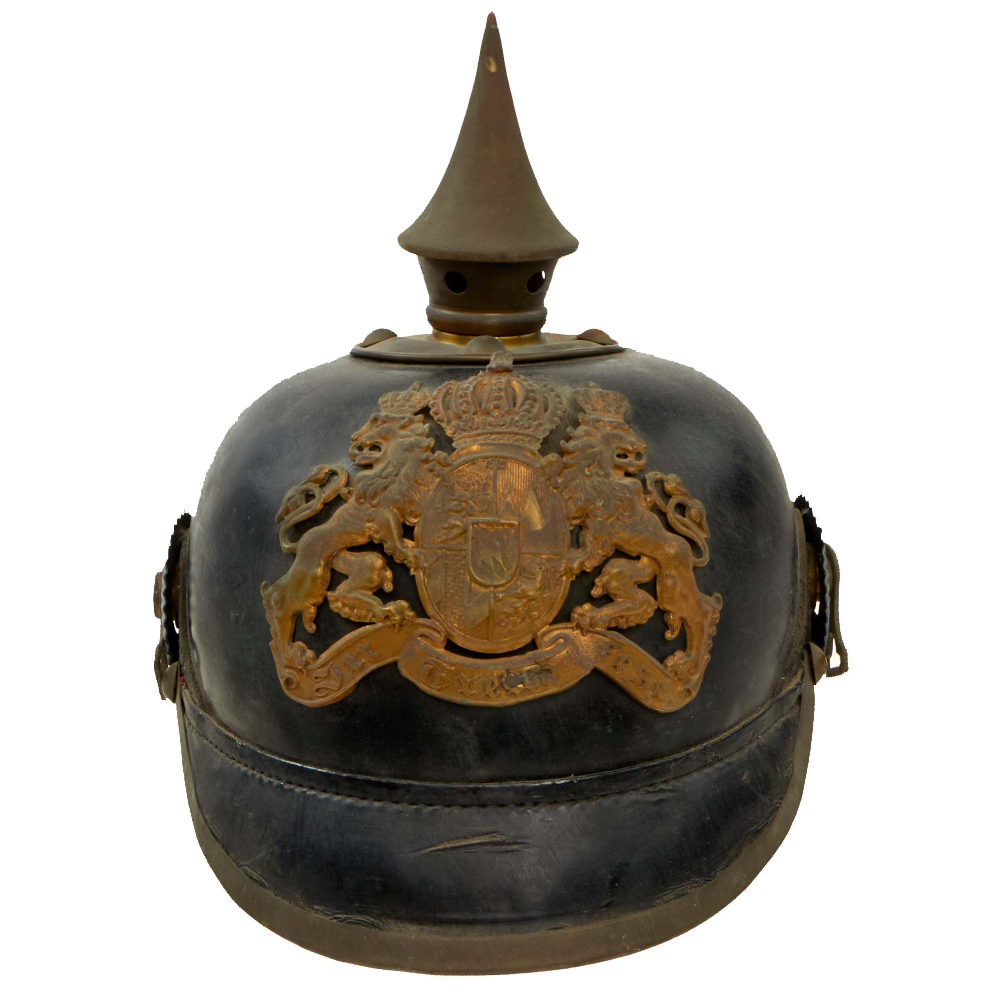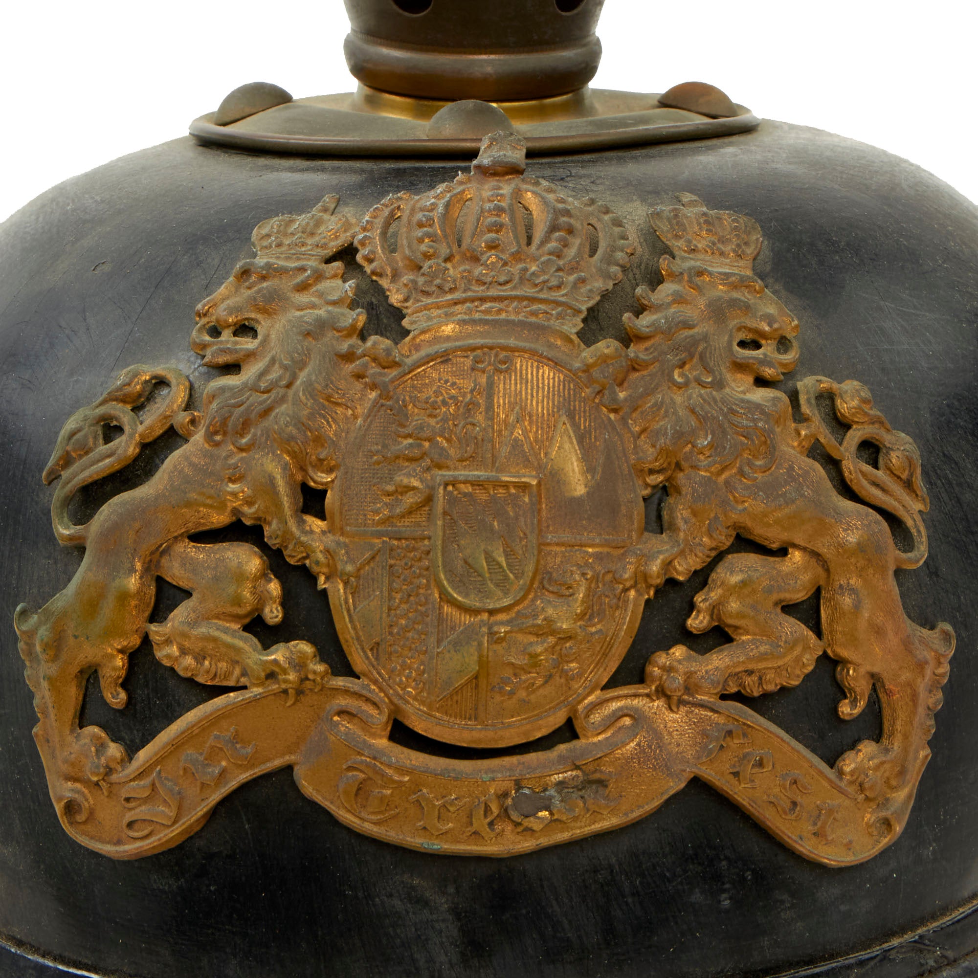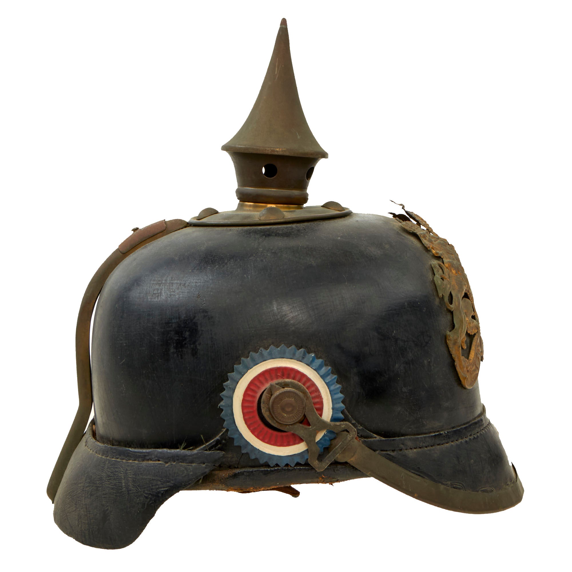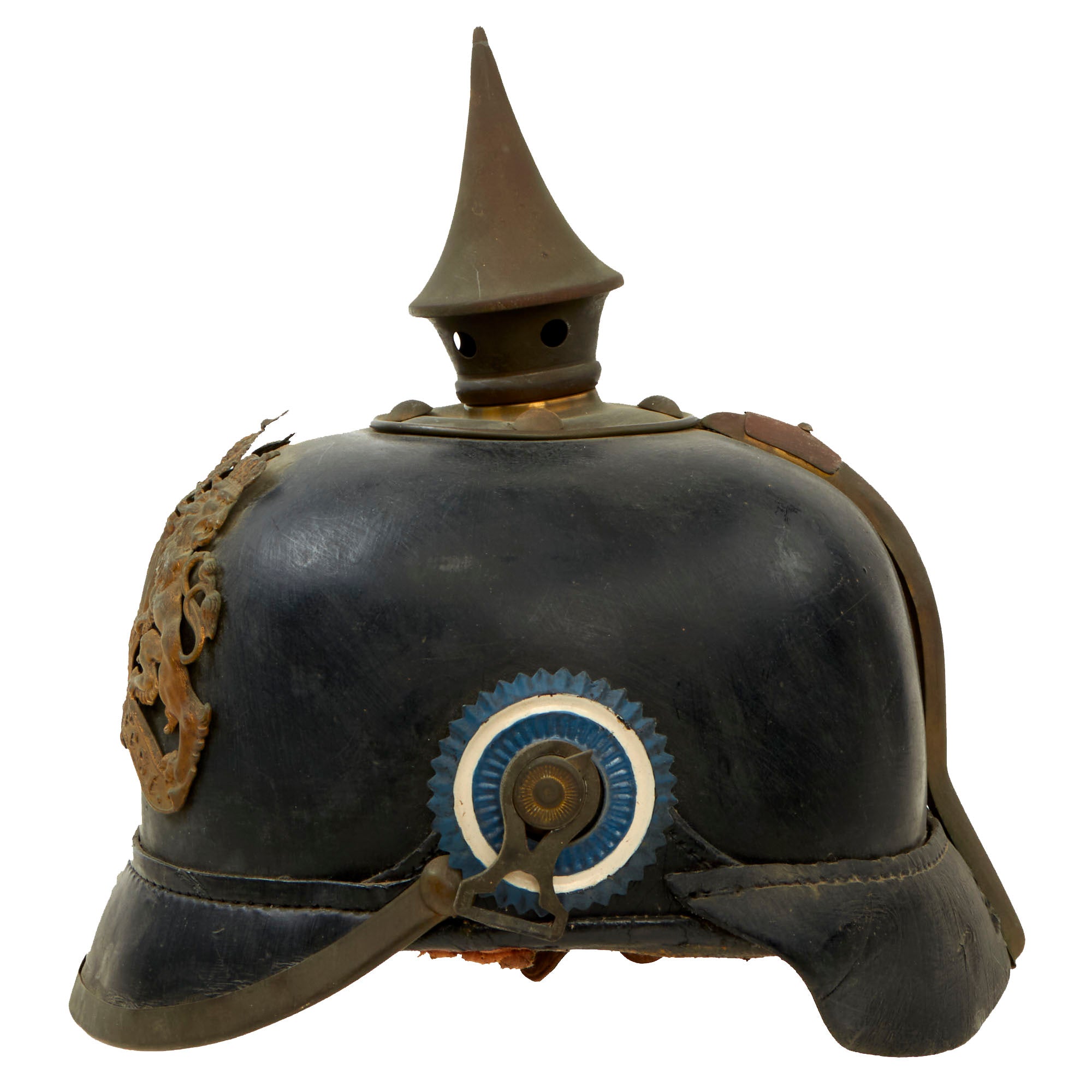 The crown of this leather helmet displays a brass vented enlisted spike mount on a brass baseplate. The spike is in good condition, and as per the pattern, is fixed and does not rotate. It is complete with two cockades which we believe to have been added for display. The cockades present are the Schwarzburg-Rudolstadt blue and white what appears to be an improperly painted Bayern cockade.