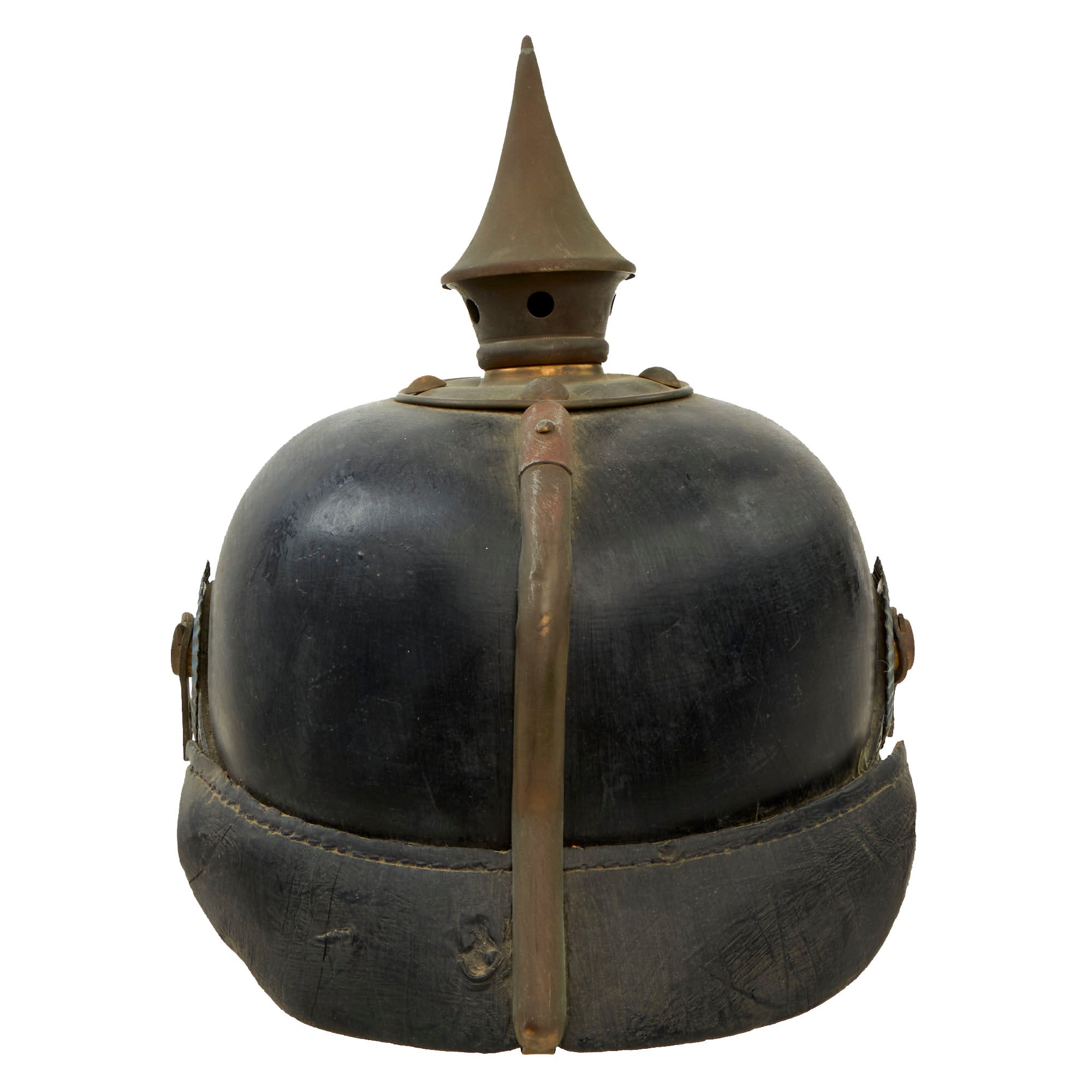 The front leather visor has brass trim in good condition but “wavy” in appearance, and the metal spine that descends from the spike's baseplate to the edge of the rear visor is also in good condition but does have waving and a bend present. The rear visor unfortunately has extensive stitching loss and is mostly held on by the brass spine.