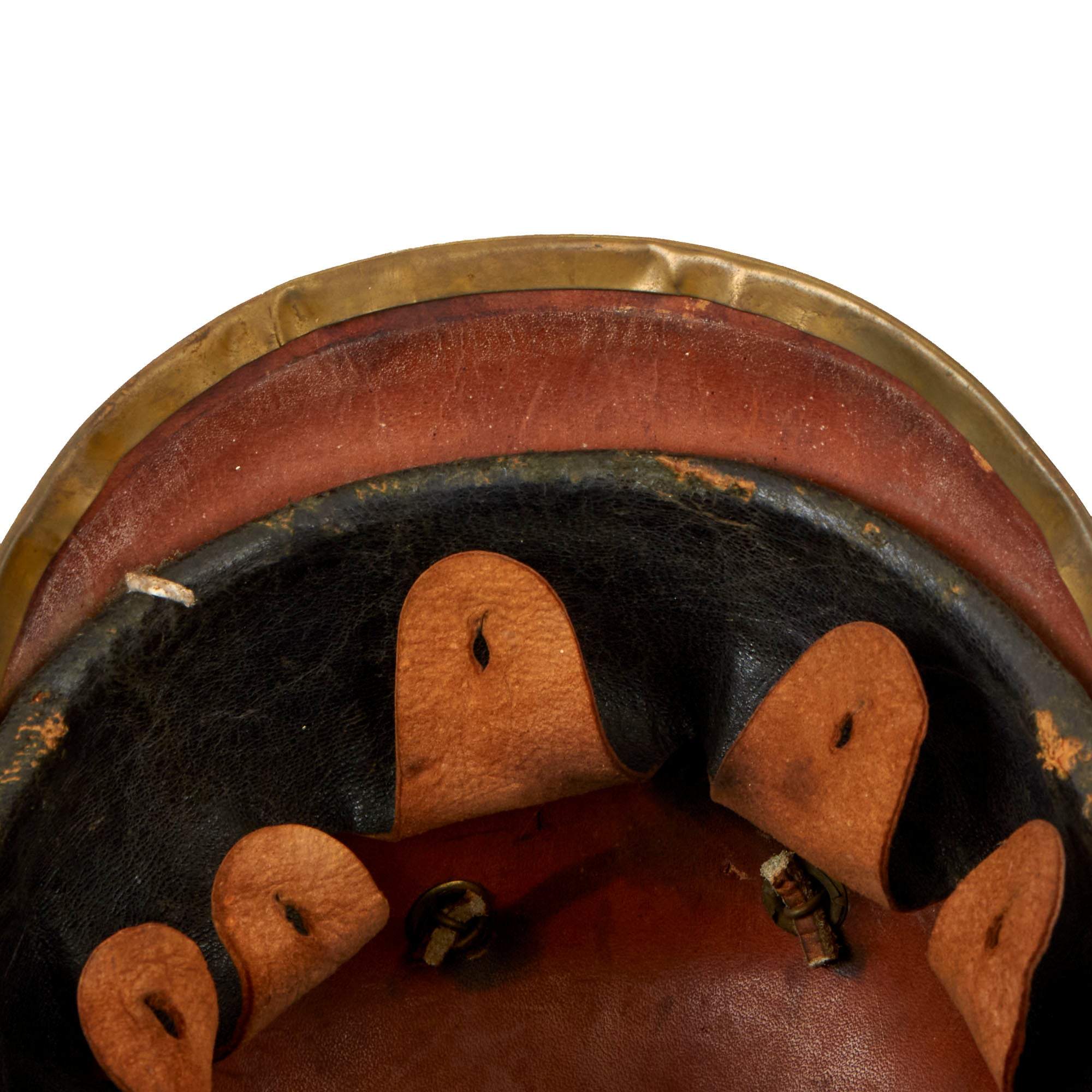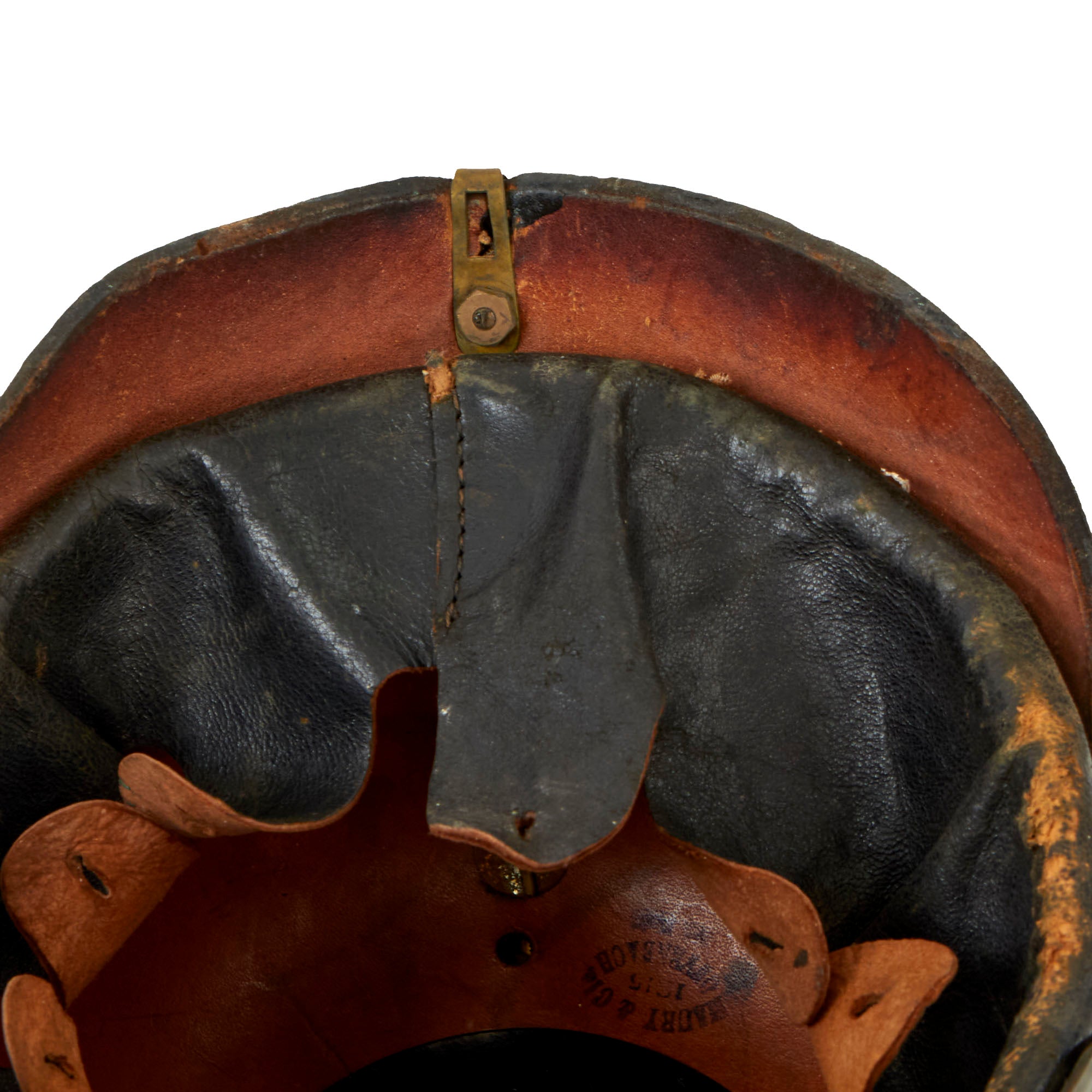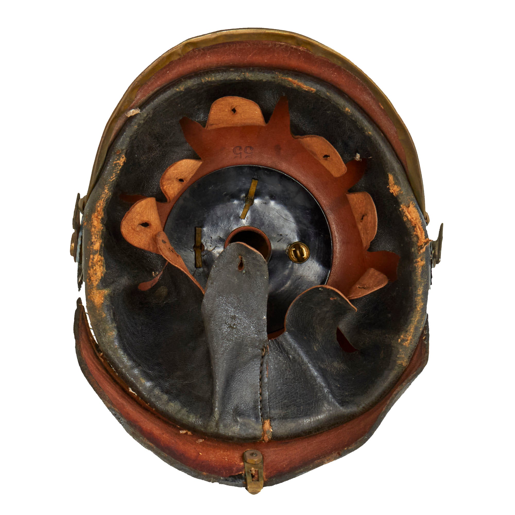 The lacquer finished leather is in very good condition having no serious issues, just the usual cracking and finish crazing due to age. There is also definitely some level of leather shrinkage due to age, which is why some fittings are somewhat loose. The interior features a nice original leather liner, with the expected wear from age as well as some tearing. The chin strap is no longer attached or intact but is included. It has the correct brass buckles.