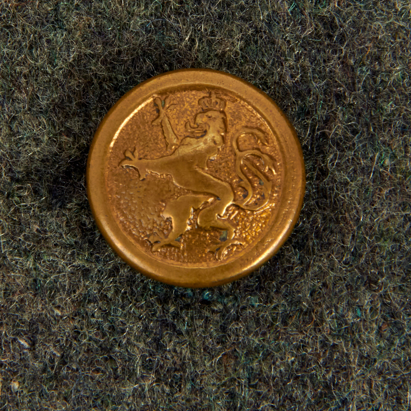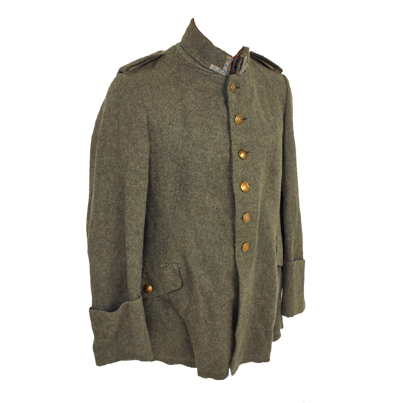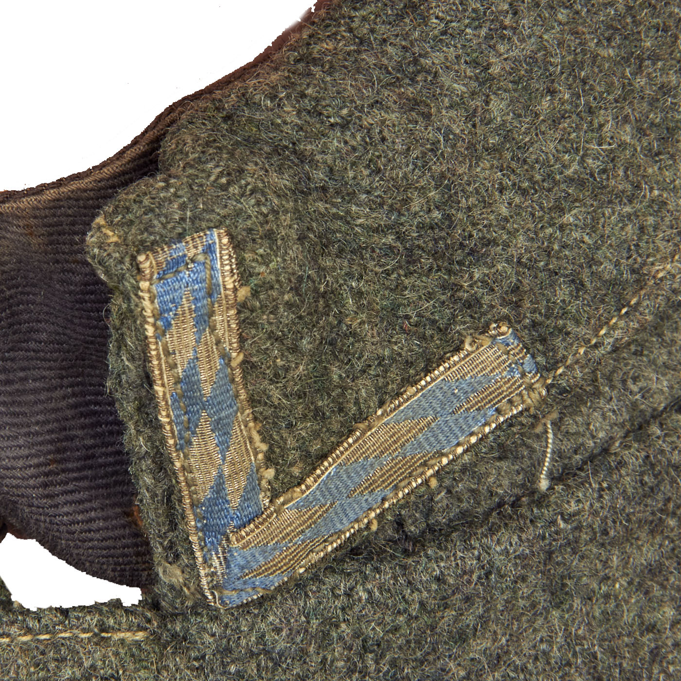 This is a very nice example of an Imperial German M1907/10 Feldbluse Tunic, as issued by the Kindgom of Bavaria. Of all the states of the German Empire, Bavaria retained the most autonomy regarding uniforms and regimental designations. The tunic has the "Argent and Azure" (White and Blue) checkerboard trim on the front of the color, and the buttons are all the Bavarian "Two Tailed Crowned Lion".