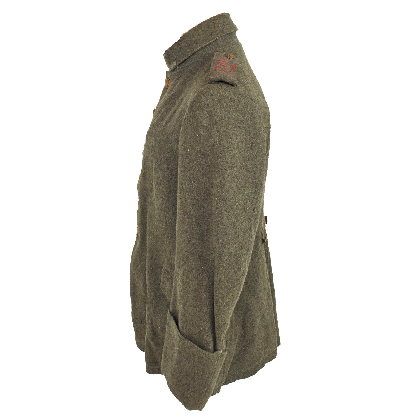 The schulterklappen (shoulder straps) are the same field gray color as the rest of the uniform, without any piping, and each has a red chainstitched number 37 on it. We unfortunately have not been able to identify which exact unit they are from. Definitely some nice research potential here, as German WWI unit designations can often be very difficult to determine.