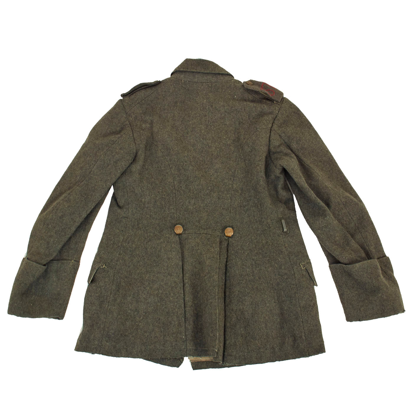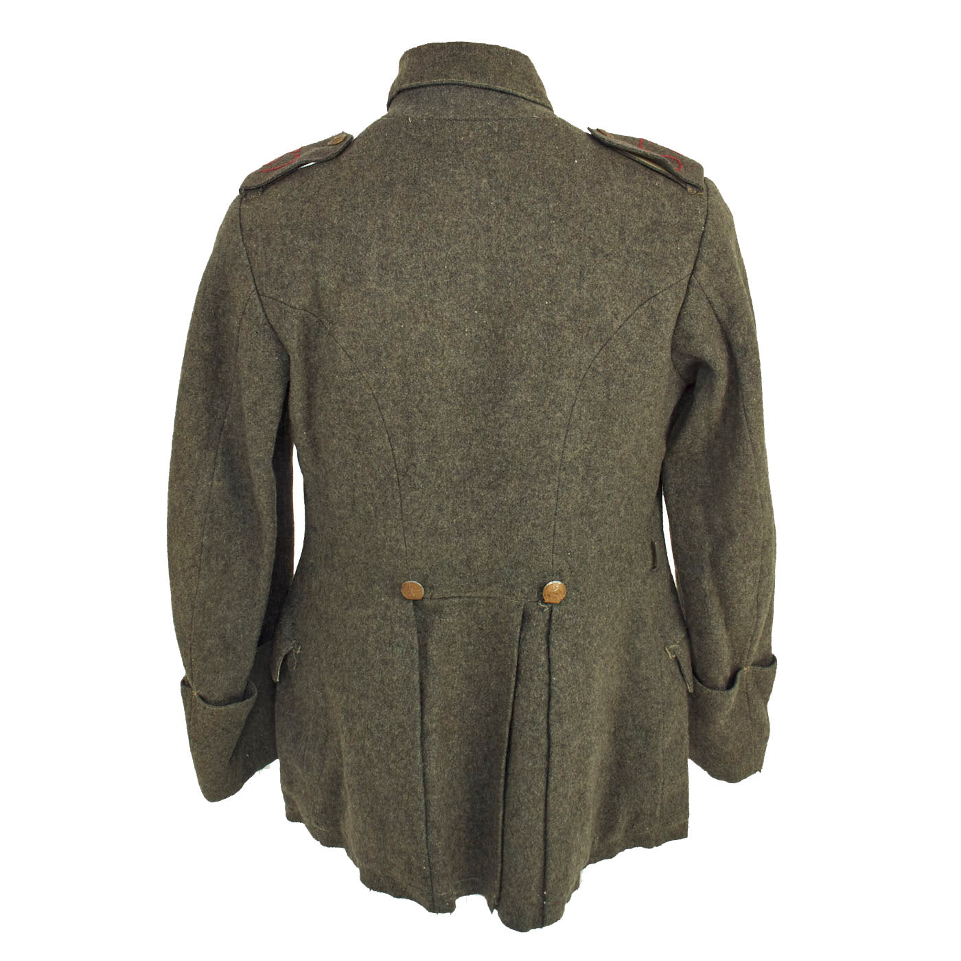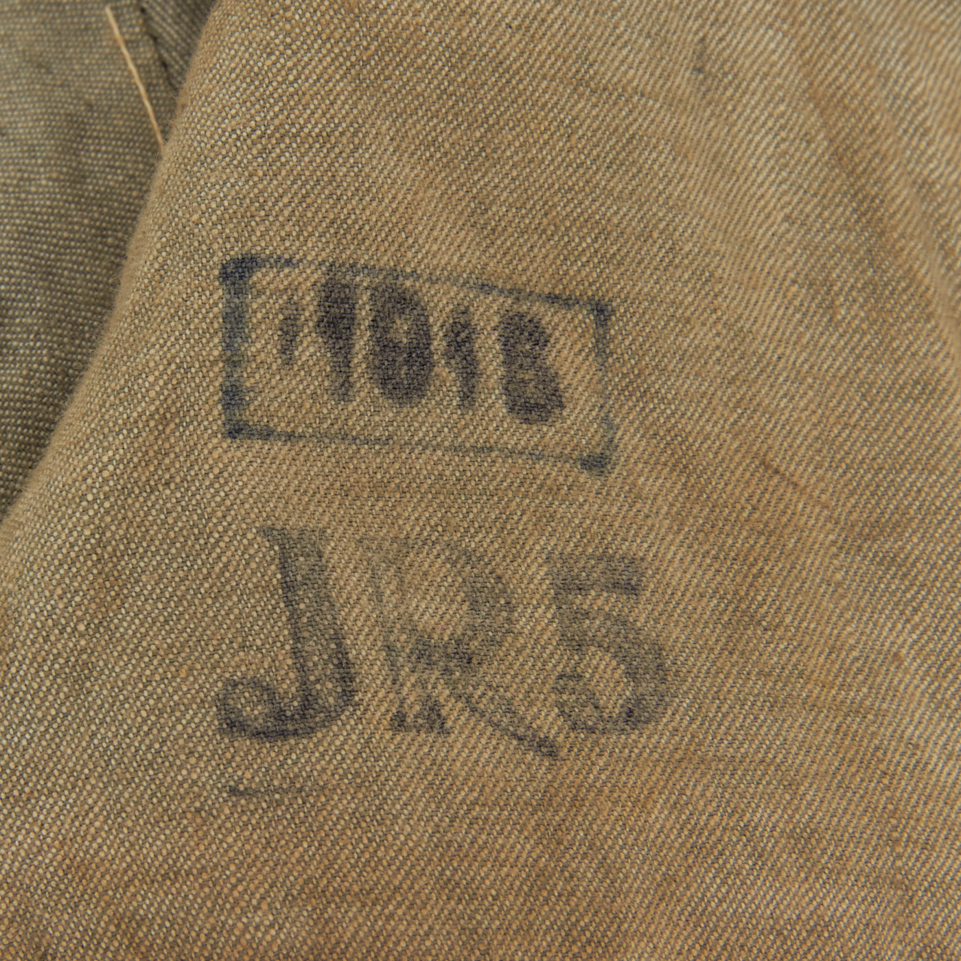 The tunic features a 6 button front closure, with three hook and loop fasteners for the collar. The rear has a vent in the seat with two buttons at the top, and there are two pockets low on the front side. The ends of the sleeves feature long French cuffs, without any button closure. The interior is lined with off white fabric, and the left interior is stamped with a 1916 date over JR5, which would usually stand for the 5th Infantry Regiment. Under these are are most likely the measurements of the tunic: