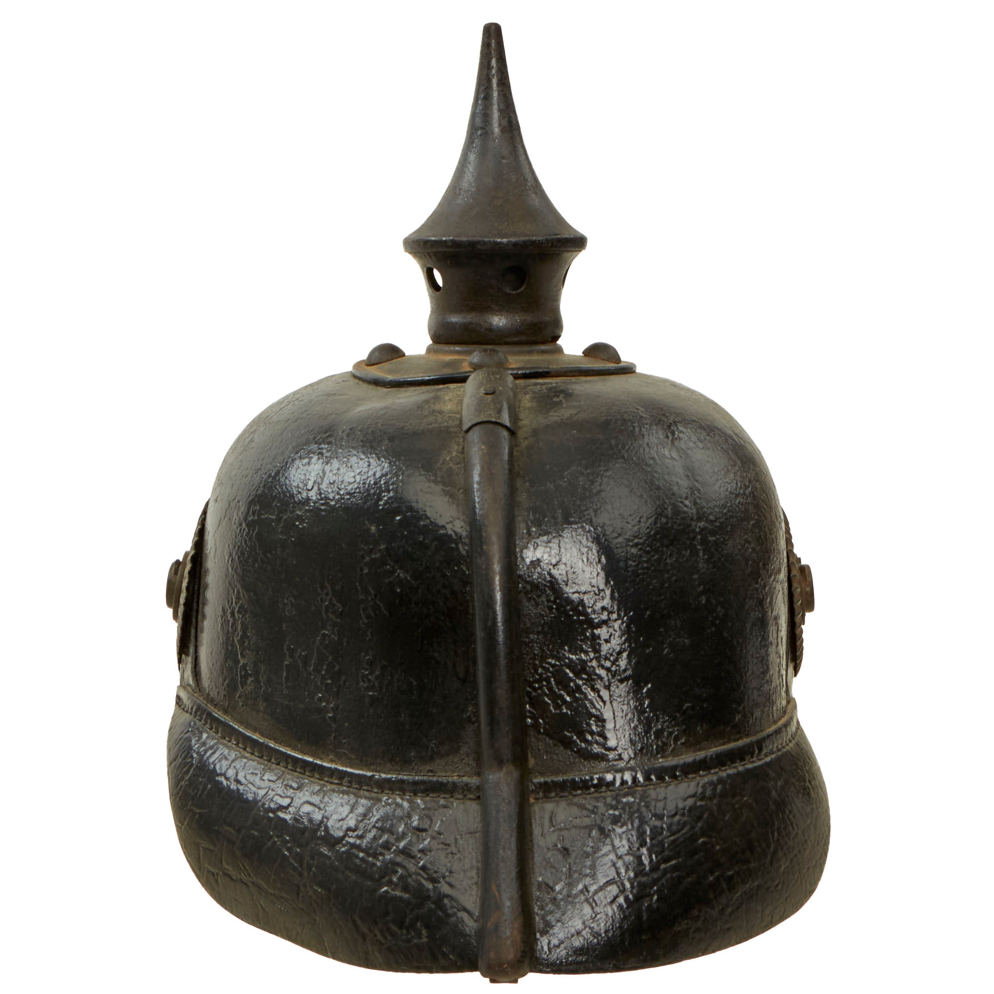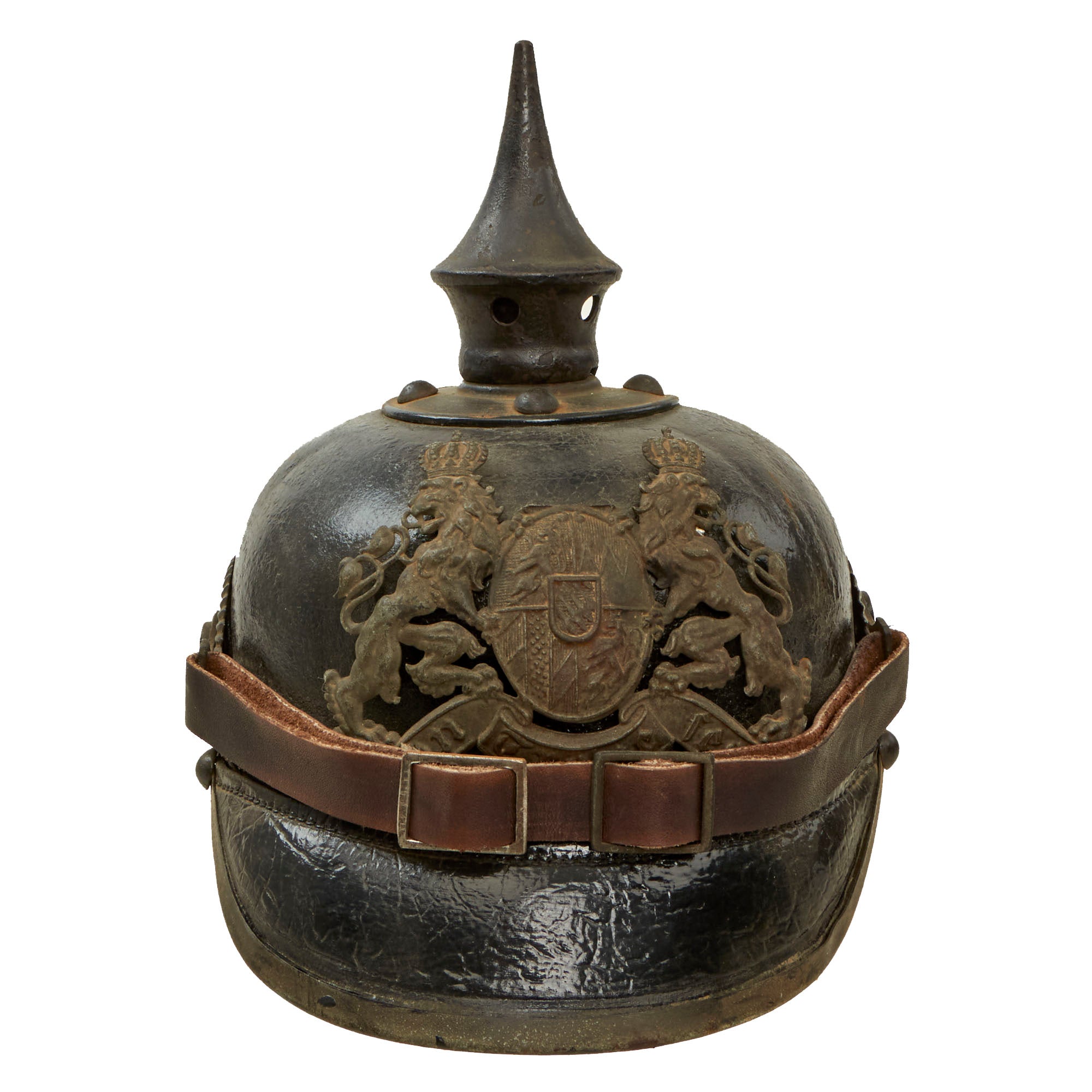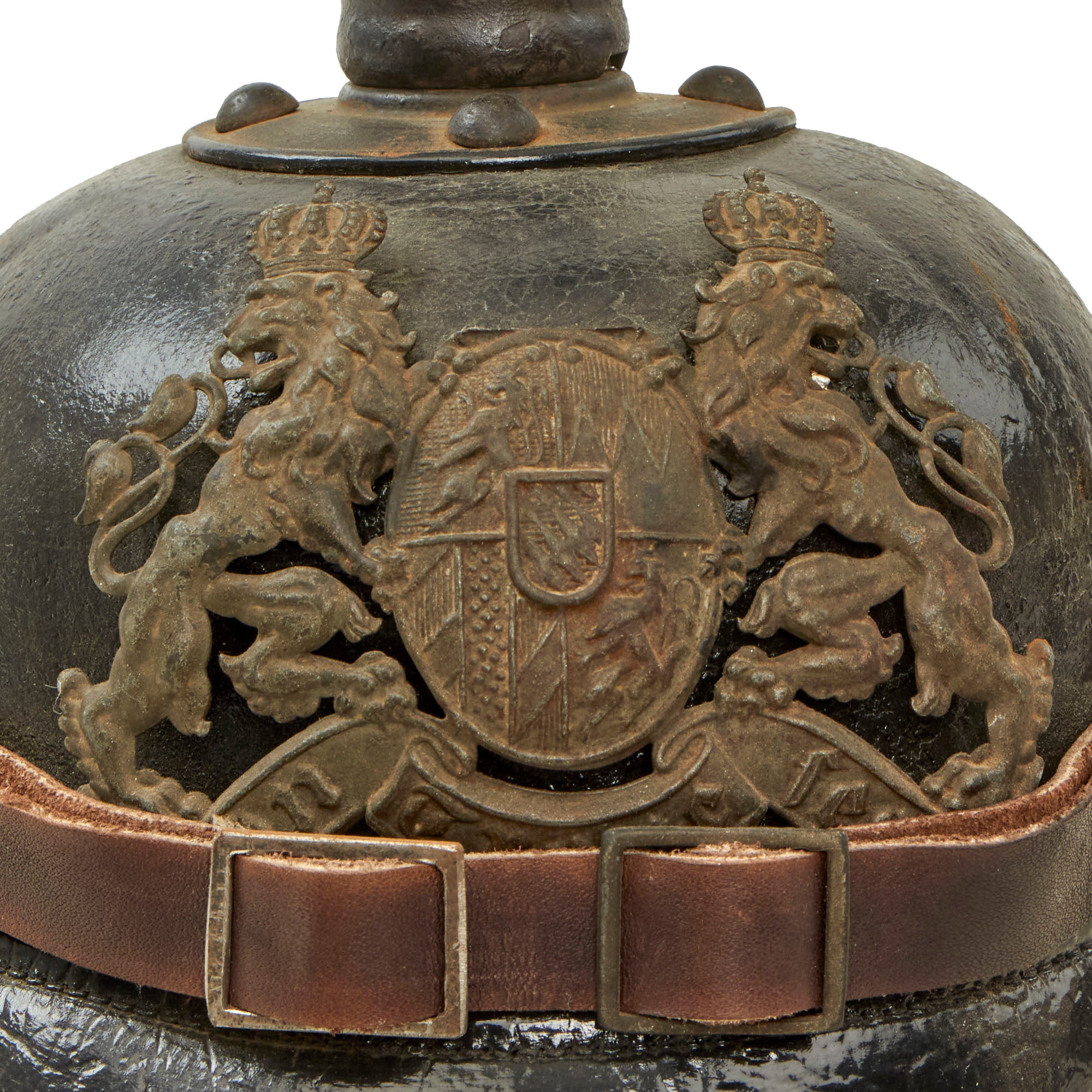 Original Item: Only One Available. This is a wonderful service-used example of an M-1915 Imperial Bavarian Line Infantry Mannschaften (other ranks or EM / NCO) pickelhaube in good condition. The M1915 was the last model of Pickelhaube issued prior to the move to steel helmets. In accordance with the 1915 regulations, these helmets would no longer use brass, silver, or Tombak as the M1895 did. All issued Pickelhaube would now use gray oxidized steel fittings for all Regiments. As with previous versions, the body was constructed from boiled leather, which was shaped and lacquered black.