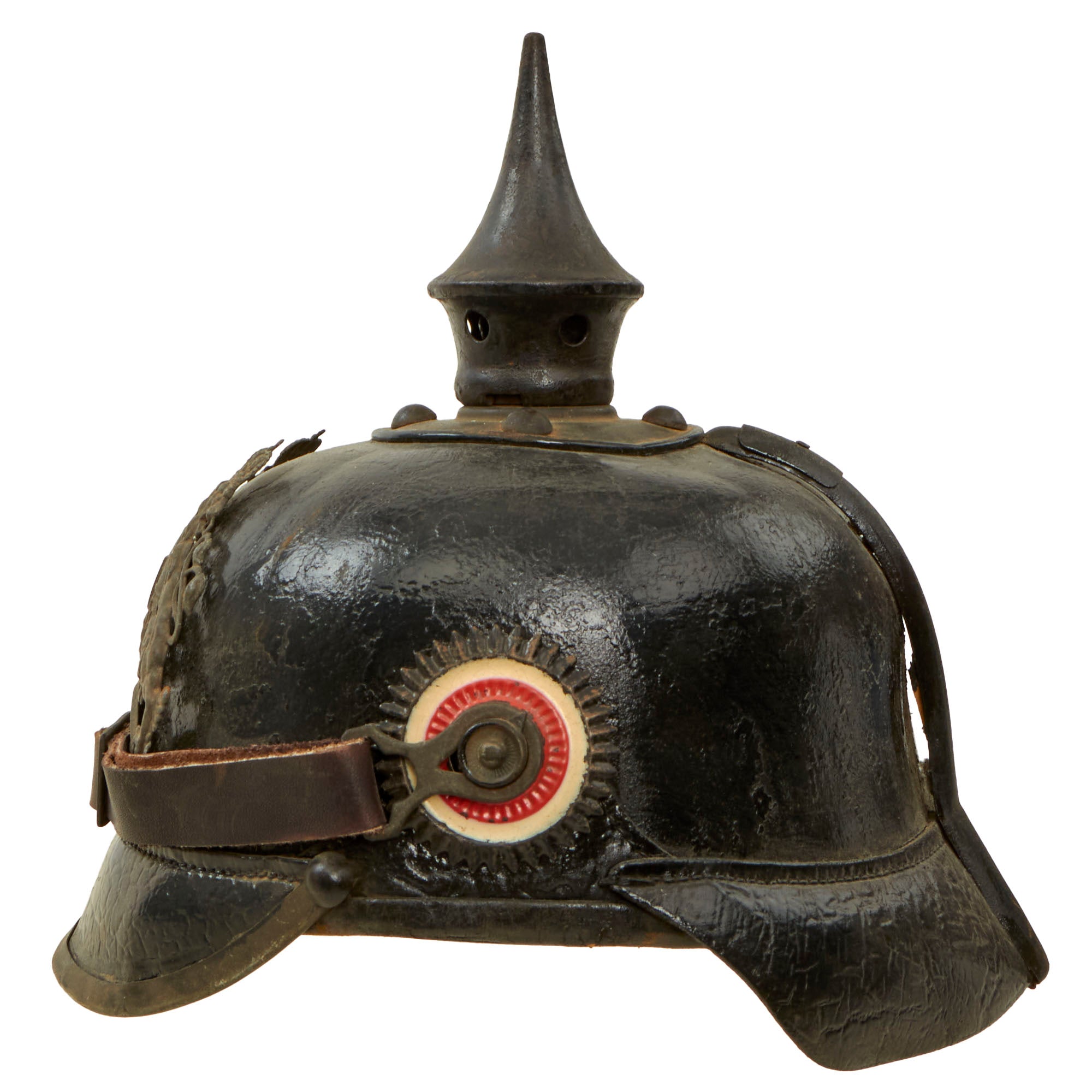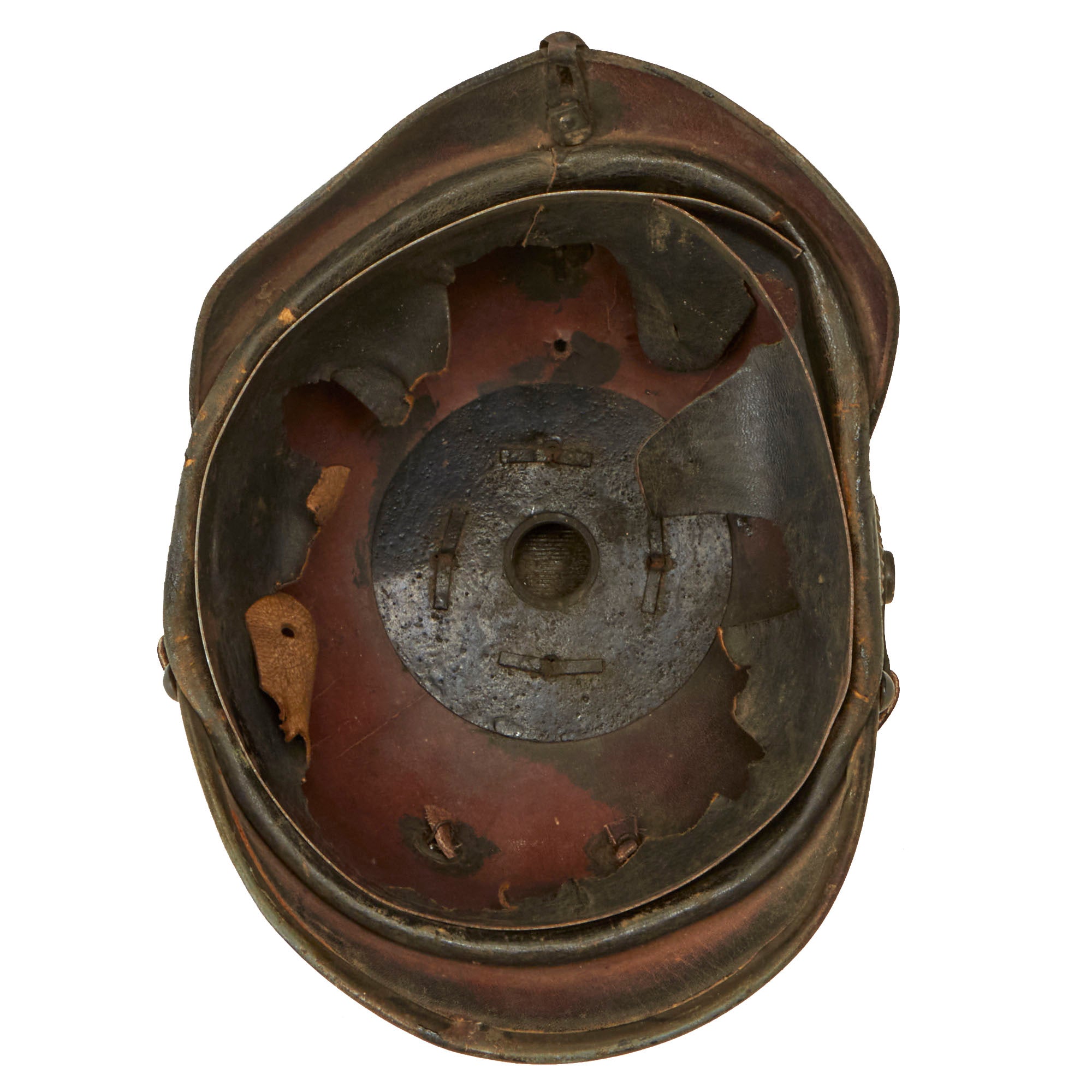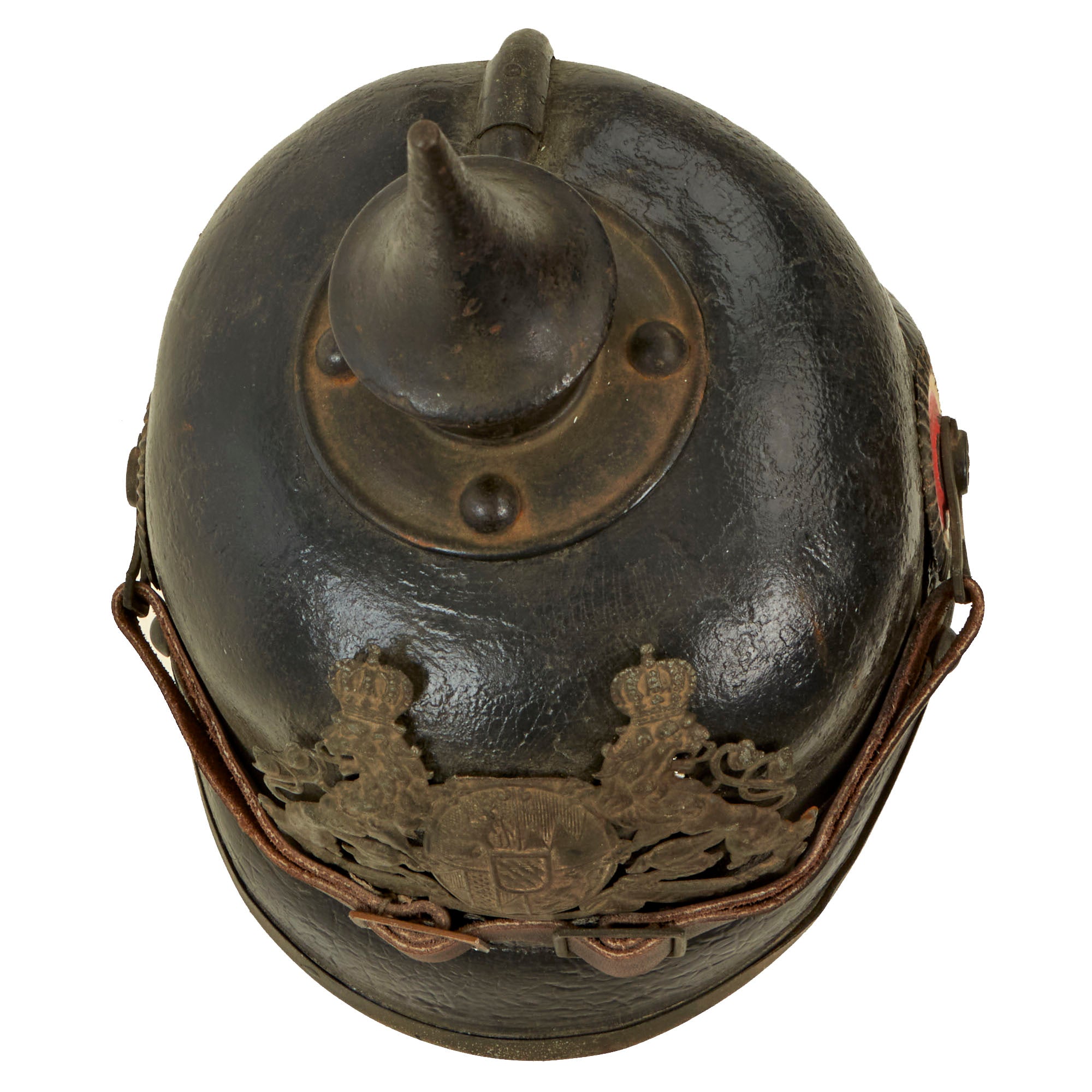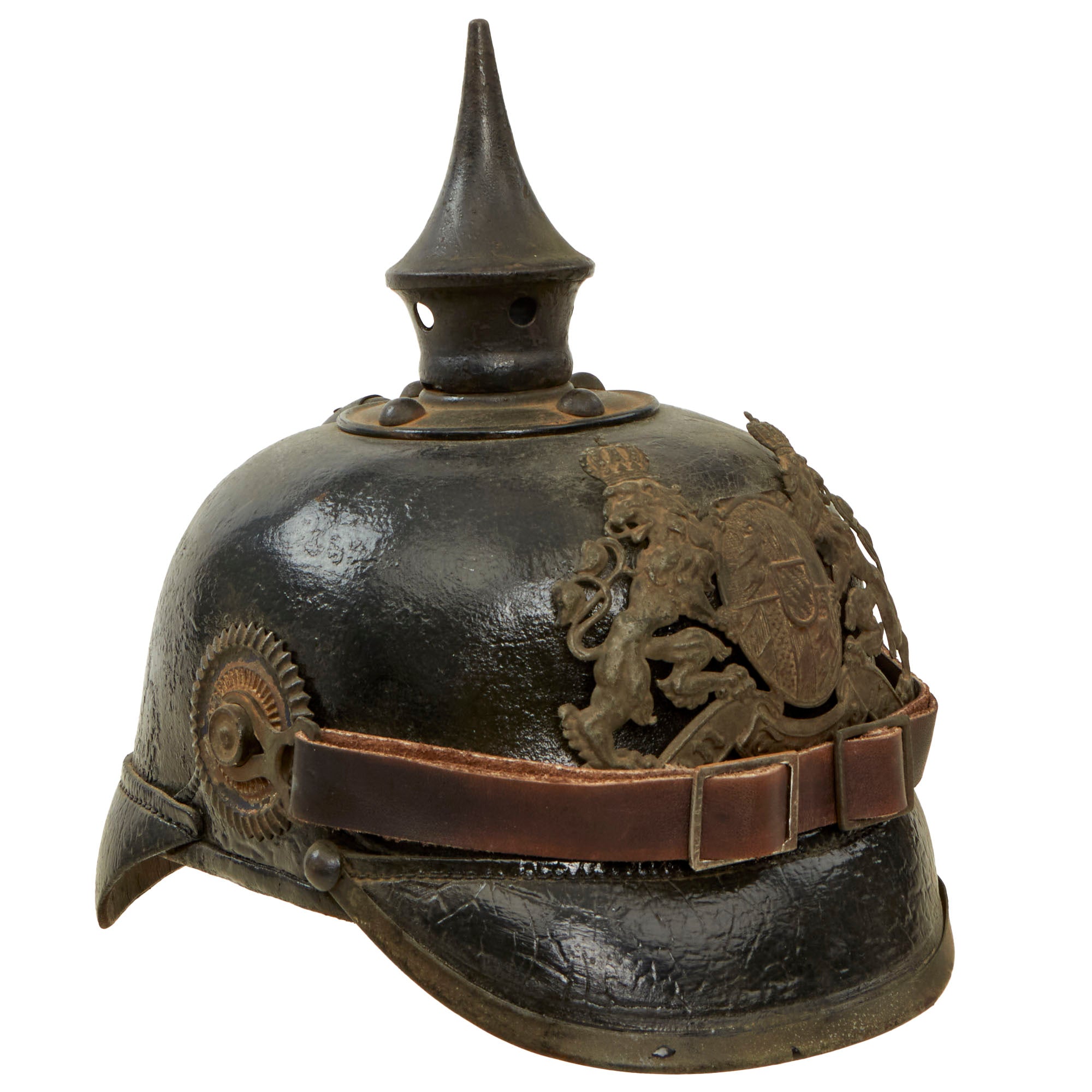 Original Item: Only One Available. This is a wonderful service-used example of an M-1915 Imperial Bavarian Line Infantry Mannschaften (other ranks or EM / NCO) pickelhaube in good condition. The M1915 was the last model of Pickelhaube issued prior to the move to steel helmets. In accordance with the 1915 regulations, these helmets would no longer use brass, silver, or Tombak as the M1895 did. All issued Pickelhaube would now use gray oxidized steel fittings for all Regiments. As with previous versions, the body was constructed from boiled leather, which was shaped and lacquered black.