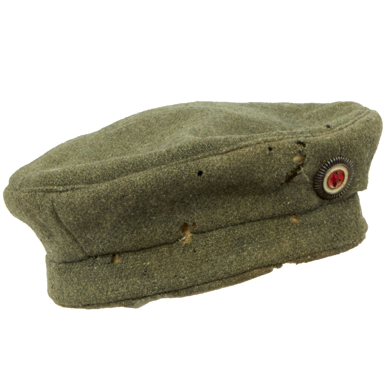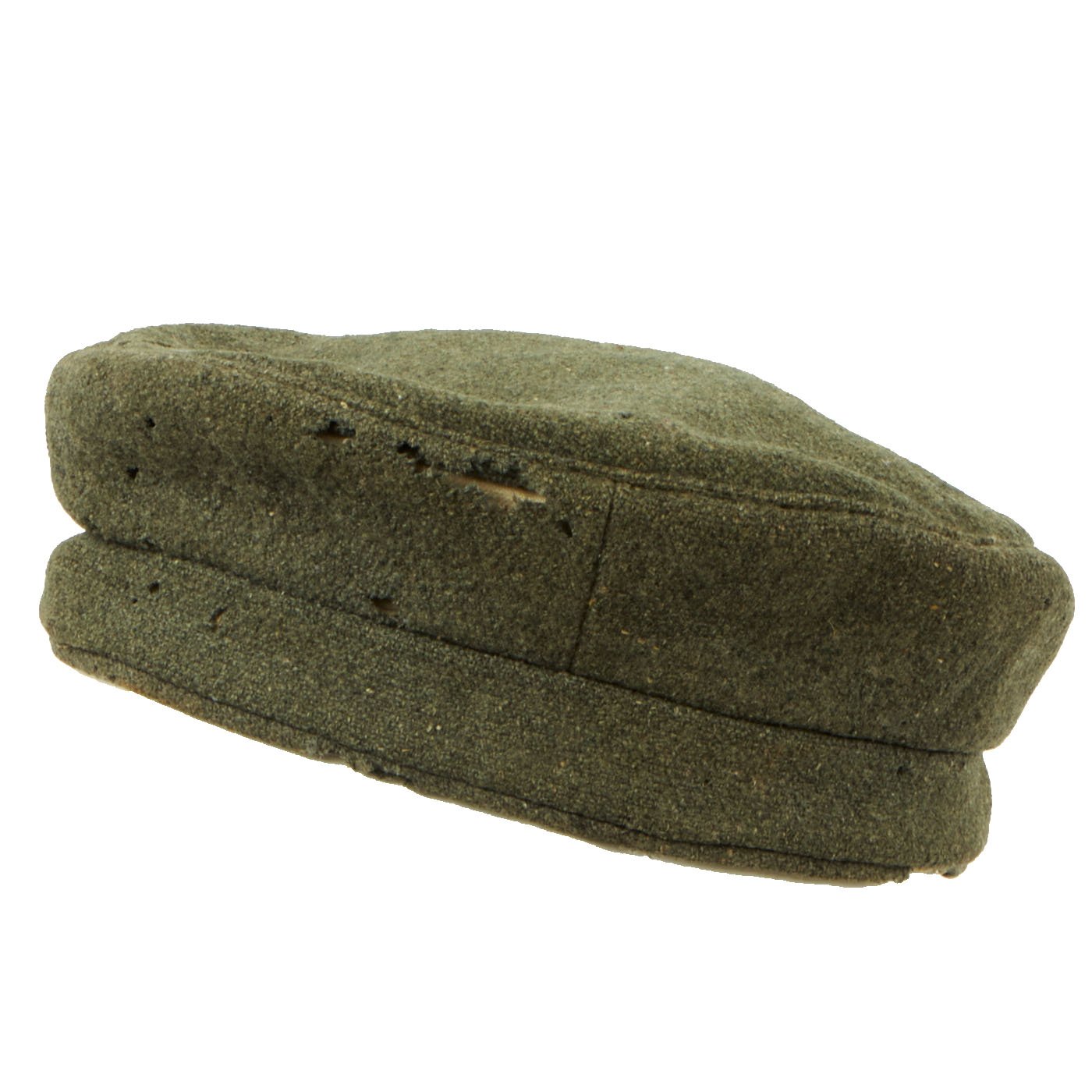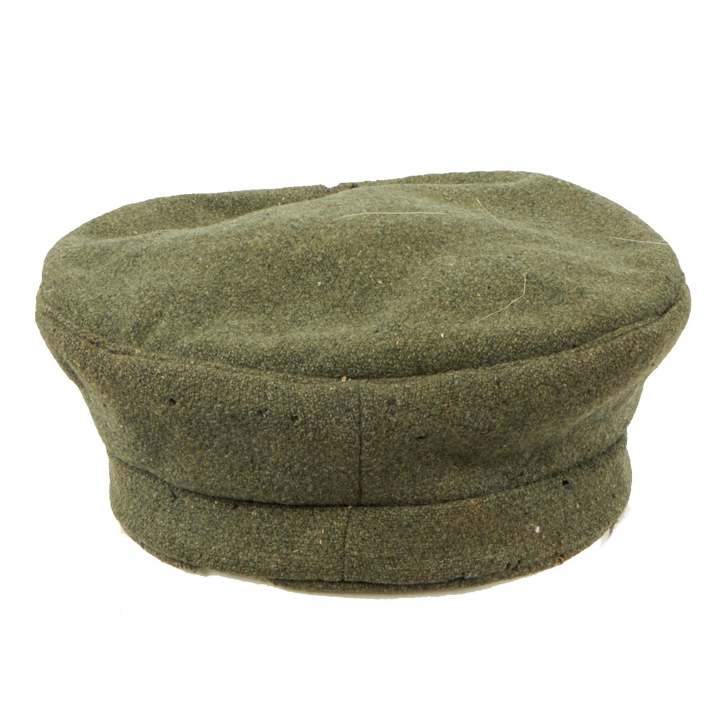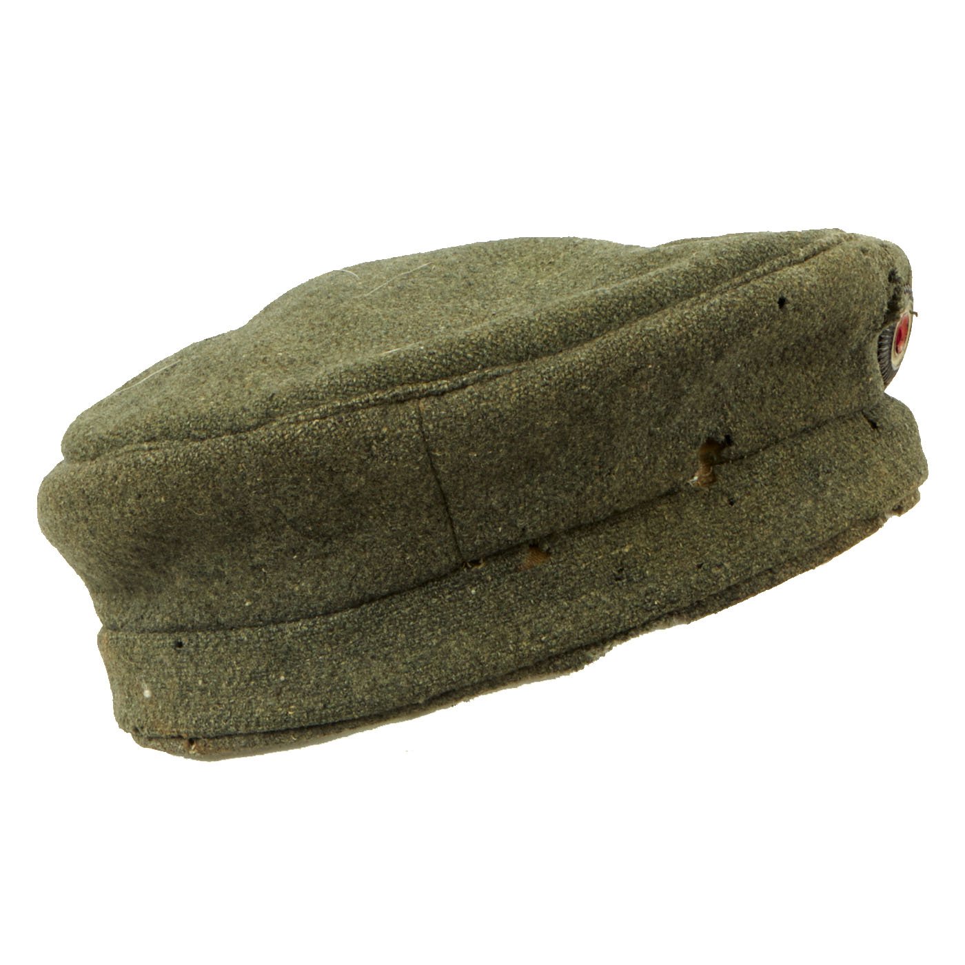 Original Item: Only one available. This is a scarce example of the classic Great War Imperial German Field Cap (Feldmütze or Krätzche). It is a very late war example, made of course, cellulose (wood pulp) rich, ersatz Feldgrau wool. It is a Bavarian Model constructed solely of of grey/green "Feldgrau" wool, omitting the red band and trim, with an interior off-white linen lining. The front of the cap bears a Black, White and Red Reichskokarde (Imperial Cockade) on the front of the crown (appears to be resewn). The state cockade is unfortunately missing.