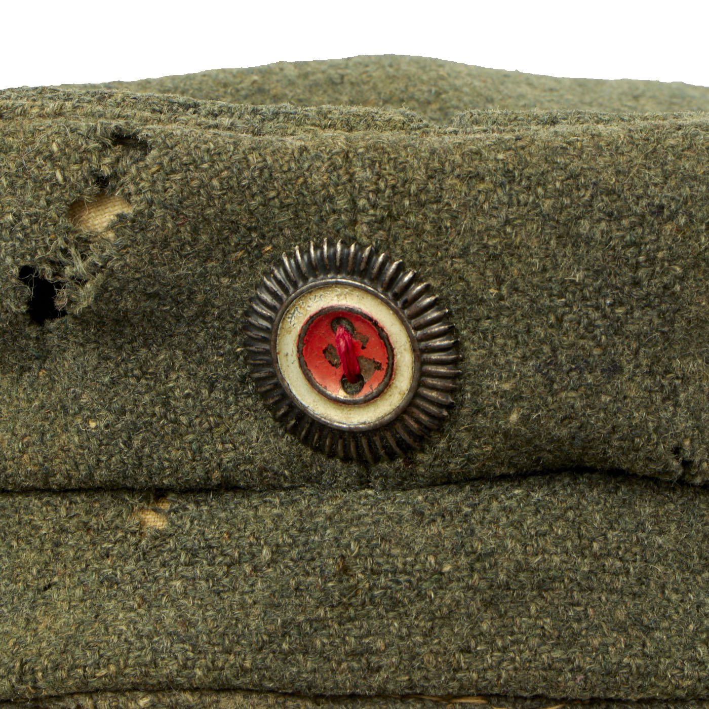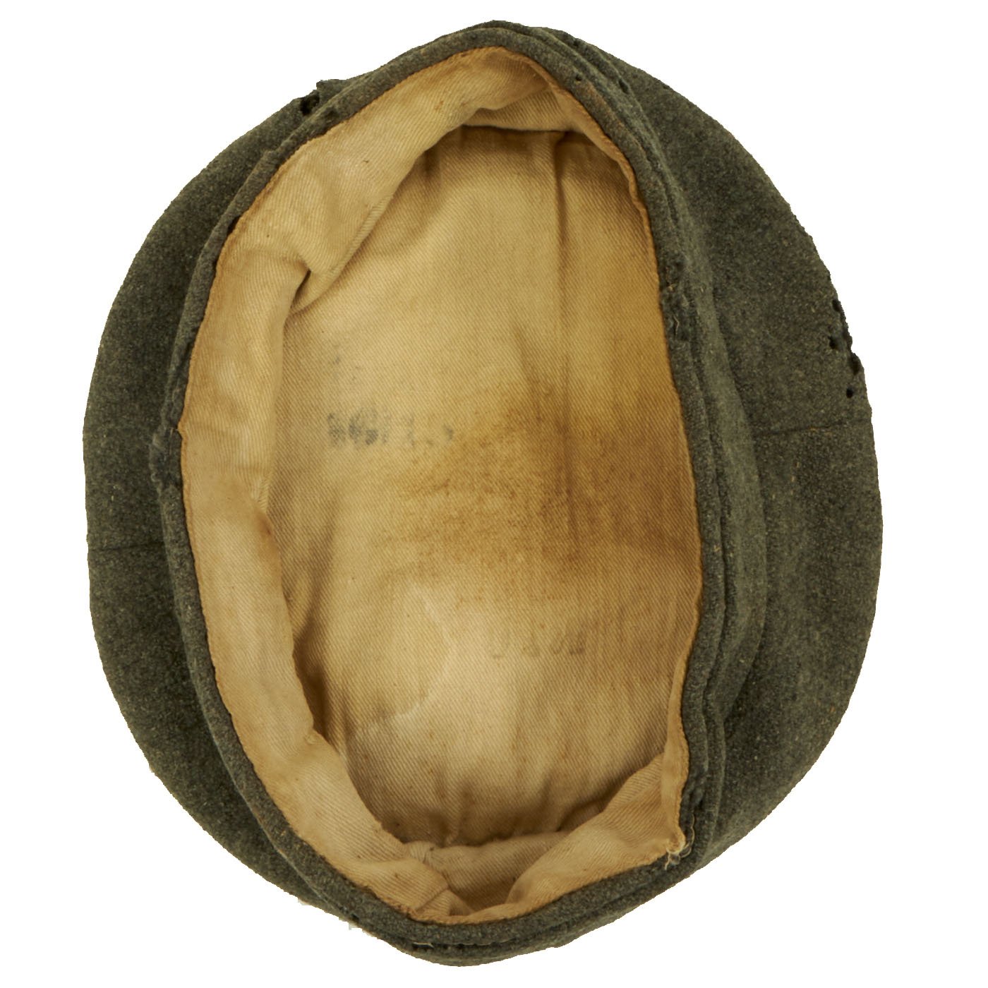 The cap is in very good used condition, with the expected wear and tear from having been through The Great War. There is some obvious moth damage, and slight discoloration, but it still presents very well. The interior lining is in very good shape, with a illegible faded depot stamp or possibly a regimental marking. Size is approximately US 7 (56cm).