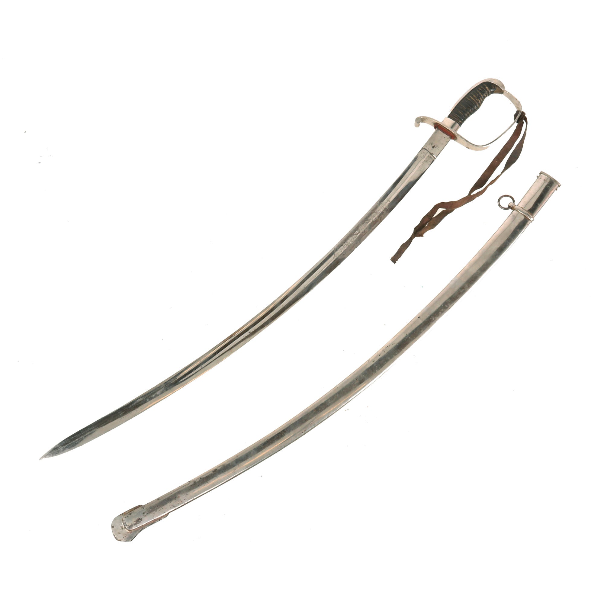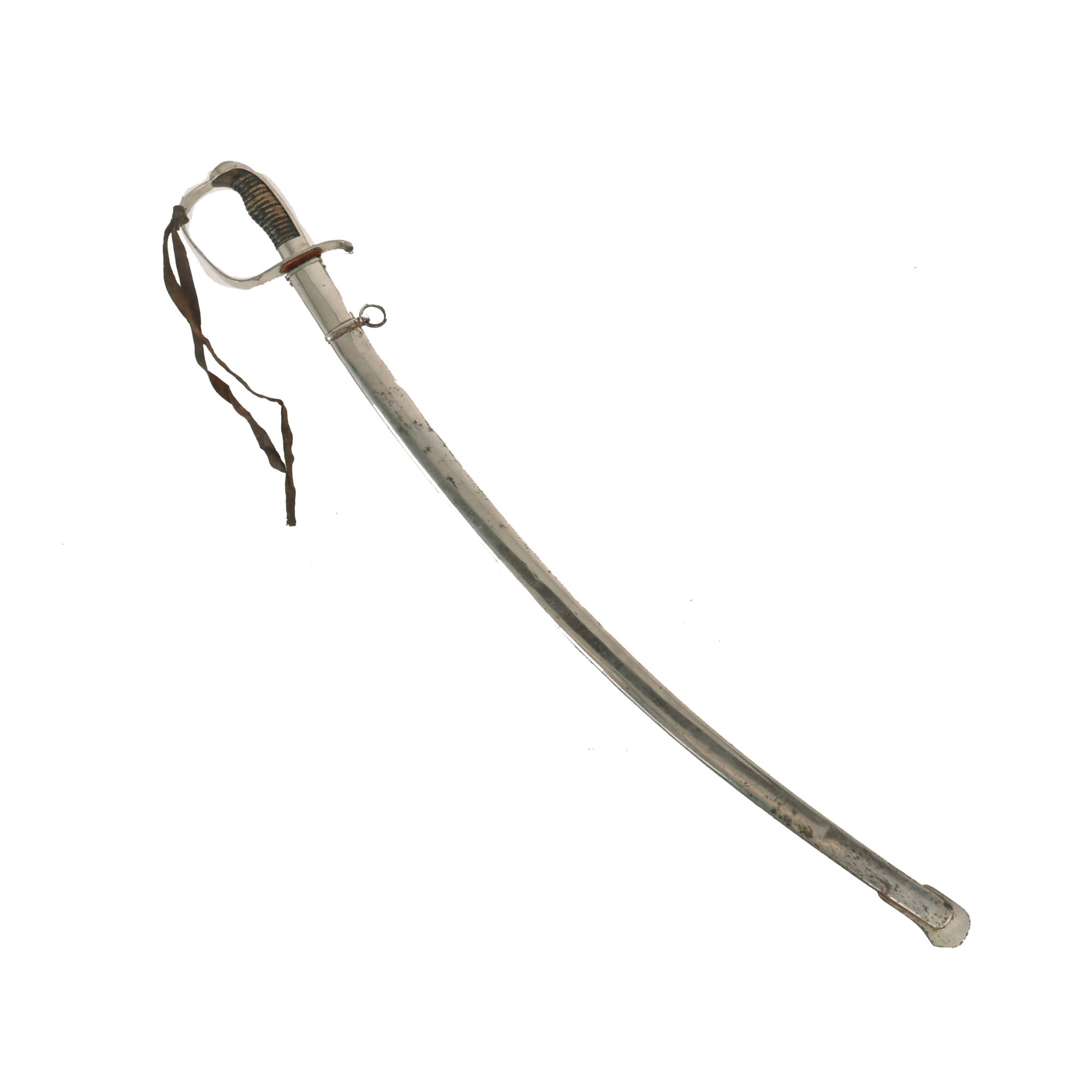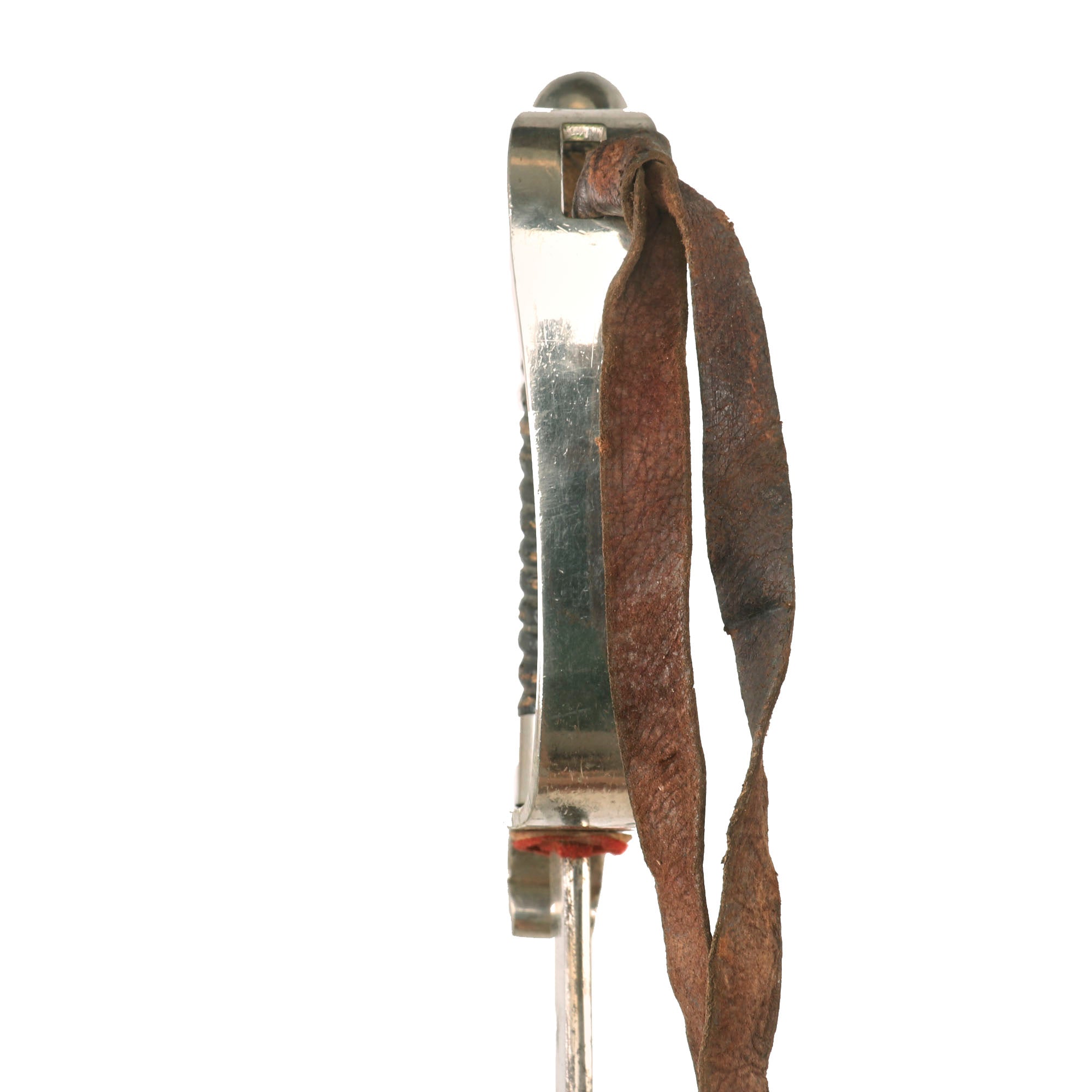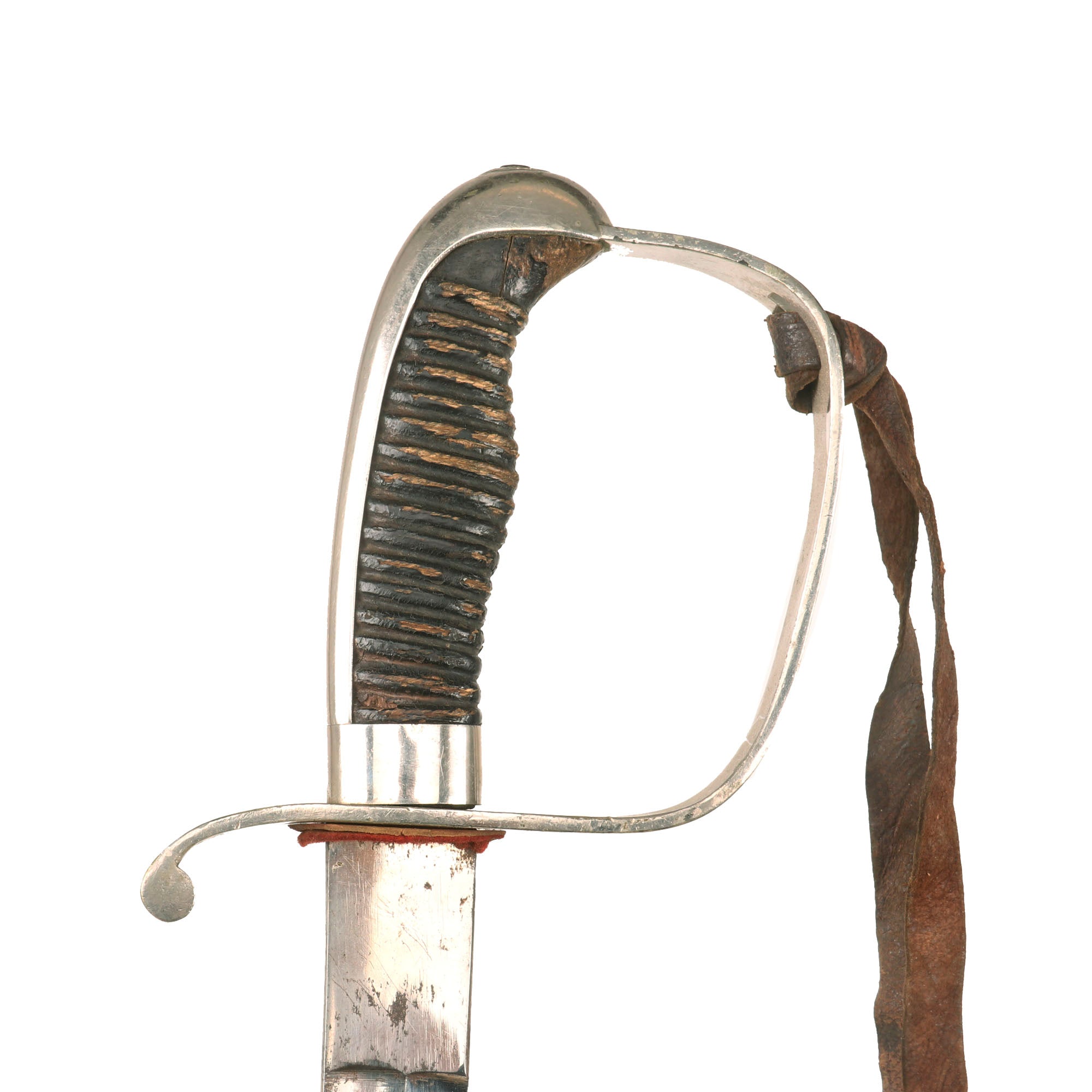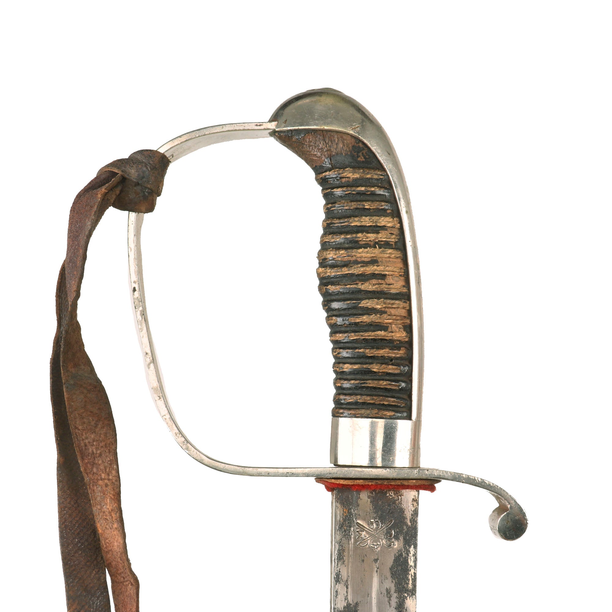 The hilt is also nickel-plated with a wrapped-wooden grip. The grip is in rough shape with much of the wrap gone. The plating is in great shape overall. There is a period leather strap hanging from the sword knot slit, so this may be part of an early sword knot or something else. The sword retains its original leather washer and the small red felt washer on top of that!