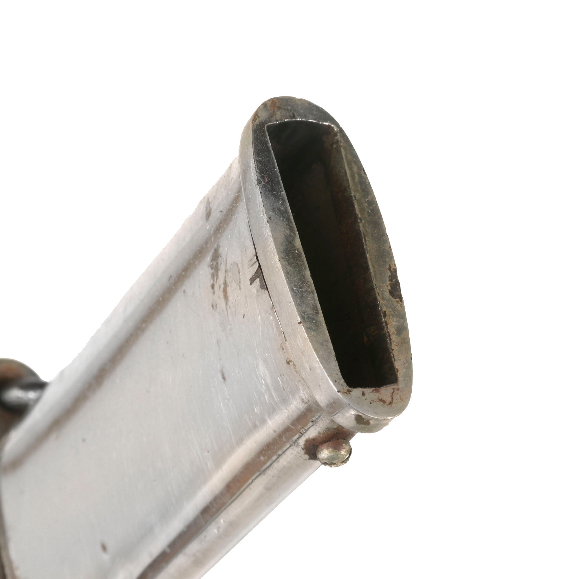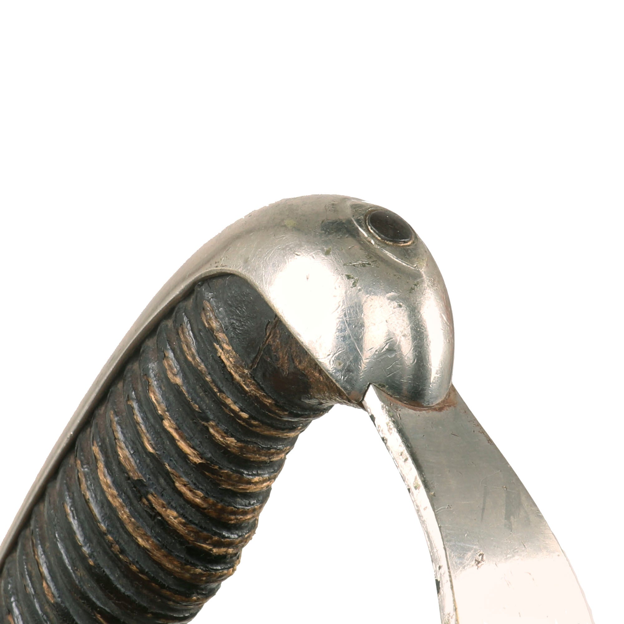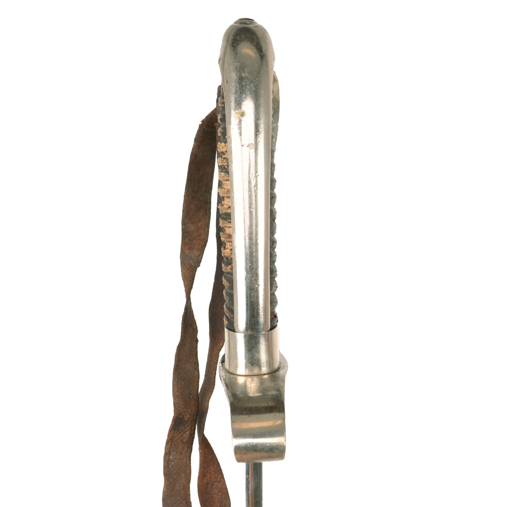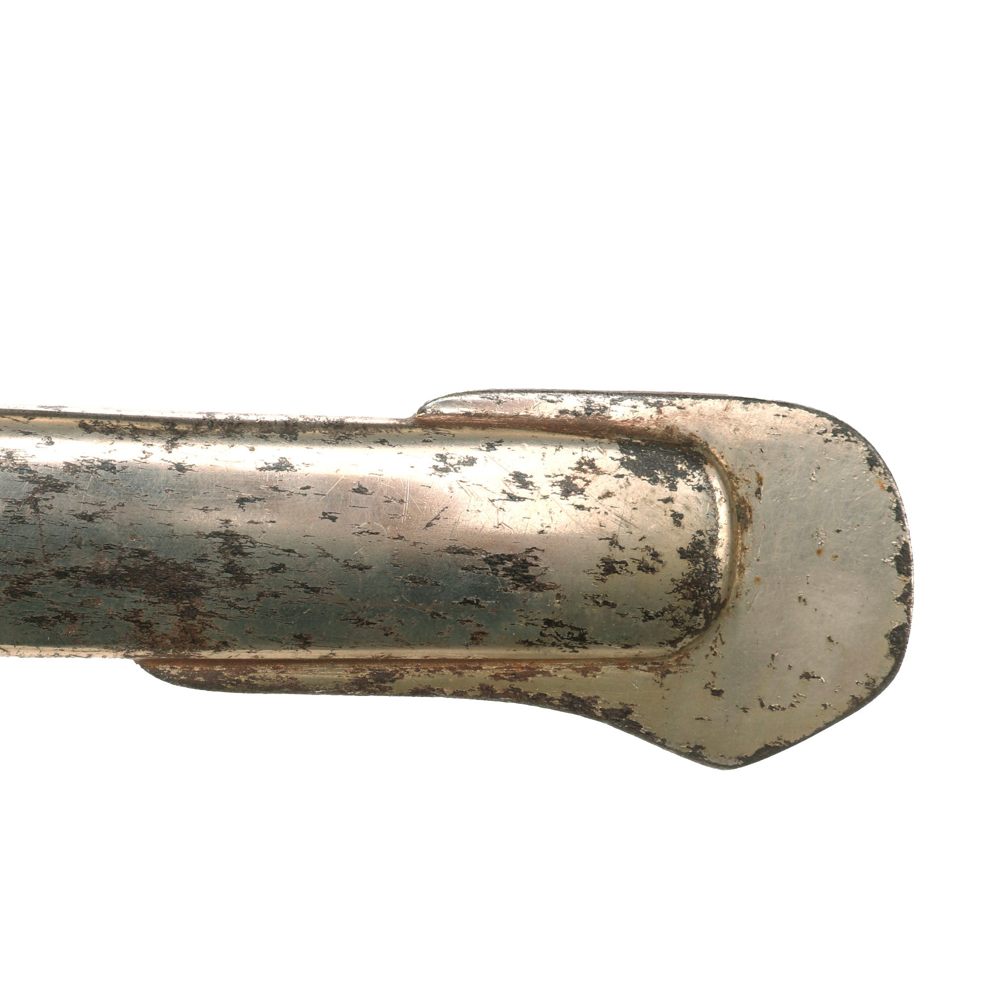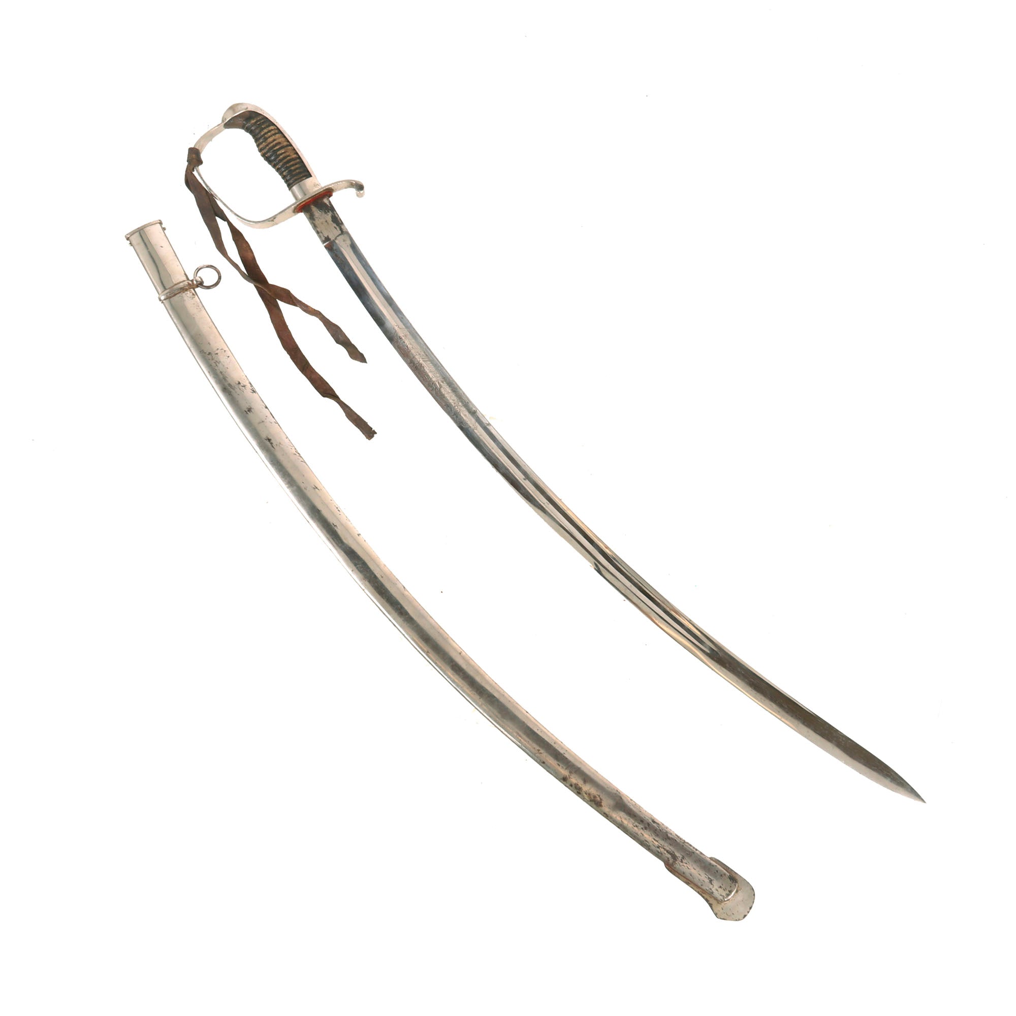 The hilt is also nickel-plated with a wrapped-wooden grip. The grip is in rough shape with much of the wrap gone. The plating is in great shape overall. There is a period leather strap hanging from the sword knot slit, so this may be part of an early sword knot or something else. The sword retains its original leather washer and the small red felt washer on top of that!