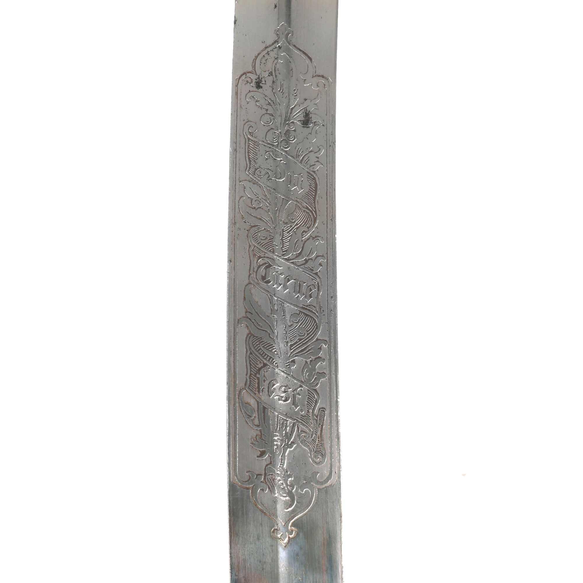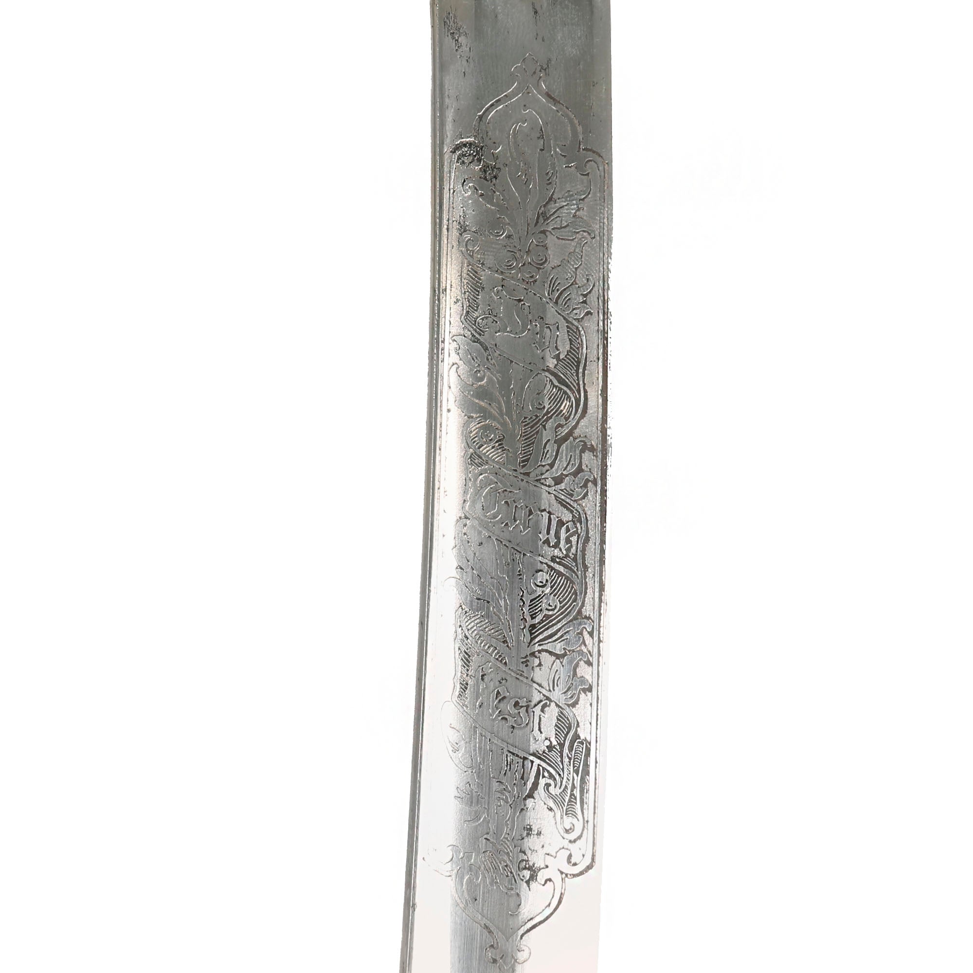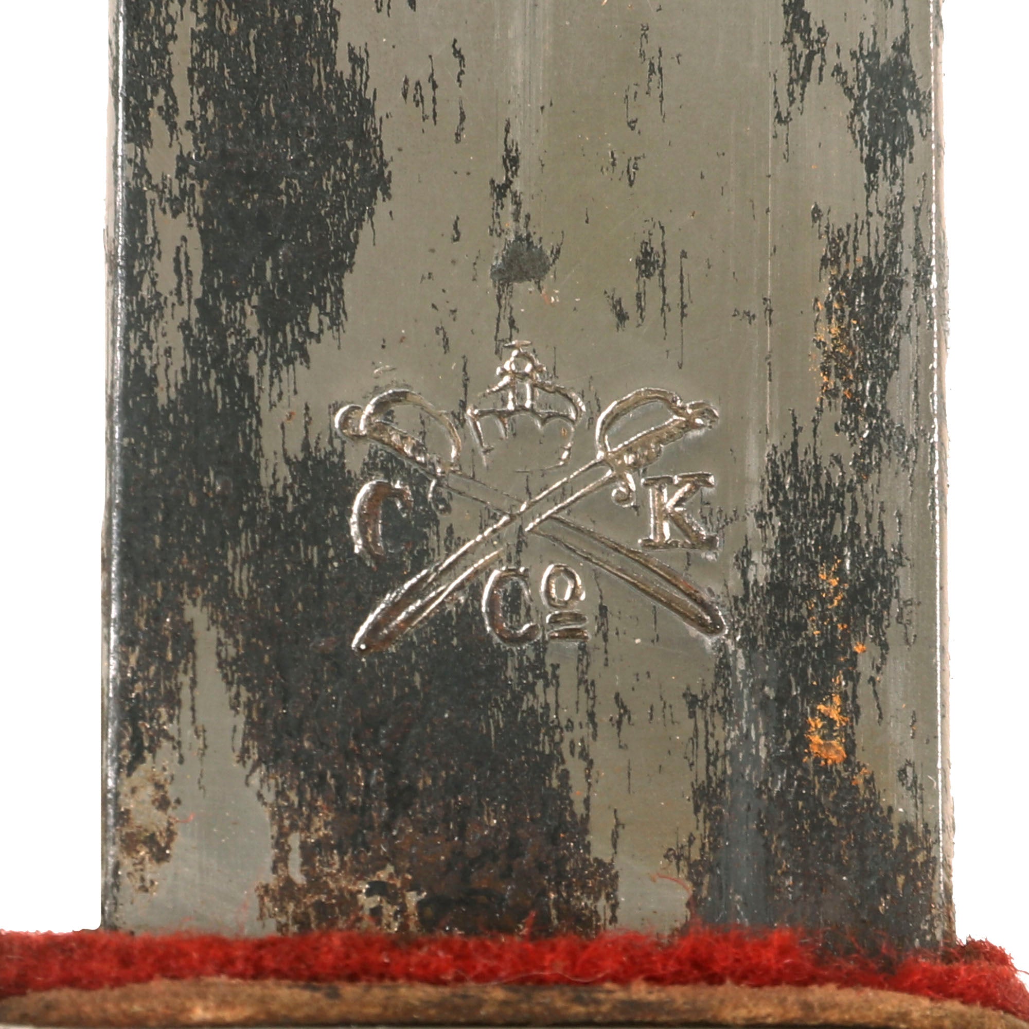 The slightly curved nickel plated blade has a single fuller on both sides and there is an etched panel on both sides with the badge of Bavaria over IN TREUE FEST. The ricasso has the maker's mark of a crown over crossed swords with C K & Co between the blades on the right side. This is the maker’s mark for Carl Kaiser & Co. of Solingen.