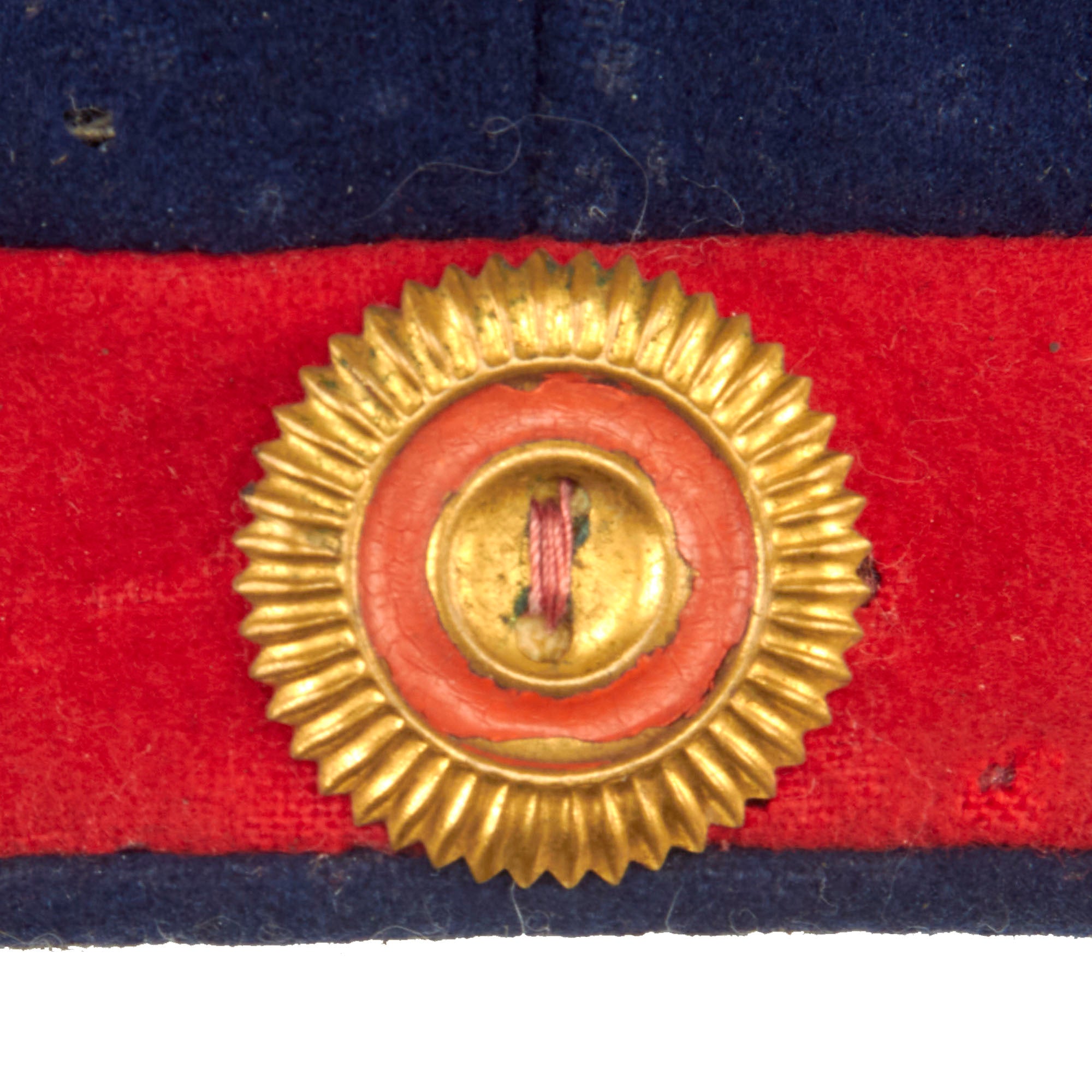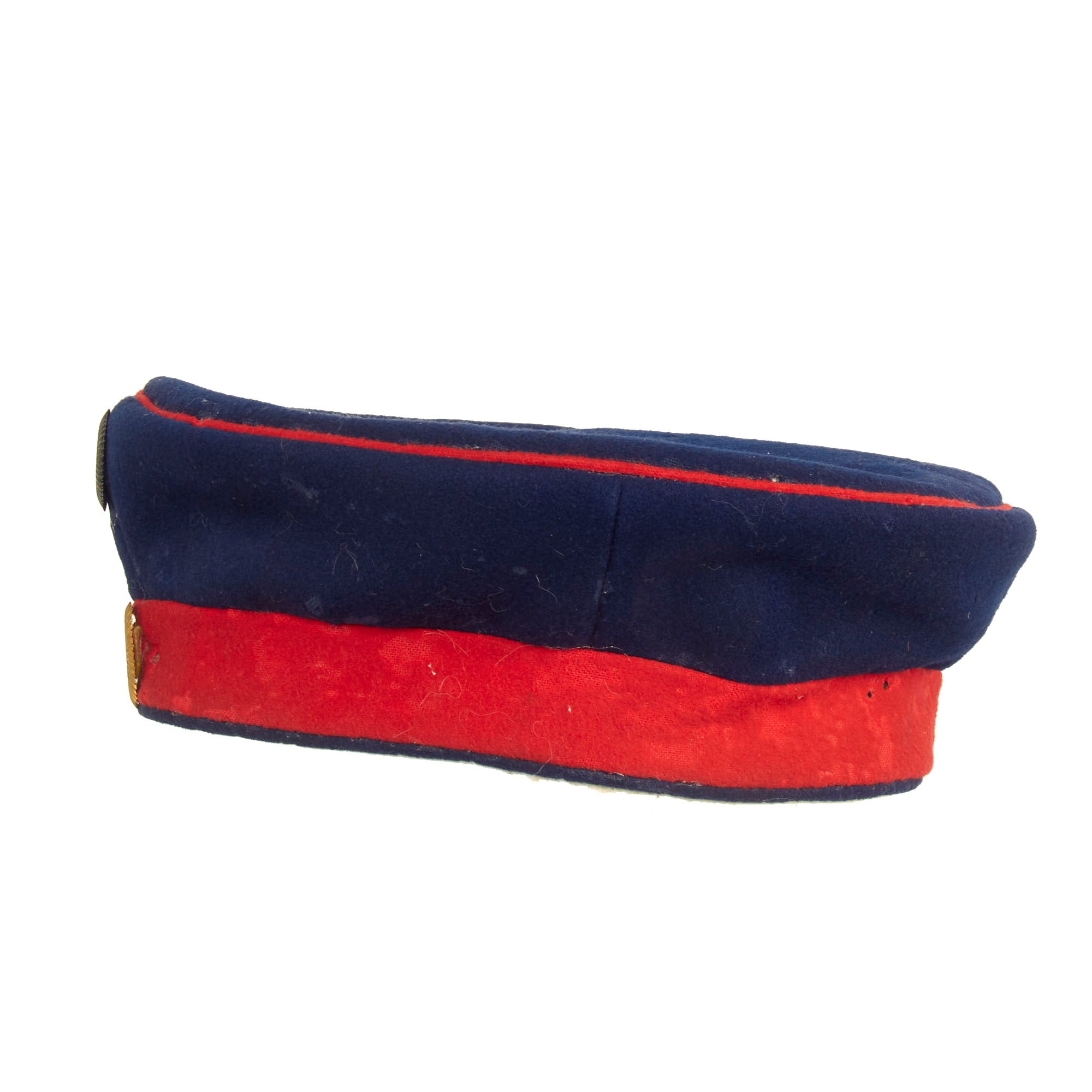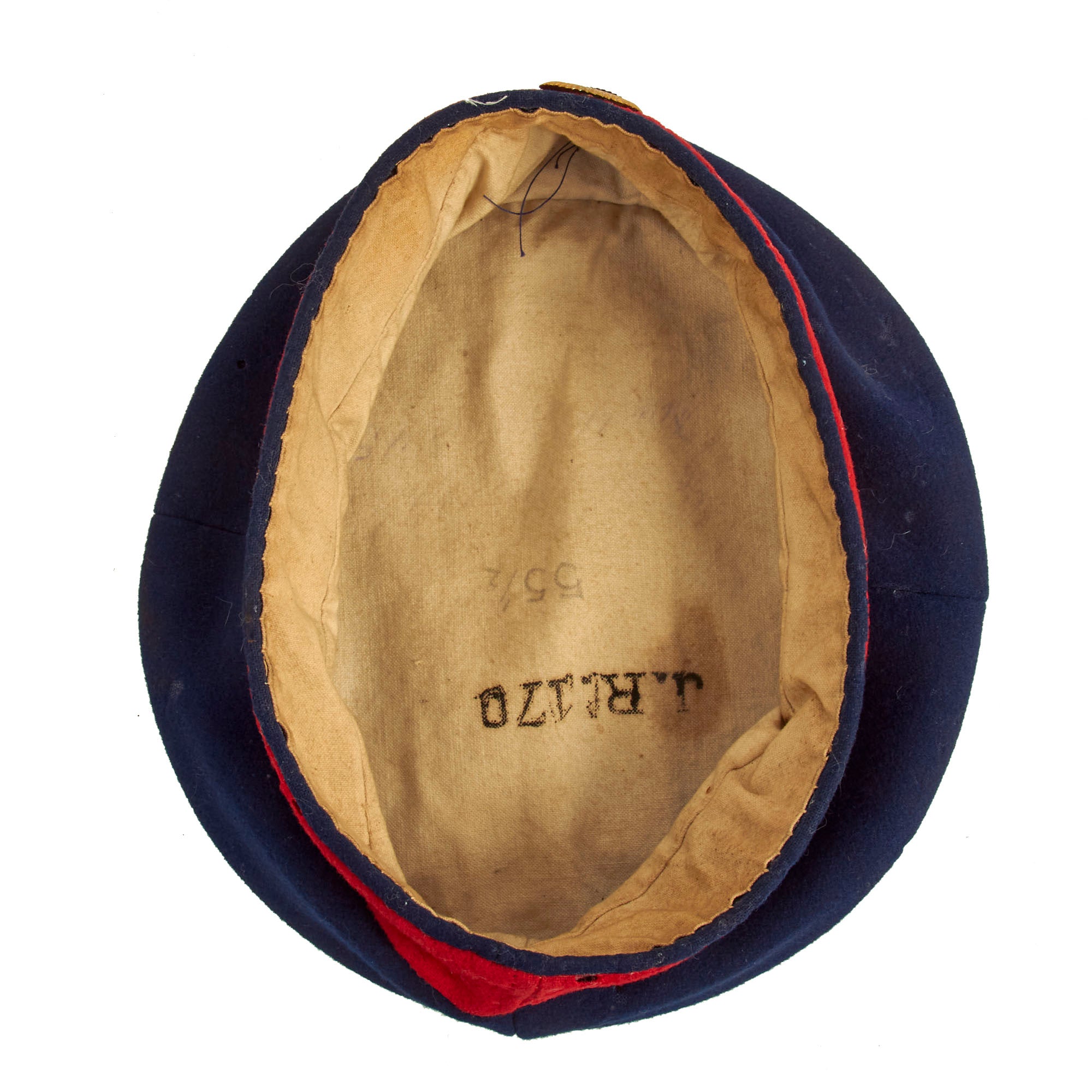 This cap is constructed of a fine dark blue wool with red piping around the top circumference and a 1” red wool band going around the lower circumference of the cap as well. The front features two lovely single piece stamped cockades as used by Mannschaften “other ranks”. The Mannschaften (Other Ranks) Kokarde was stamped one-piece metal painted in the national colors with two holes on the front to allow it to be sewn to the Feldmütze. In 1842 they introduced a Preußen Kokarde in the national colors of black/white/black which was worn on the center of the Feldmütze band, though this one is above the band. The red band features the cockade for the Grand Duchy of Baden in gold with a red center. Both cockades are retained quite nicely and without any extensive damage.