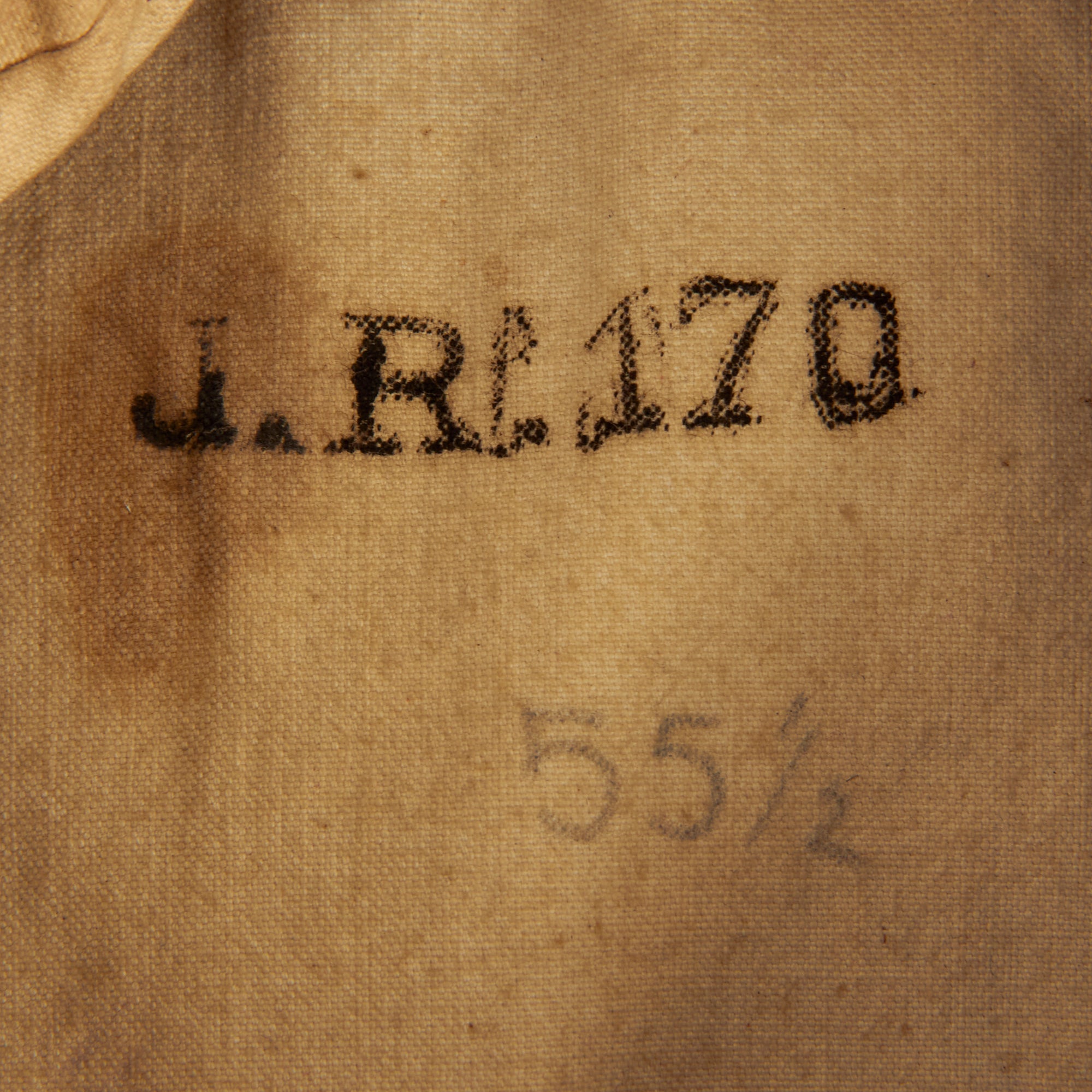 The exterior exhibits a lovely color with minimal fading and scattered moth nips. The interior lining is a cream colored heavy cotton which does have some staining present but it is still fully attached with no stitching loss. There is a size stamp still faintly present, but still reads as being a 55 ½.