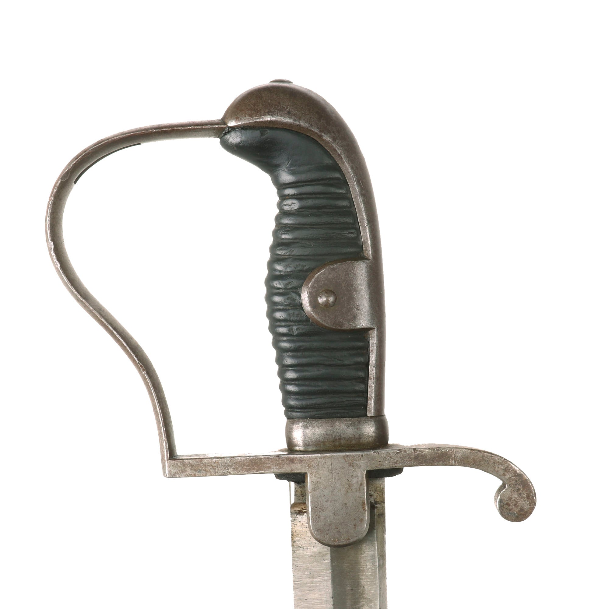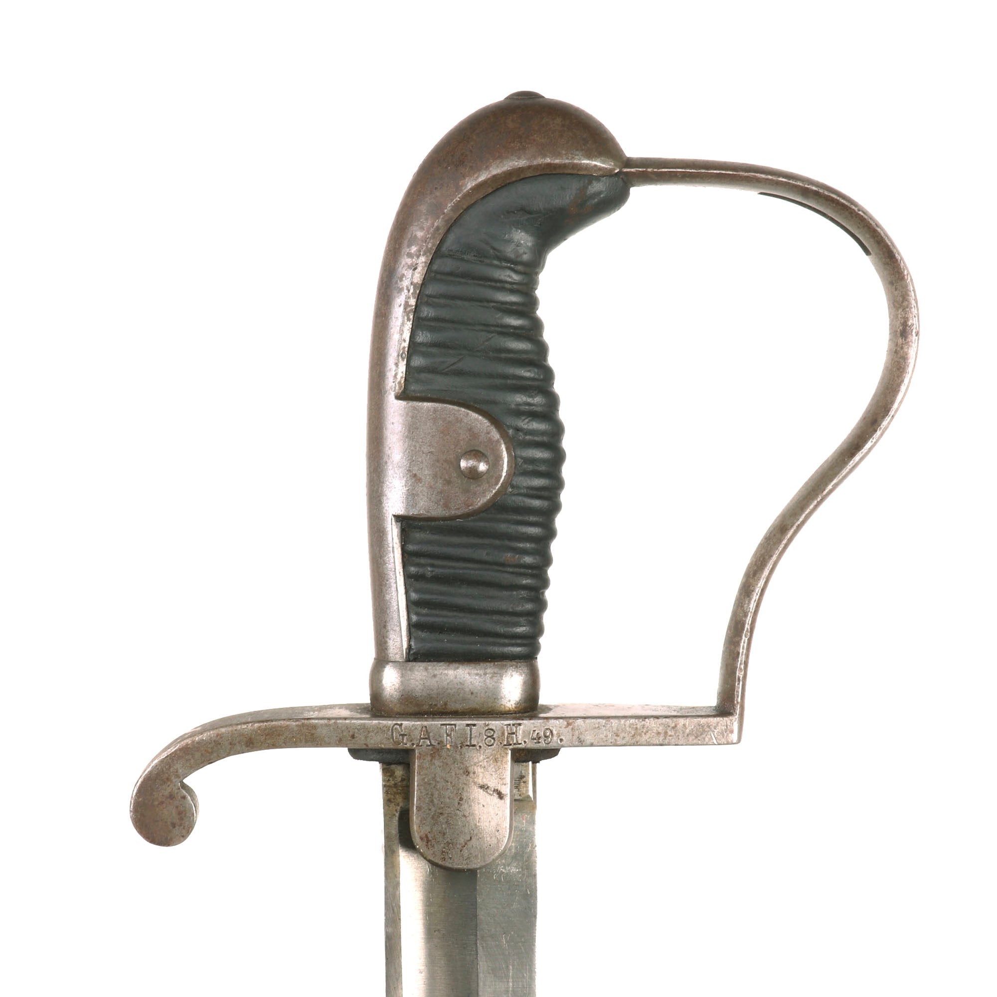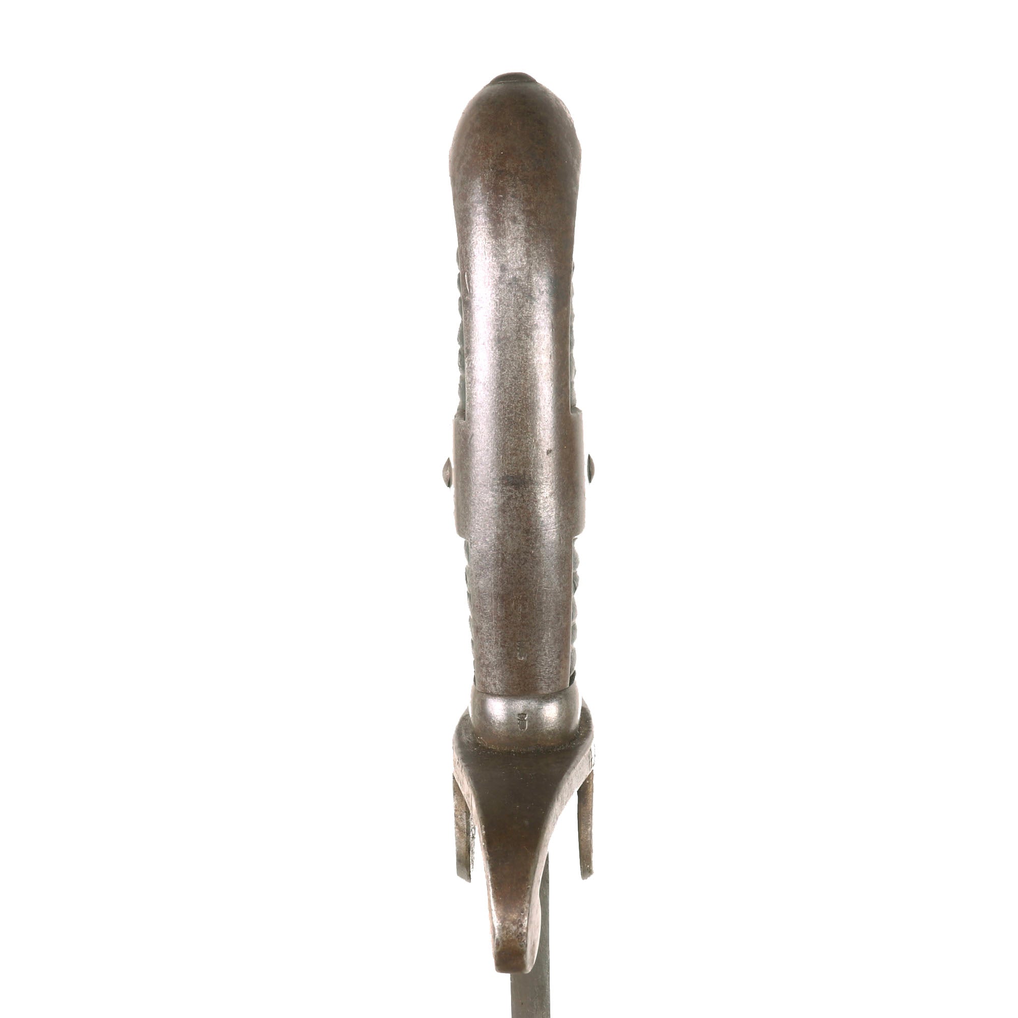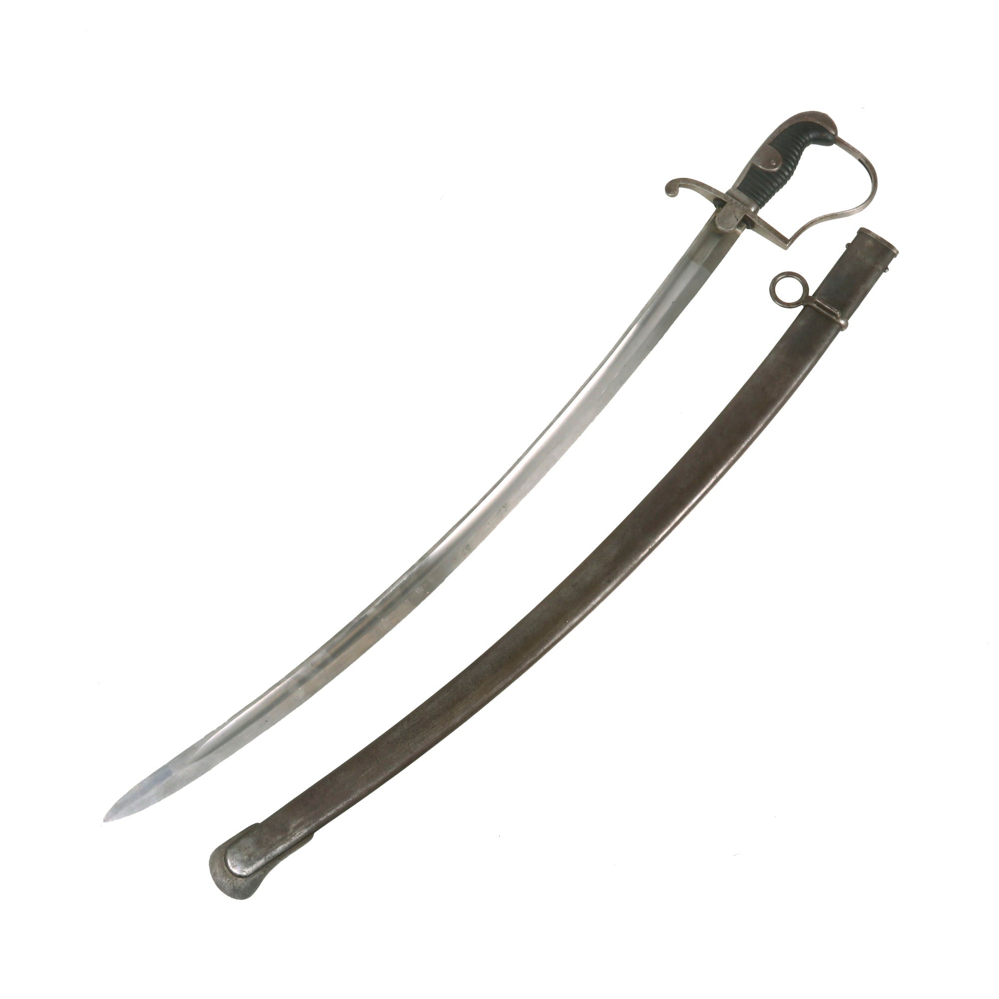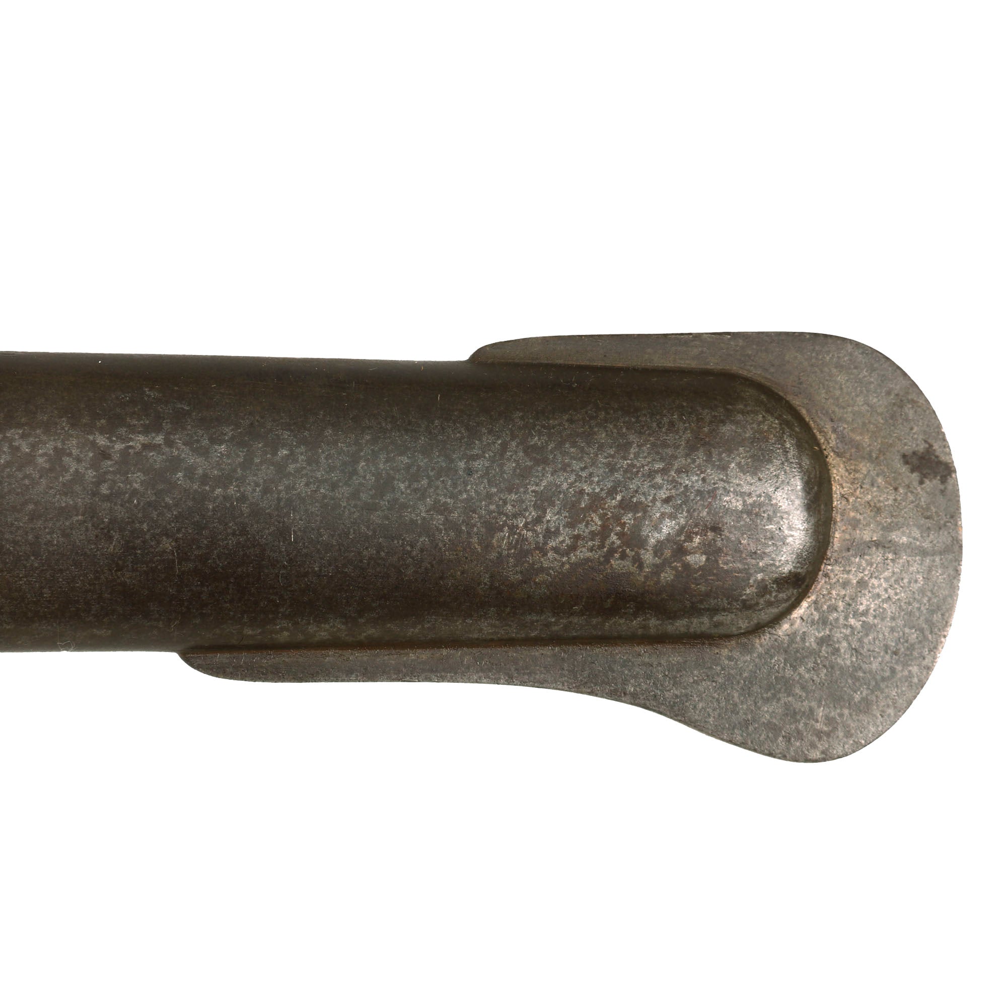 The blade still retains the leather blade buffer, though it is a bit worn, and the sword has a very nice wooden ribbed grip, which are somewhat more rare to find on these examples when compared to the rubber grip. It features the characteristic single knuckle bow hand guard. There are various proof marks on hilt and blade, and this sword comes with the original all steel scabbard, which is in very good condition. It still retains a good amount of the original blued finish, especially near the throat. It does have some denting on the body, but no real bends, and none of this interferes with the sheathing of the blade.
