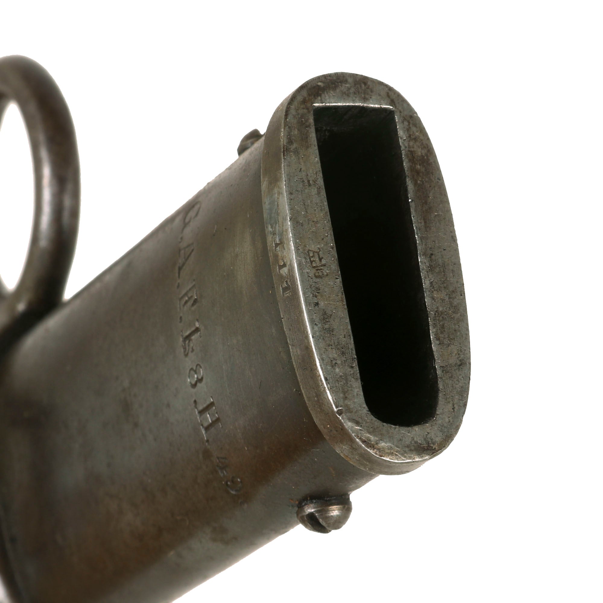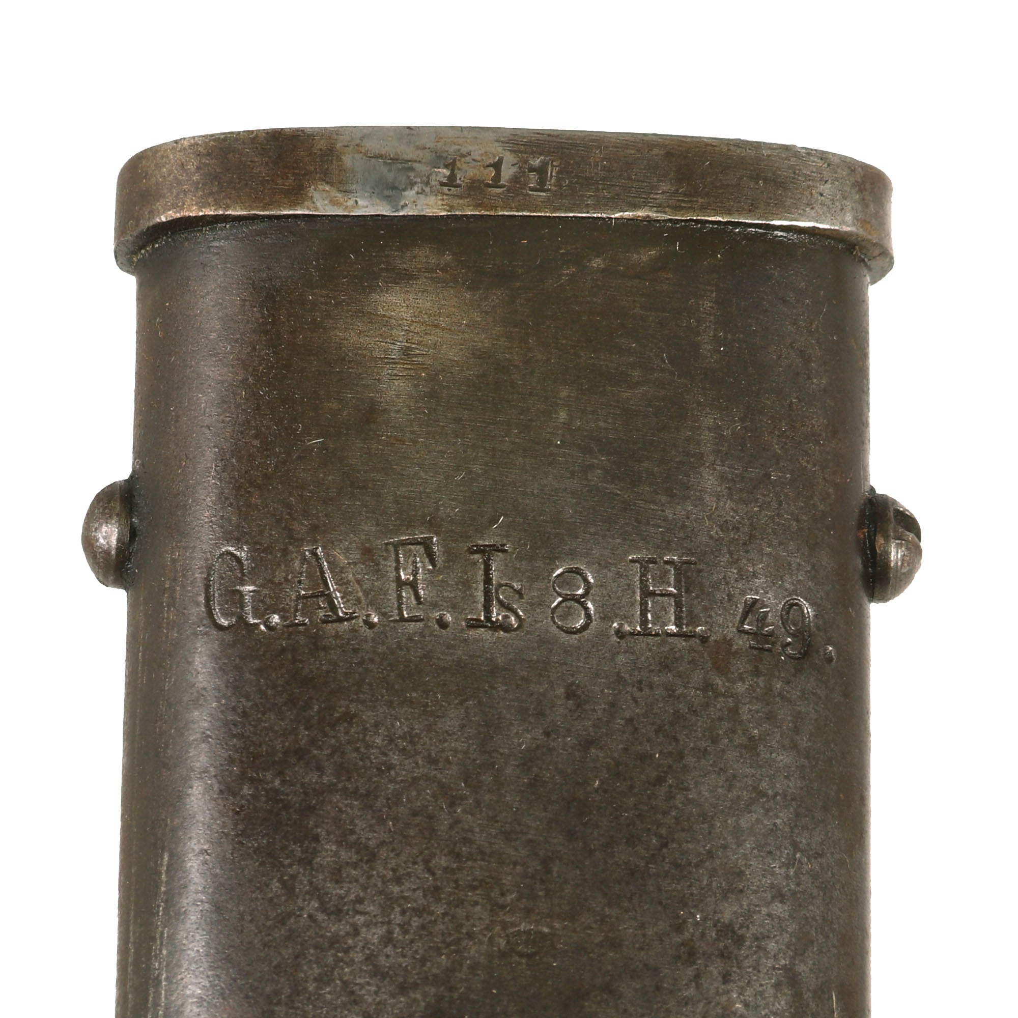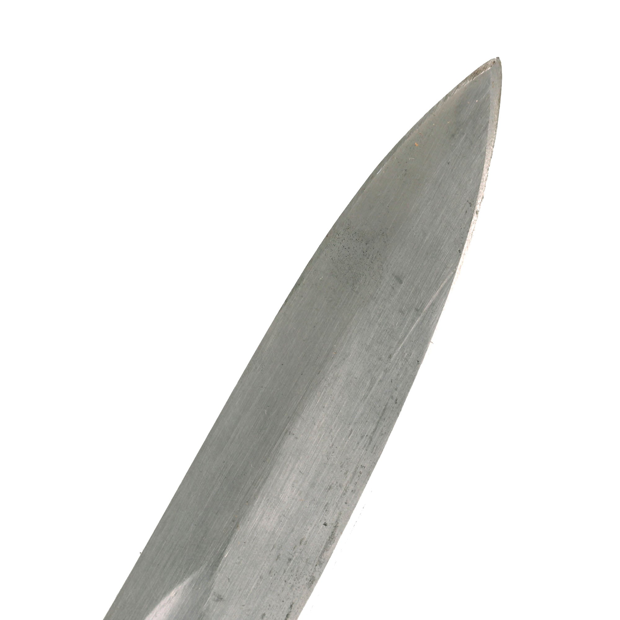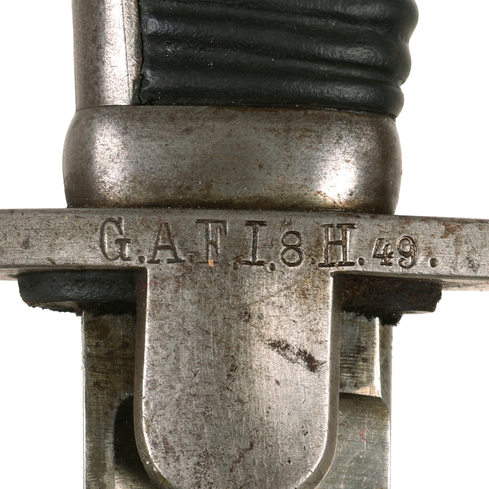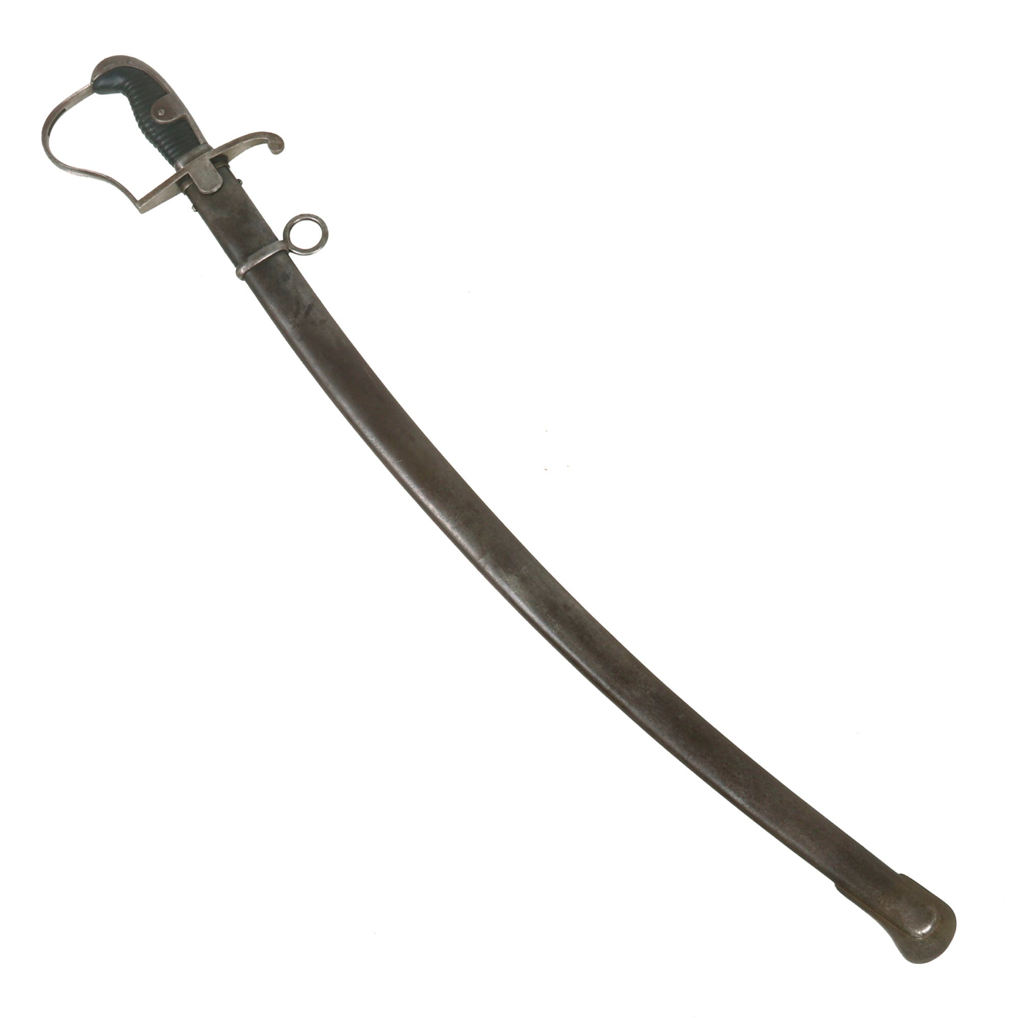 The blade still retains the leather blade buffer, though it is a bit worn, and the sword has a very nice wooden ribbed grip, which are somewhat more rare to find on these examples when compared to the rubber grip. It features the characteristic single knuckle bow hand guard. There are various proof marks on hilt and blade, and this sword comes with the original all steel scabbard, which is in very good condition. It still retains a good amount of the original blued finish, especially near the throat. It does have some denting on the body, but no real bends, and none of this interferes with the sheathing of the blade.