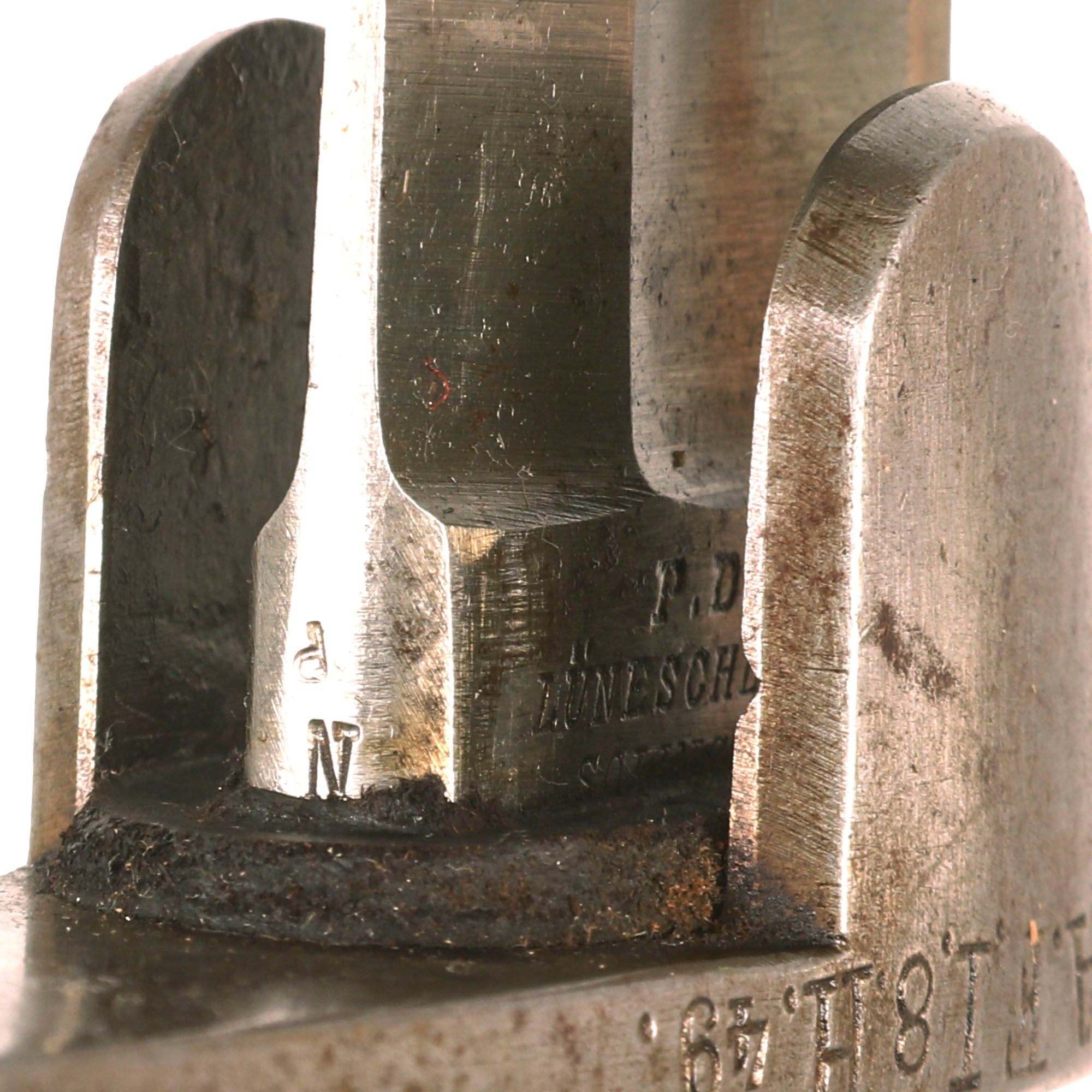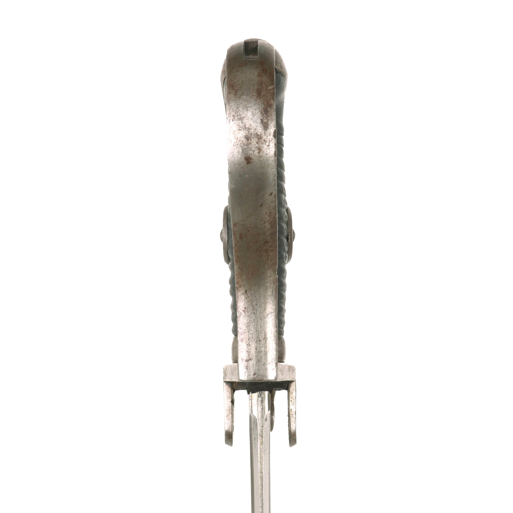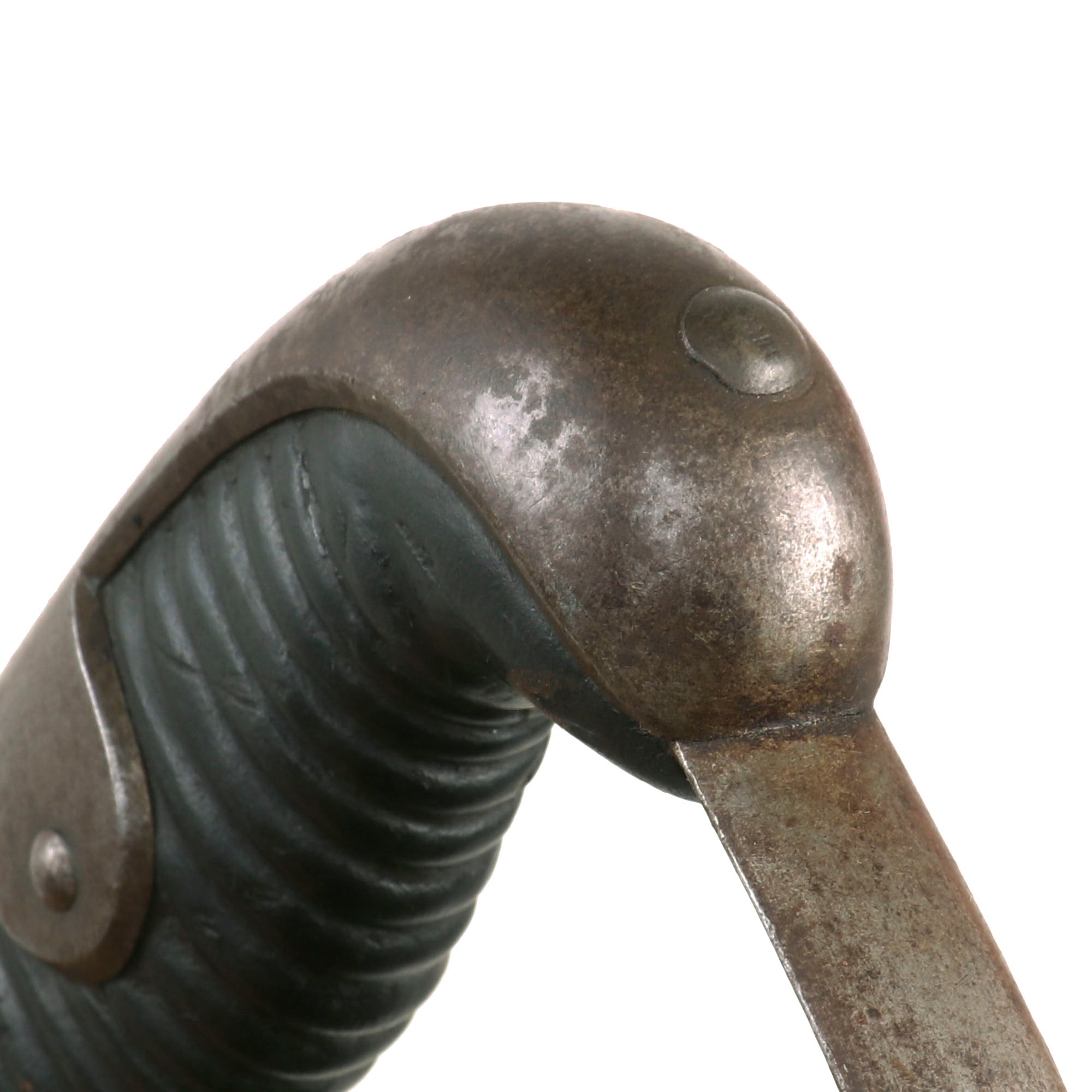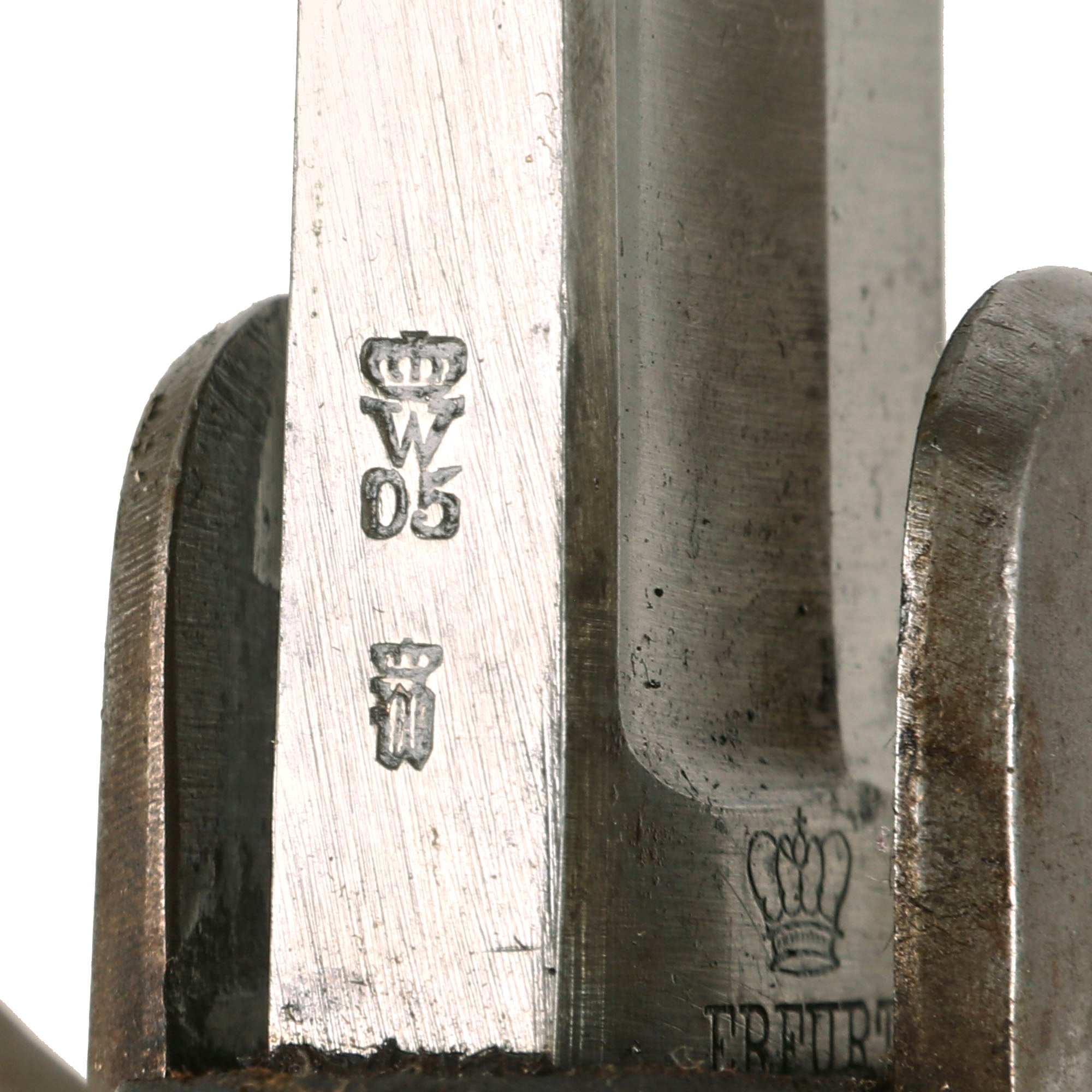 This example is in very good service used condition, showing very nice blade condition, with only a few areas of light oxidation on the otherwise solid blade. The machining marks can even still be seen on most of the blade body. The blade has been sharpened, and there are a few small nicks, but it is still quite nice. It is stamped on the upper spine near the hilt is a small Crown over W over 05 for Kaiser Wilhelm II 1905, the year it was accepted into service. Under this is a sub inspector marking.