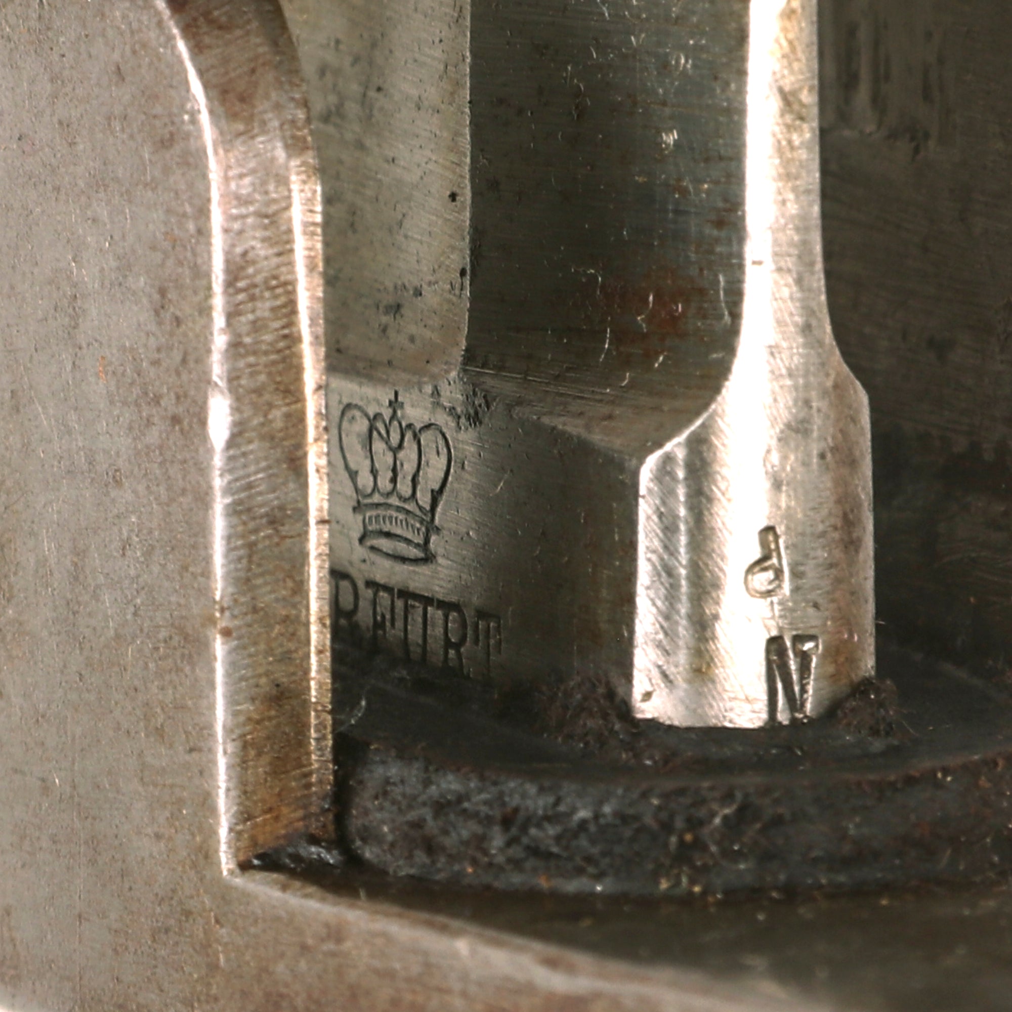The ricasso is marked (CROWN) / ERFURT. for manufacture at the Imperial arsenal in Erfurt. This is stamped under the rain guard (chappe), making it it quite hard to see and impossible to photograph.