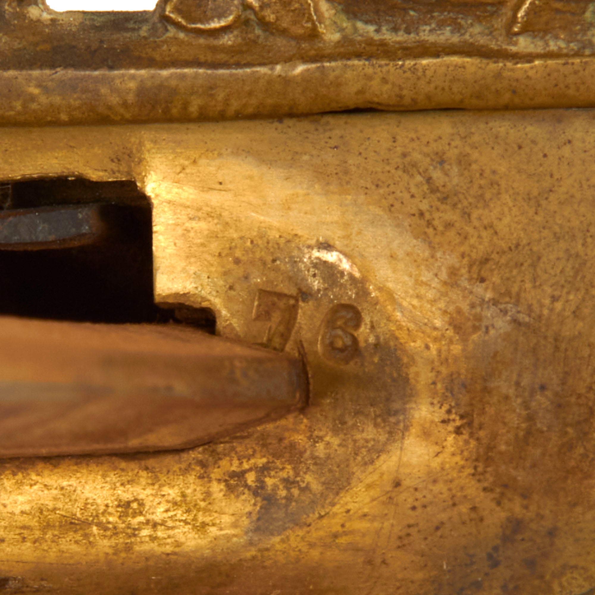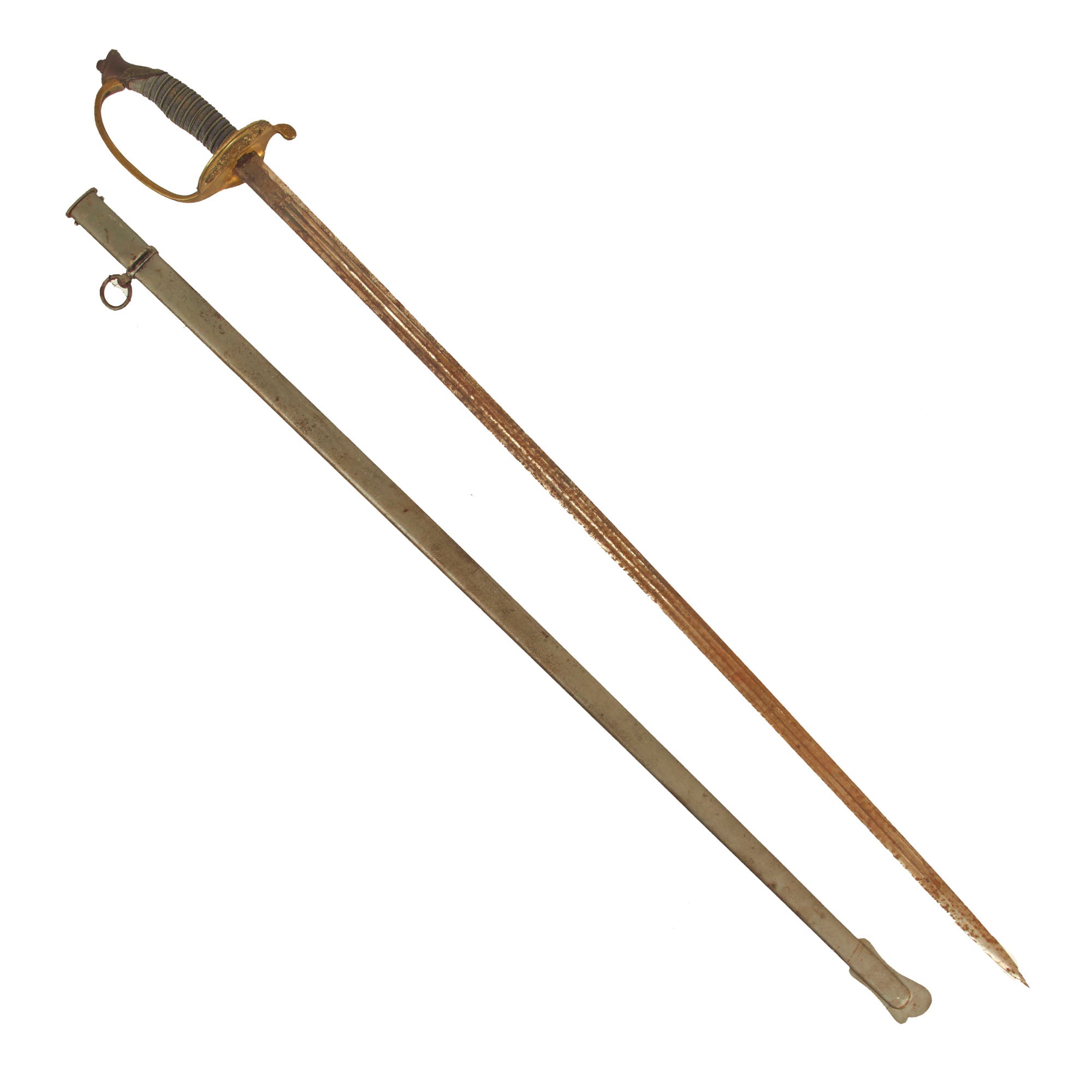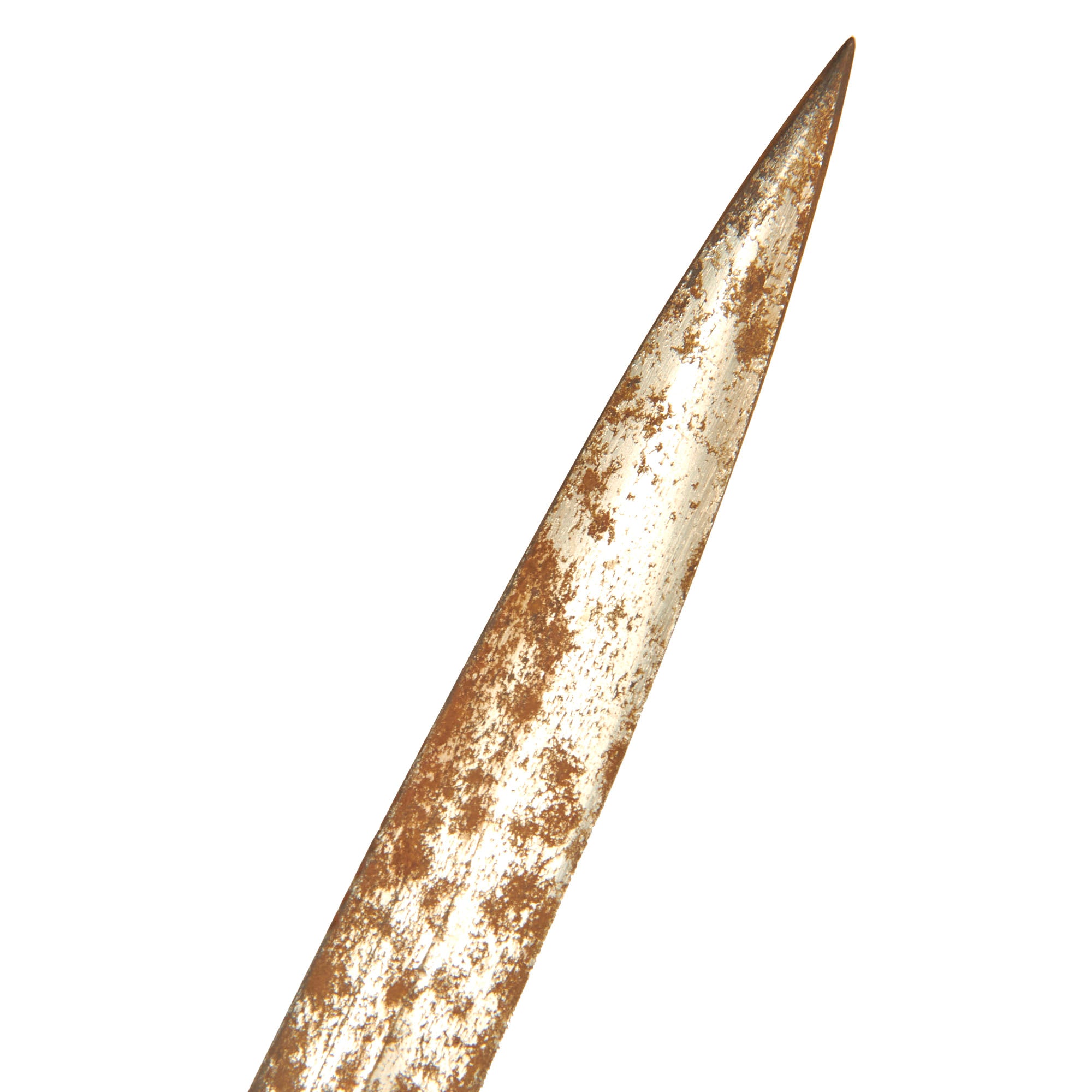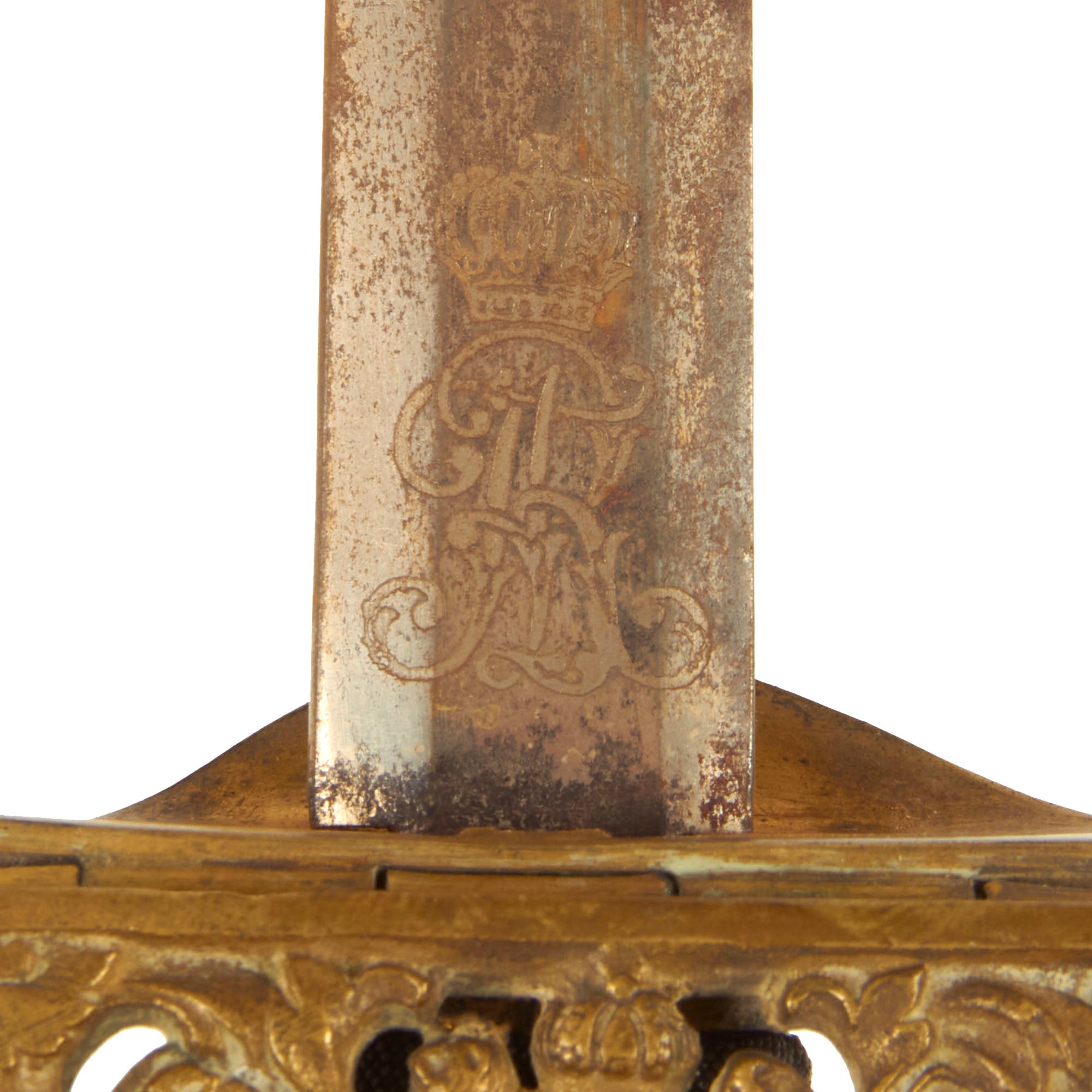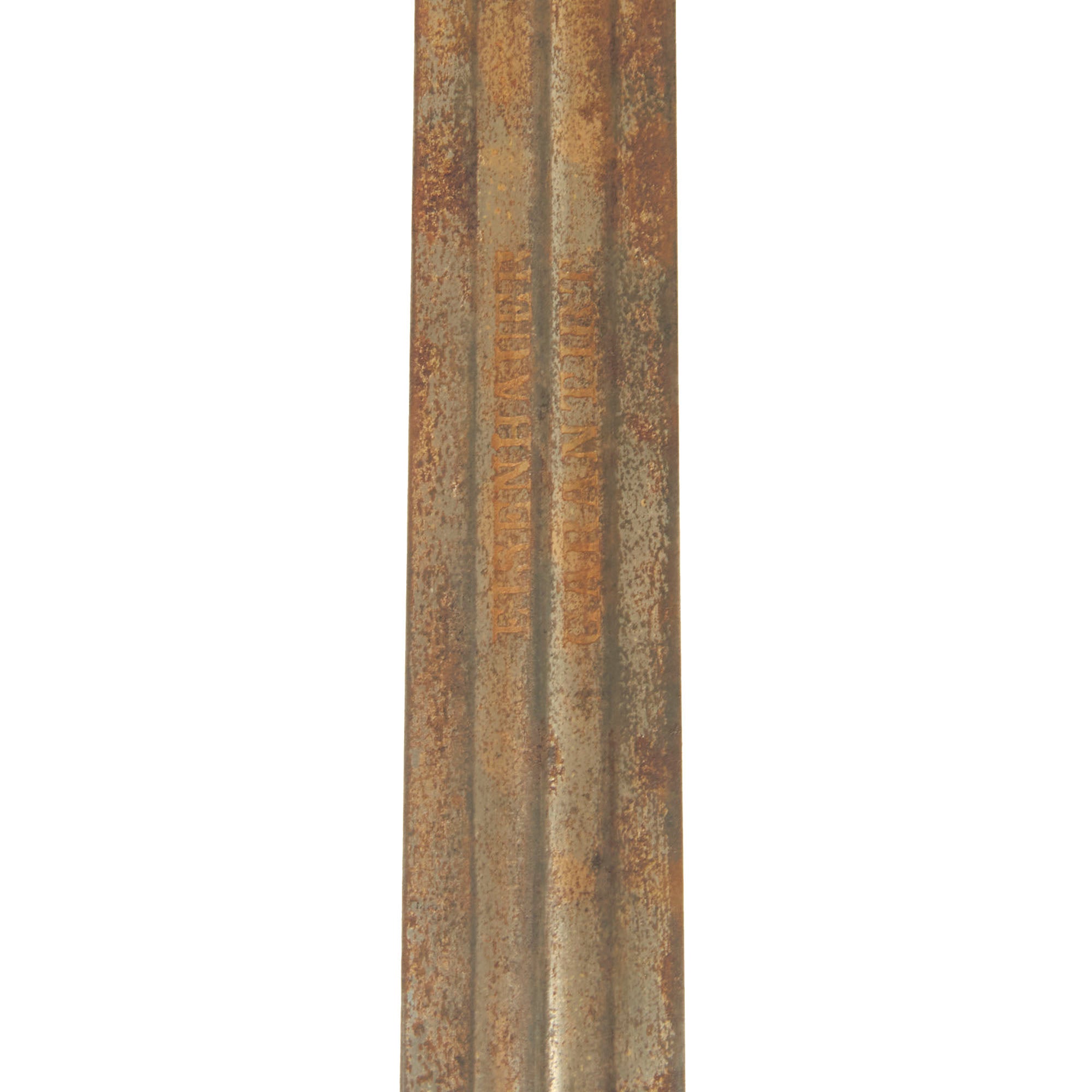 The nickel plated double edged straight blade is in good condition and has a triple fuller on each side and is 31 1/4 inches from the spear point to the hilt. The nickel plate is retained very well, with only some light wear from the scabbard, and minor oxidation though it appears that it could clean up nicely. The sword ricasso is etched with a CROWN over an interlocking FA monogram, which is one of the three known types used by Saxon King Frederick Augustus III. He reigned from 1904 until the end of the Monarchy following WWI in 1918. Overall length of the sword is 37 1/4 inches, and the leather blade buffer is missing.
