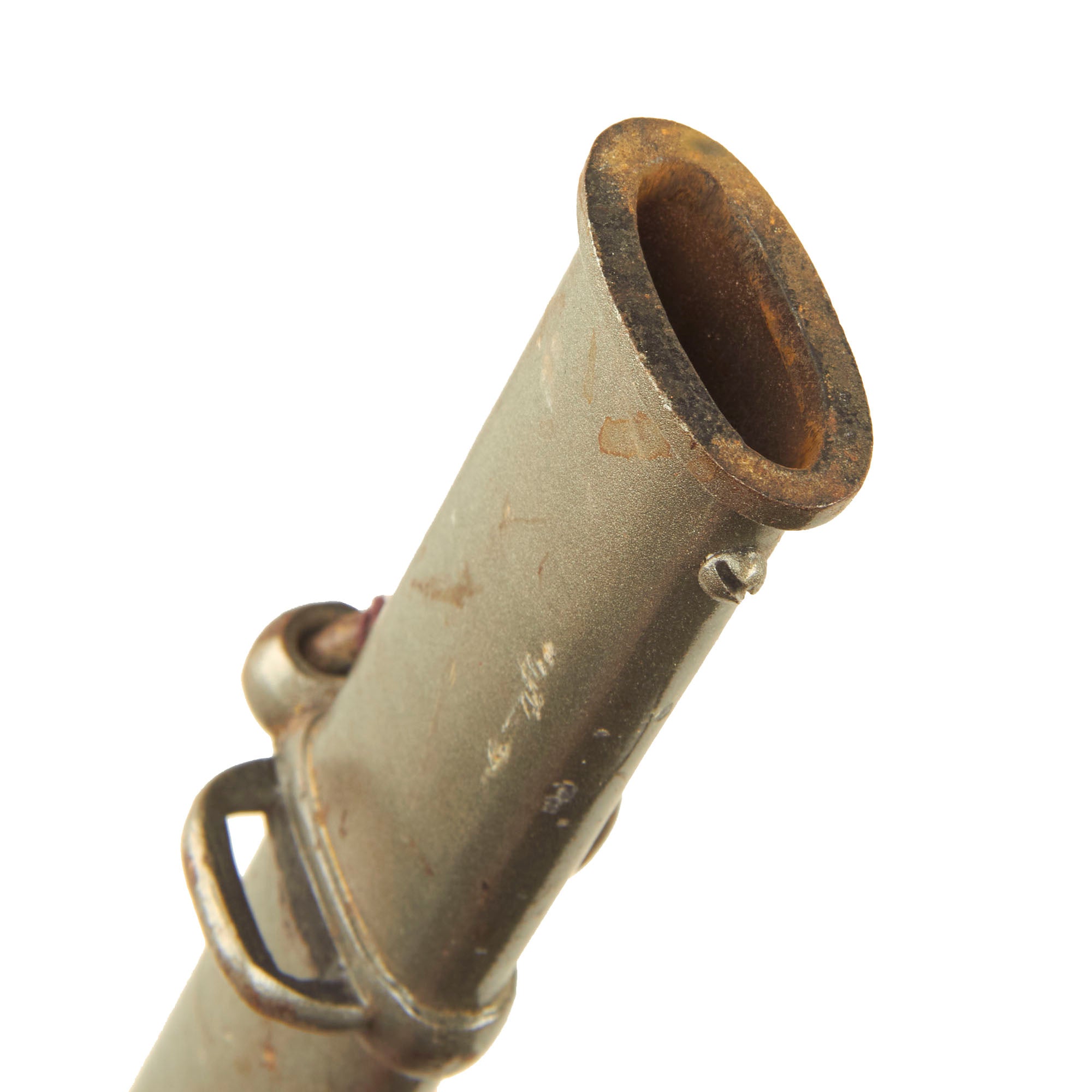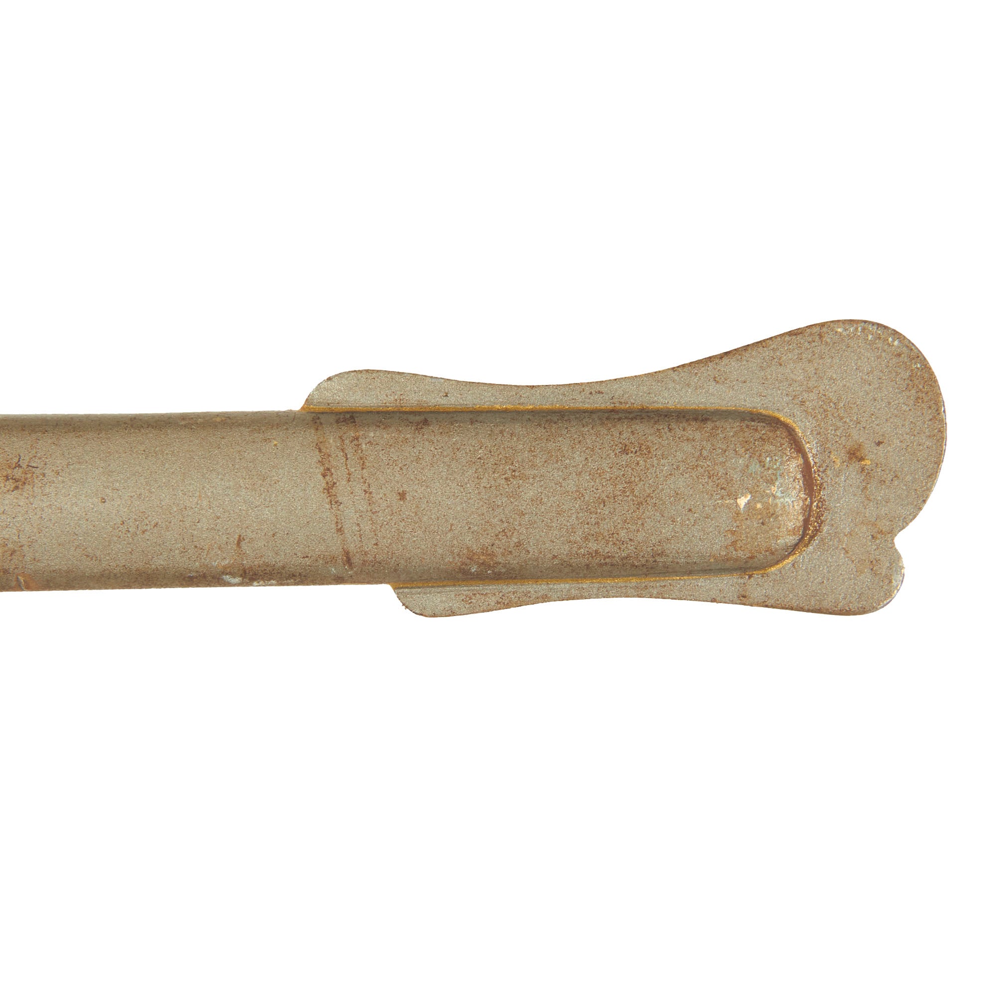 The steel scabbard has a single hanging ring, as the second fitting was for a hook on the hanger. It was originally blued steel, however the bluing has oxidized in most areas, and now it has a mostly oxidized patina. There are no dents we can see, and the sword fits into the scabbard quite nicely, with a secure throat.