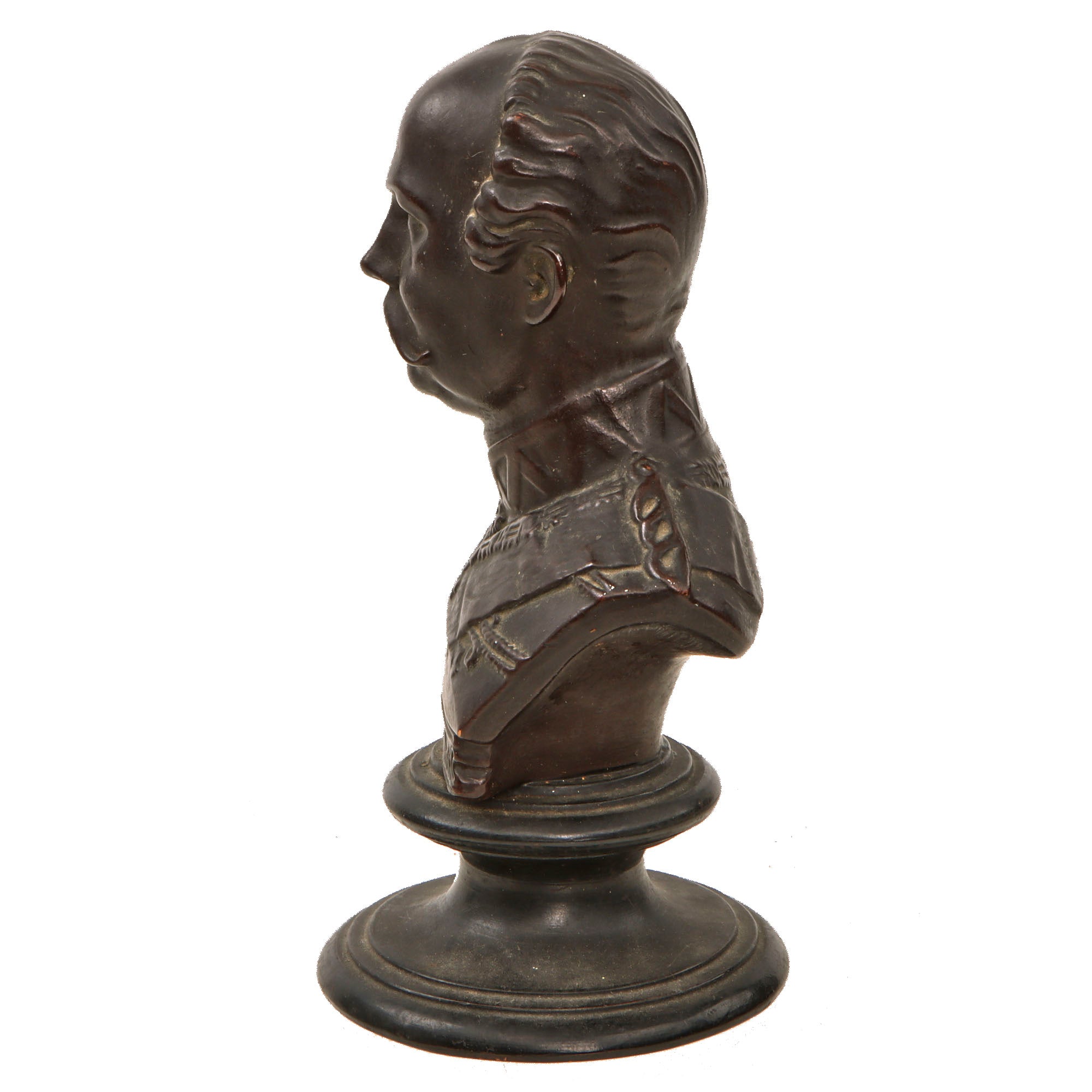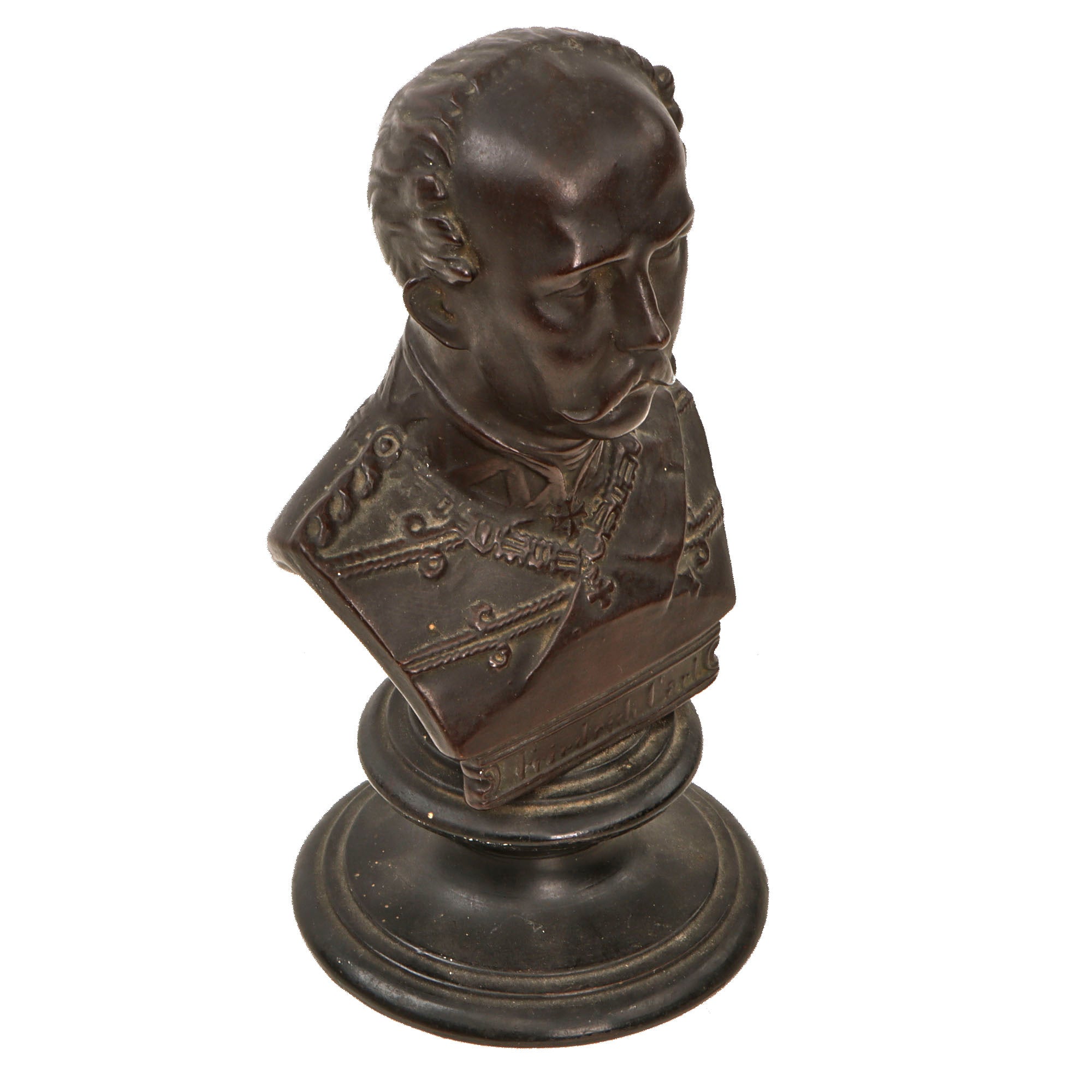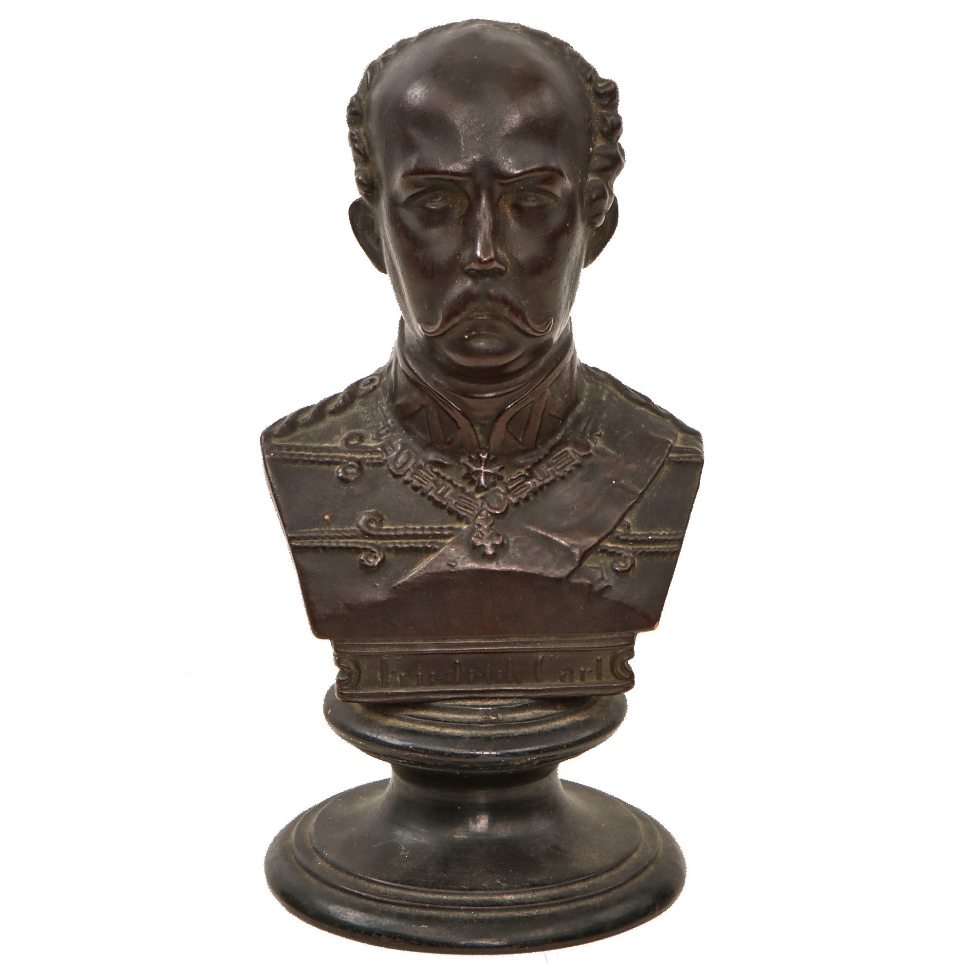 This is a lovely small terracotta bust of Prince Friedrich Karl of Prussia, one of the most popular military commanders in German history. The bust measures 9” tall and is extremely light, with the bottom of the base appearing shiny almost like ceramic. The bottom is inscribed with maker’s mark U & C / 128, the latter likely being the model number. U&C denotes Utzschneider & Cie. The bust itself names the figure as “Friedrich Carl”.