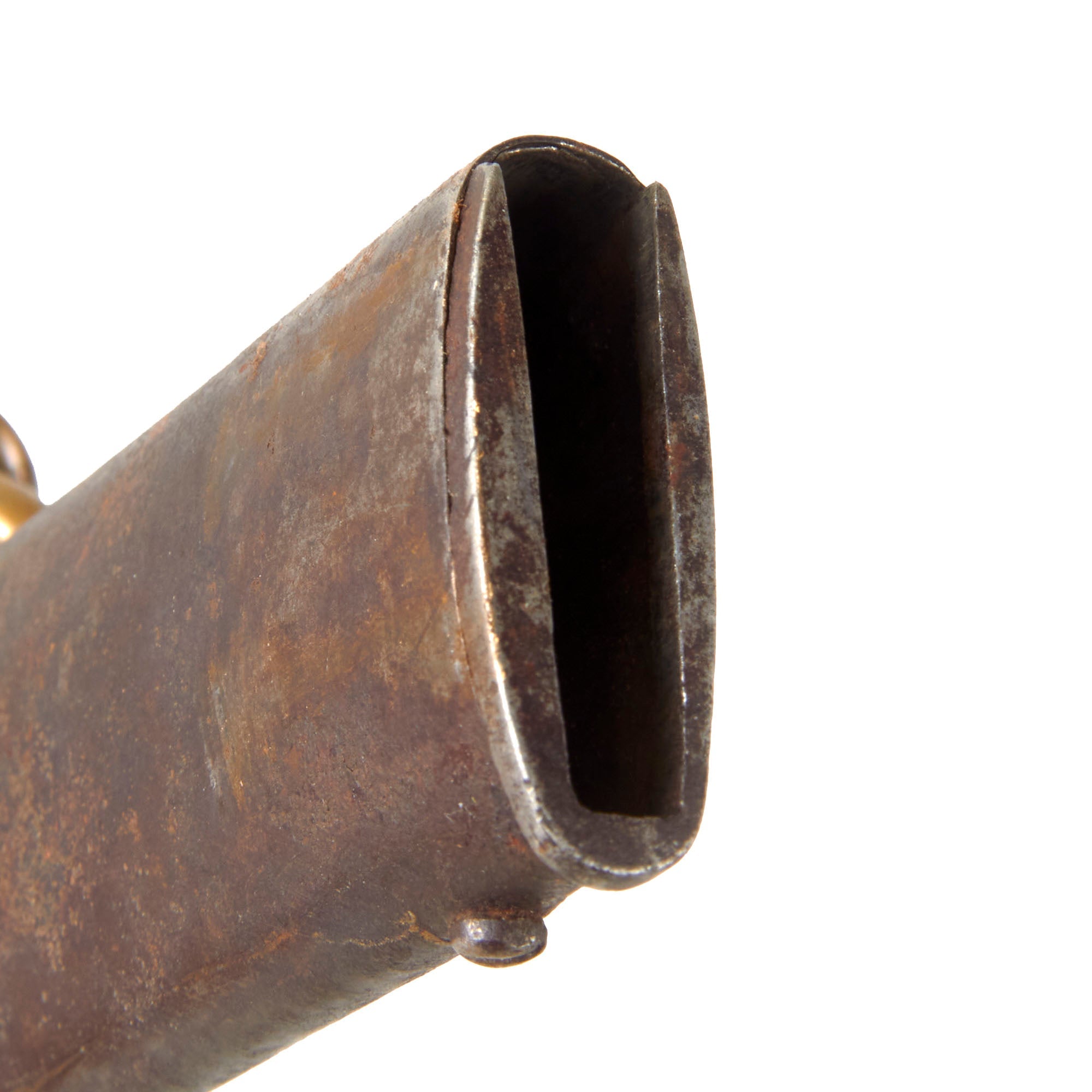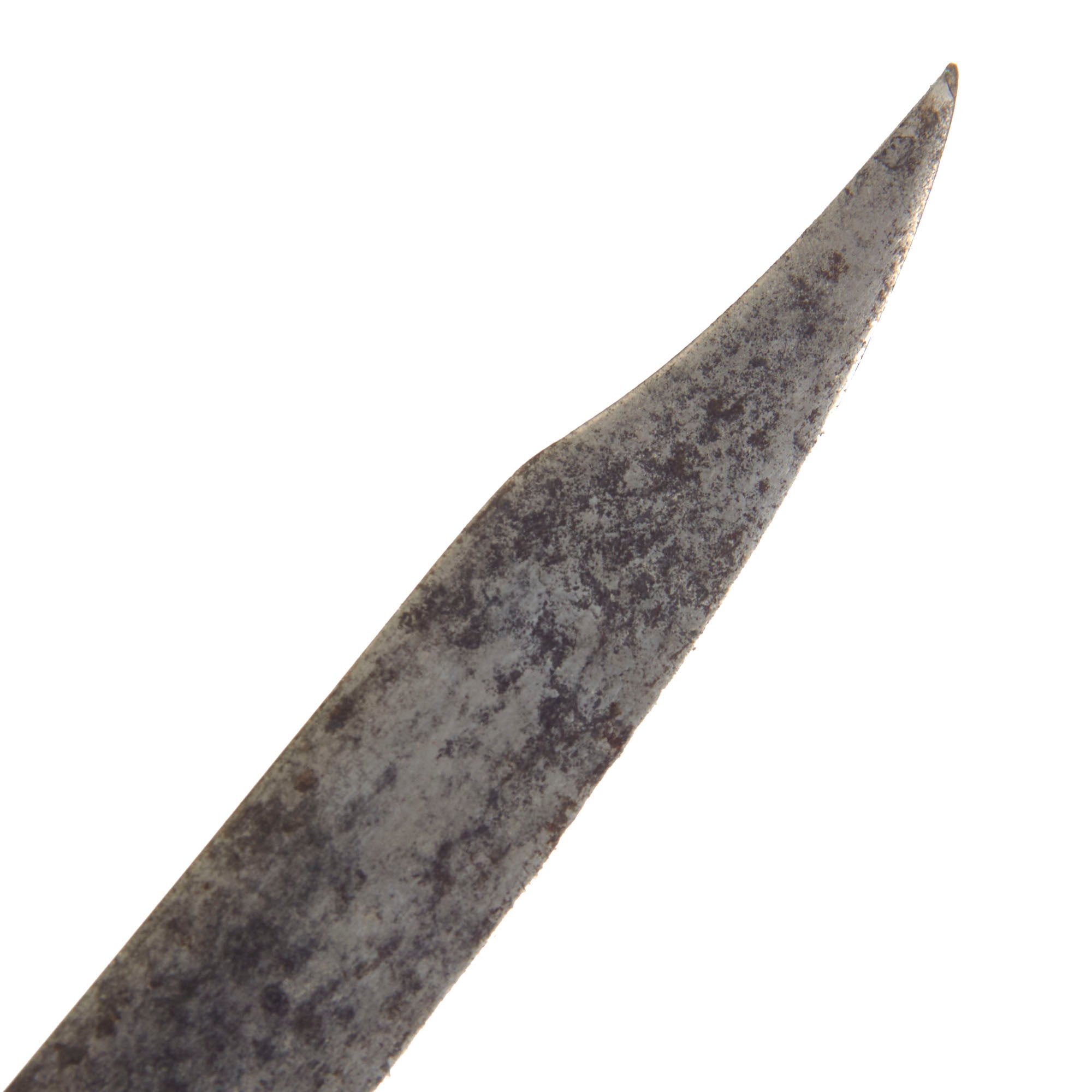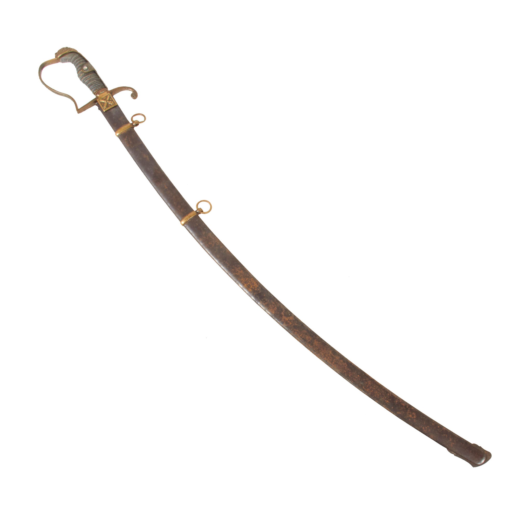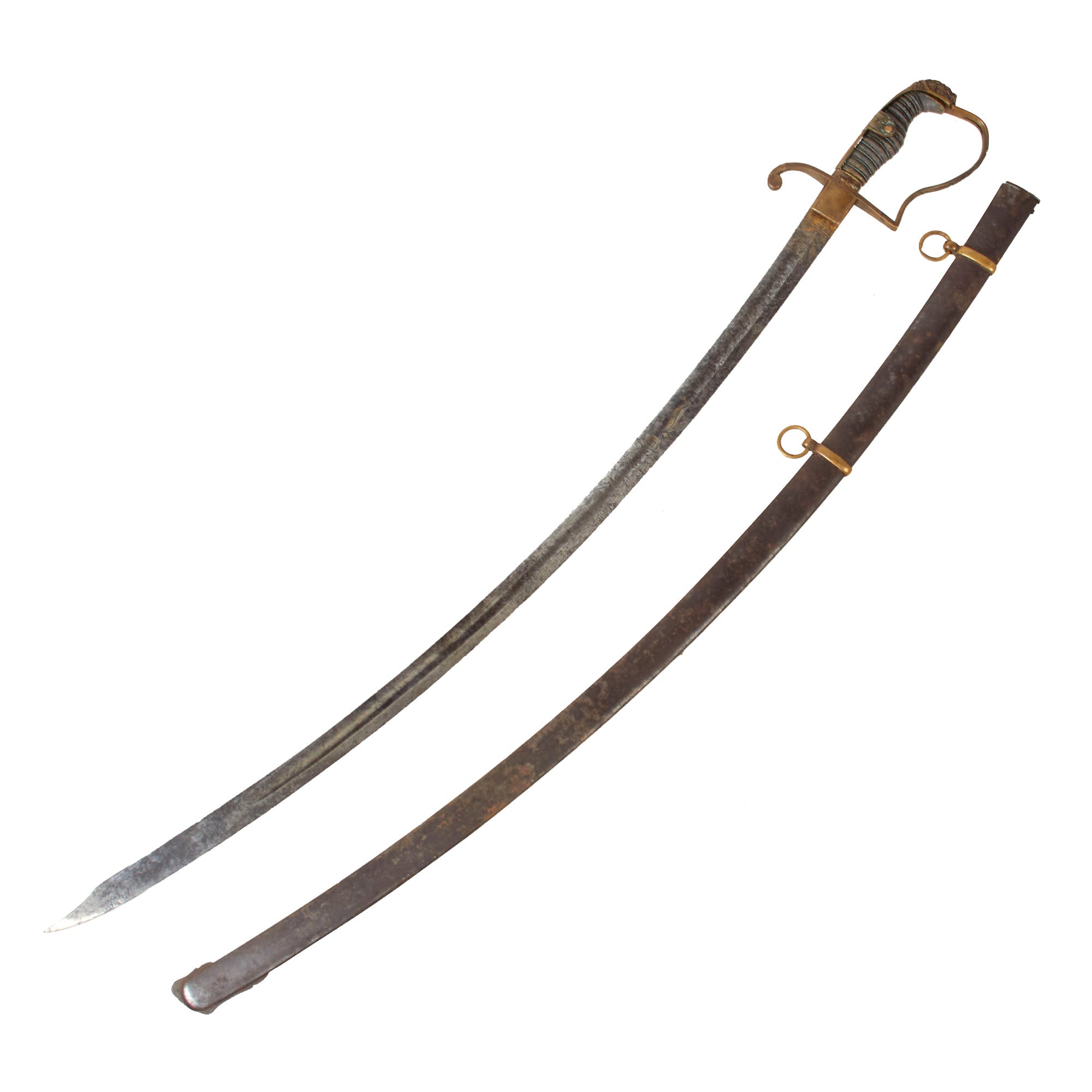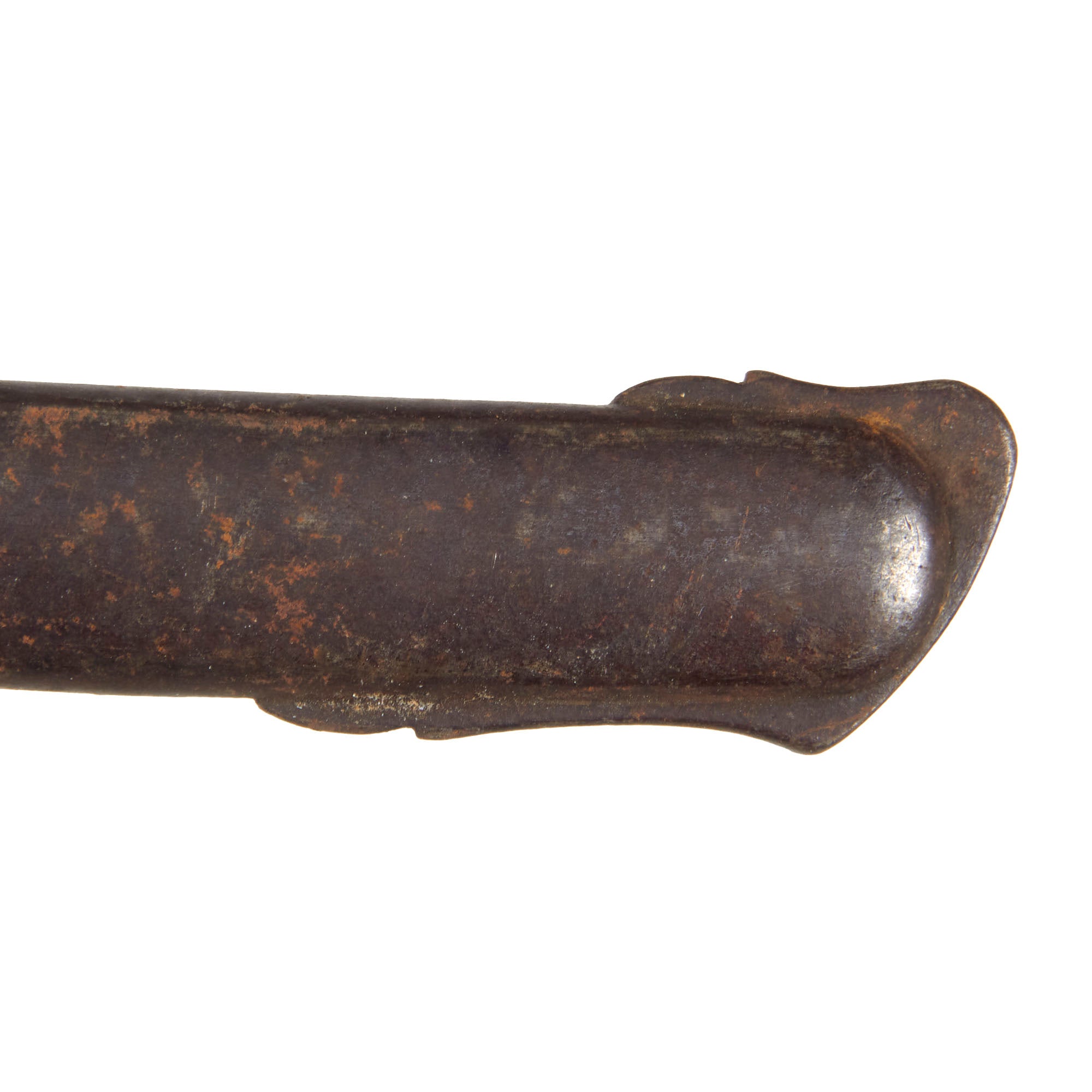 The original scabbard is in good shape with a very worn patina, along with some denting. One of the throat screws is missing. Both brass suspension rings are retained