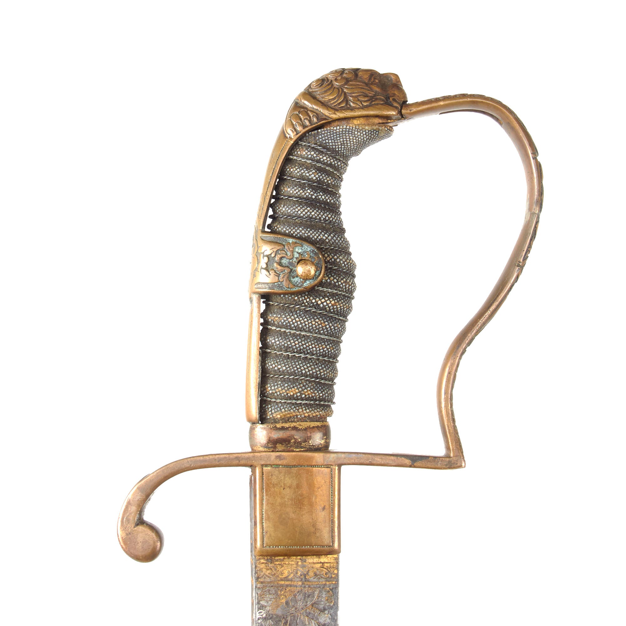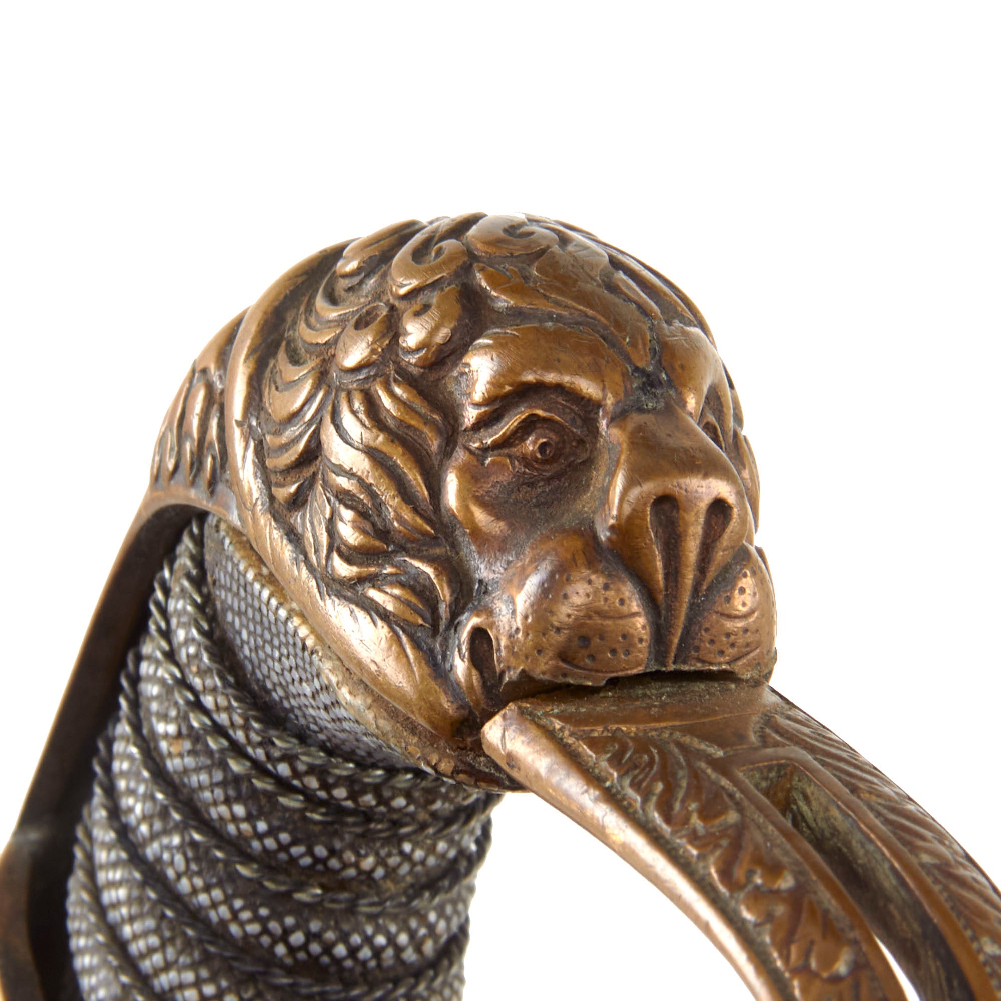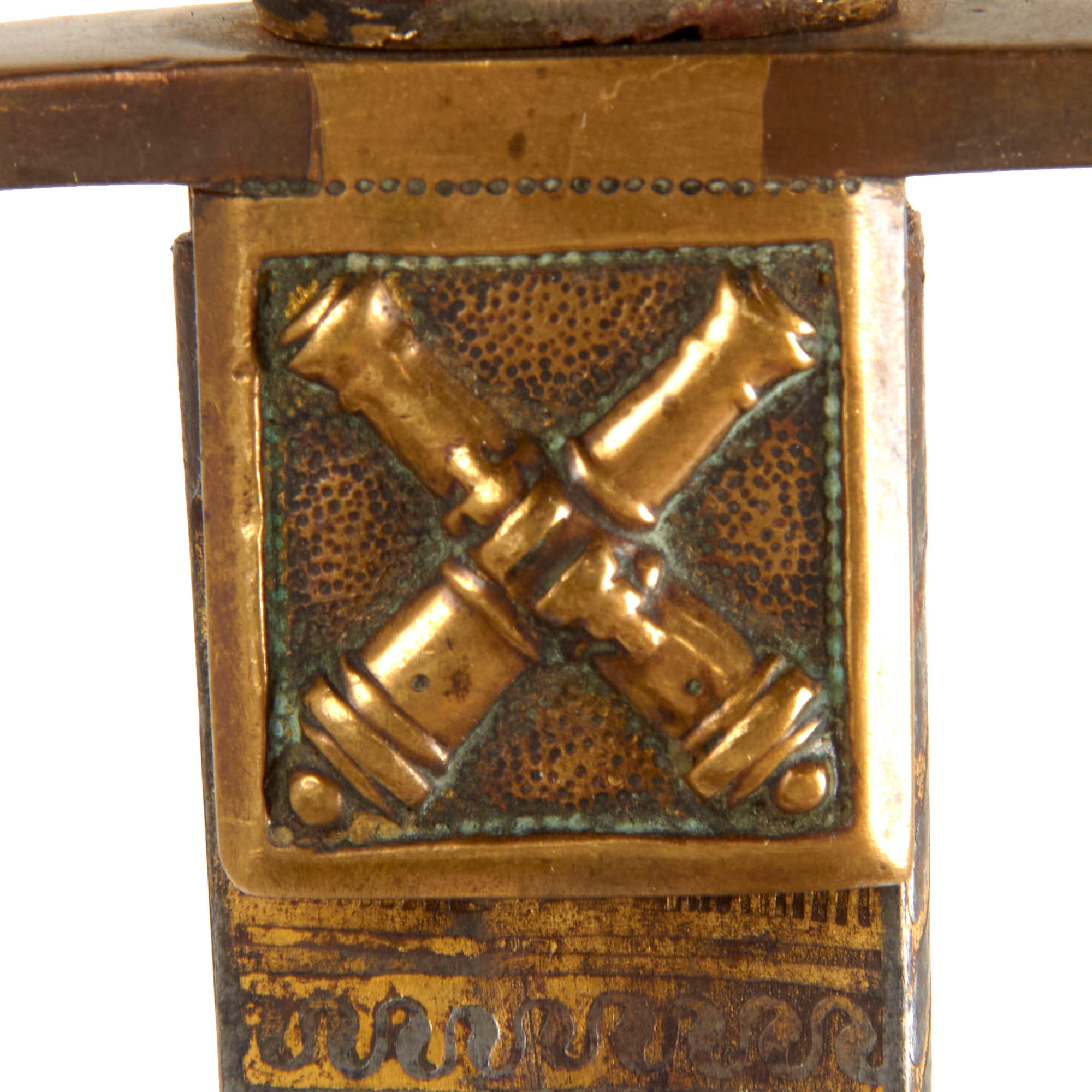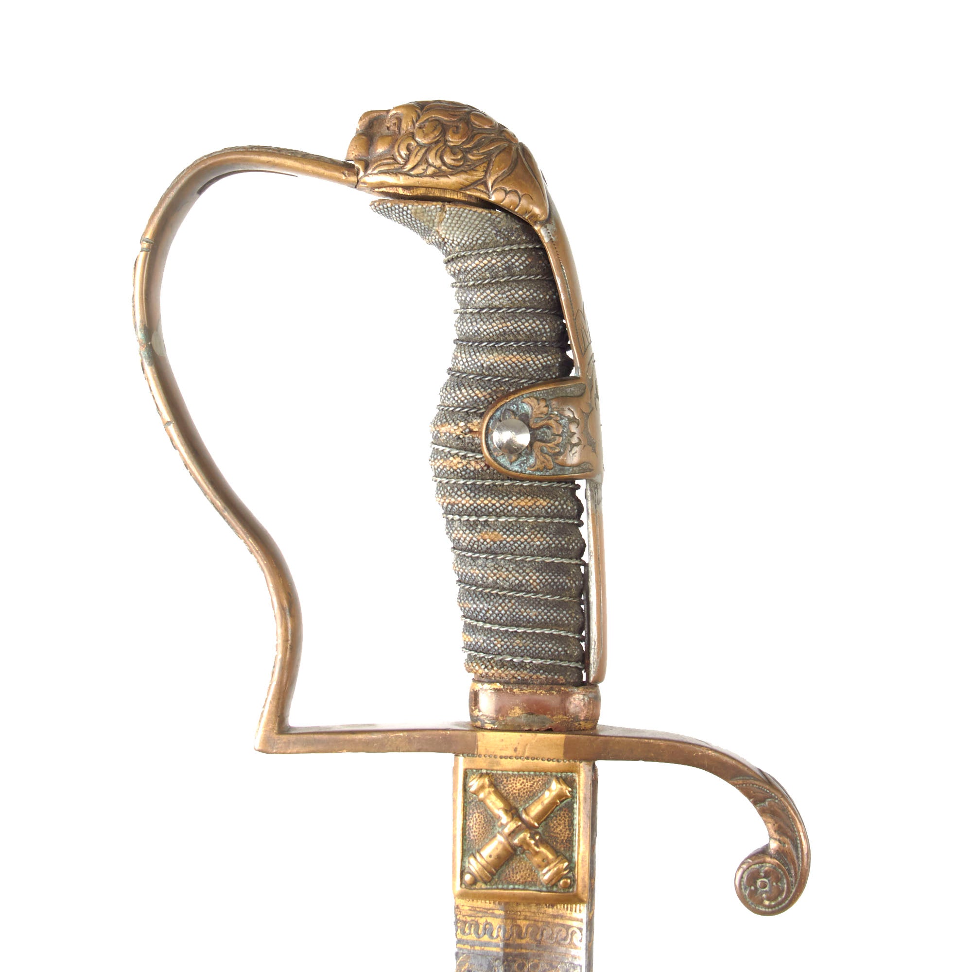 Original item: Only One Available. This is a beautiful classic Lionhead German WWI Artillery Officer's sword. The all brass alloy hilt consists of a finely detailed lion head cat with floral backstrap and "P" guard. Nicely detailed throughout his whiskers, chin, muzzle, and especially the Lion's Mane. The handwork is beautifully rendered throughout this brass. The brass chape bears crossed cannons denoting this as an artillery sword.