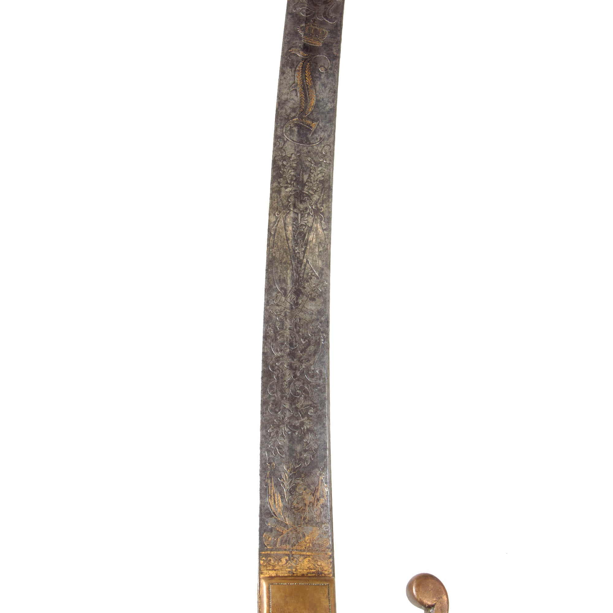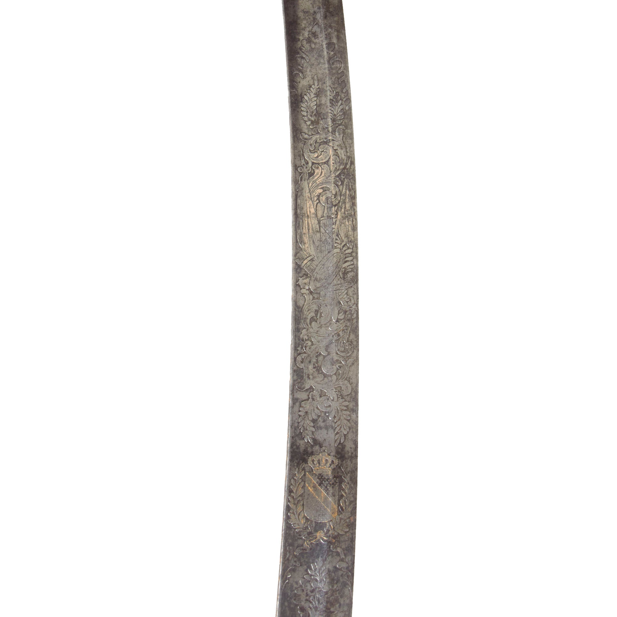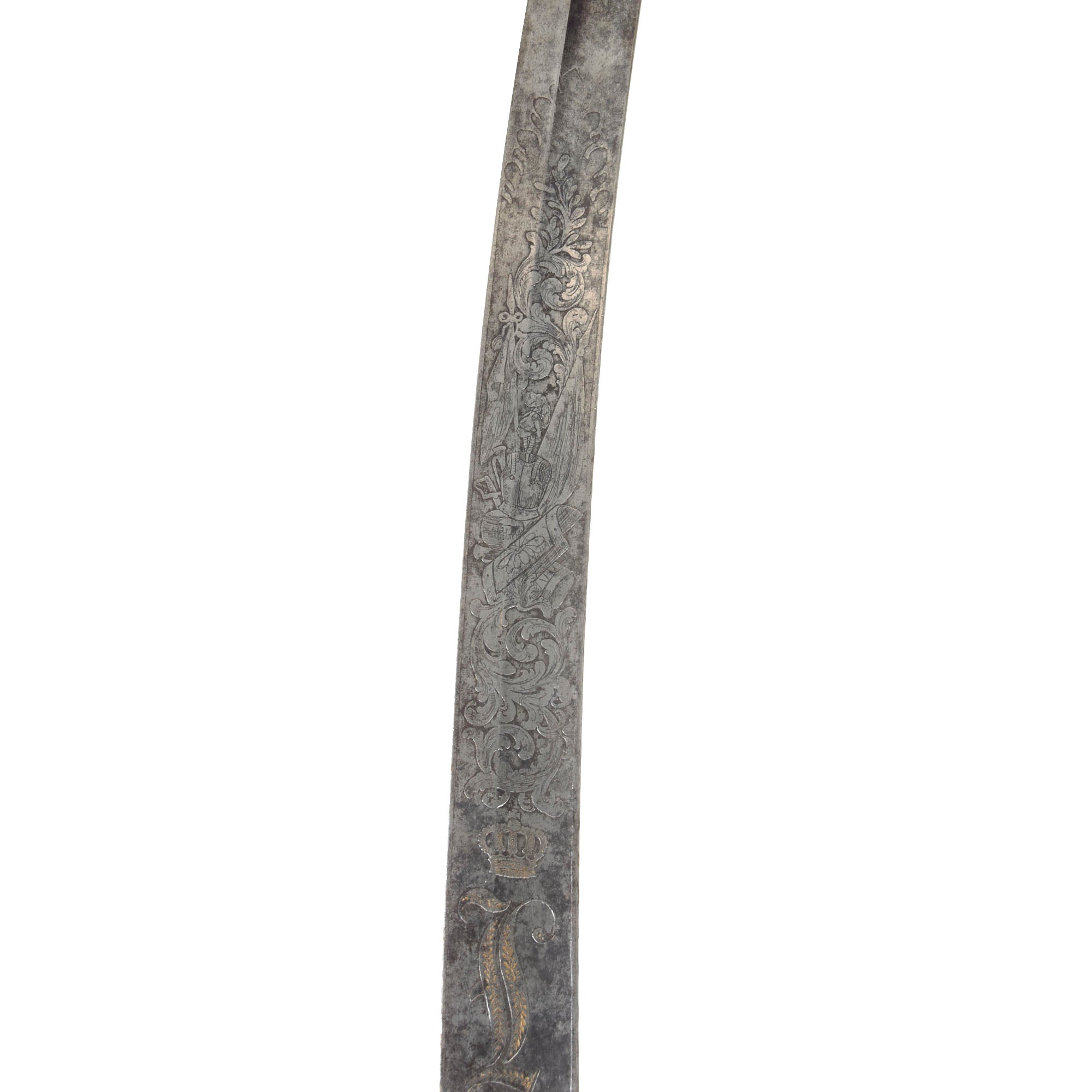 This example is in fine condition showing nice blade condition, with only a few areas of light oxidation. The blade has not been sharpened, and there are a few small nicks, but it is still quite nice. The blade is triple-etched and gold-inlaid, with glorious military motifs and the cypher of King Ludwig of Bavaria, which is how we identified the sword as Bavarian. There is no maker mark we could find, but it’s possible there is one hiding behind the chape that we just aren’t able to see.