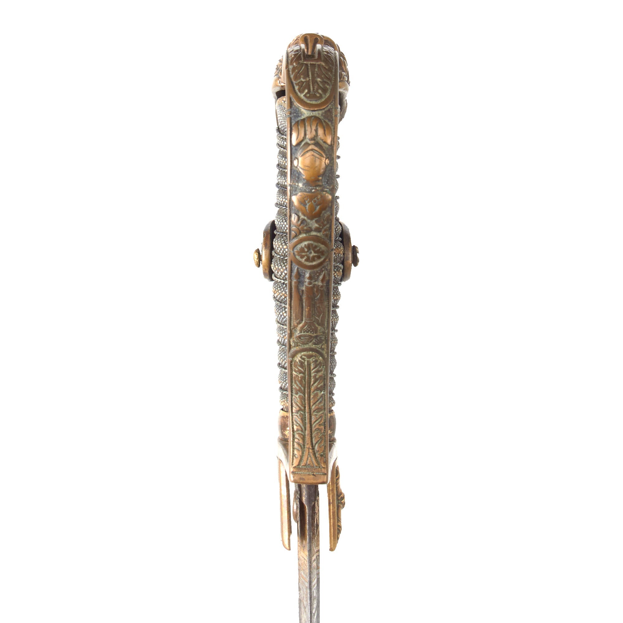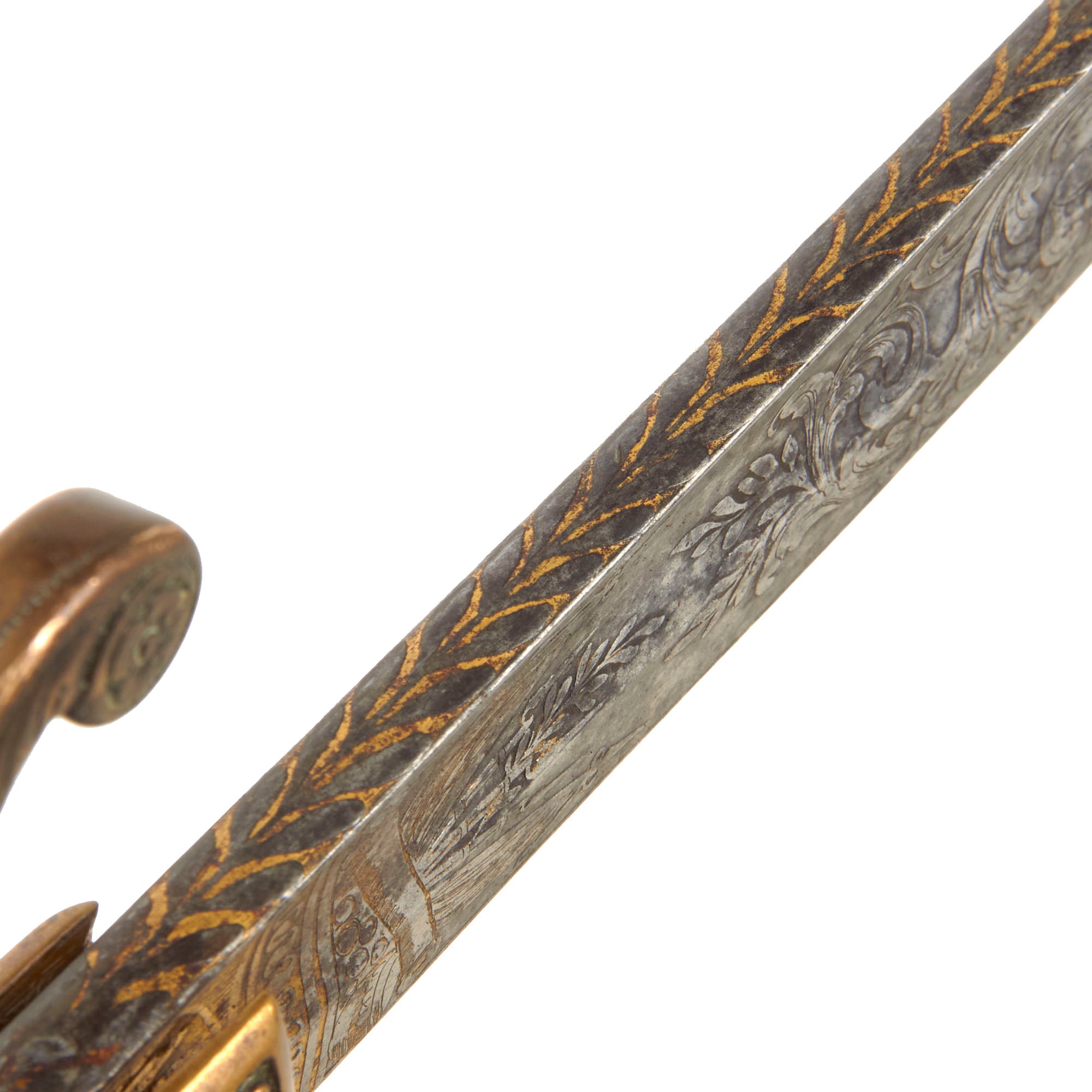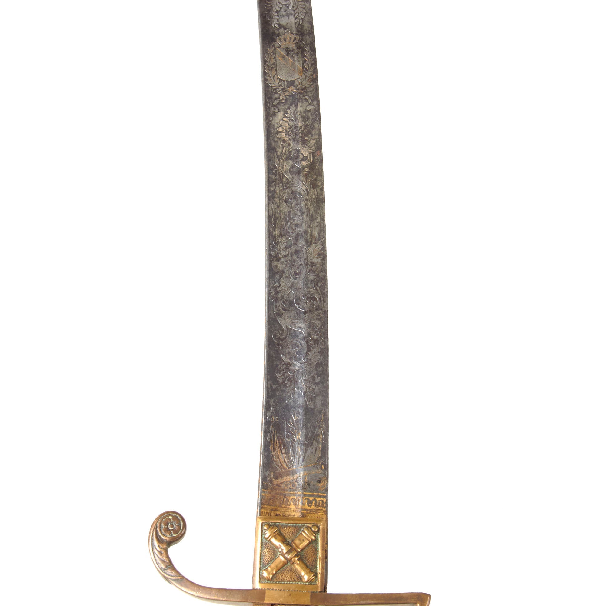 This example is in fine condition showing nice blade condition, with only a few areas of light oxidation. The blade has not been sharpened, and there are a few small nicks, but it is still quite nice. The blade is triple-etched and gold-inlaid, with glorious military motifs and the cypher of King Ludwig of Bavaria, which is how we identified the sword as Bavarian. There is no maker mark we could find, but it’s possible there is one hiding behind the chape that we just aren’t able to see.