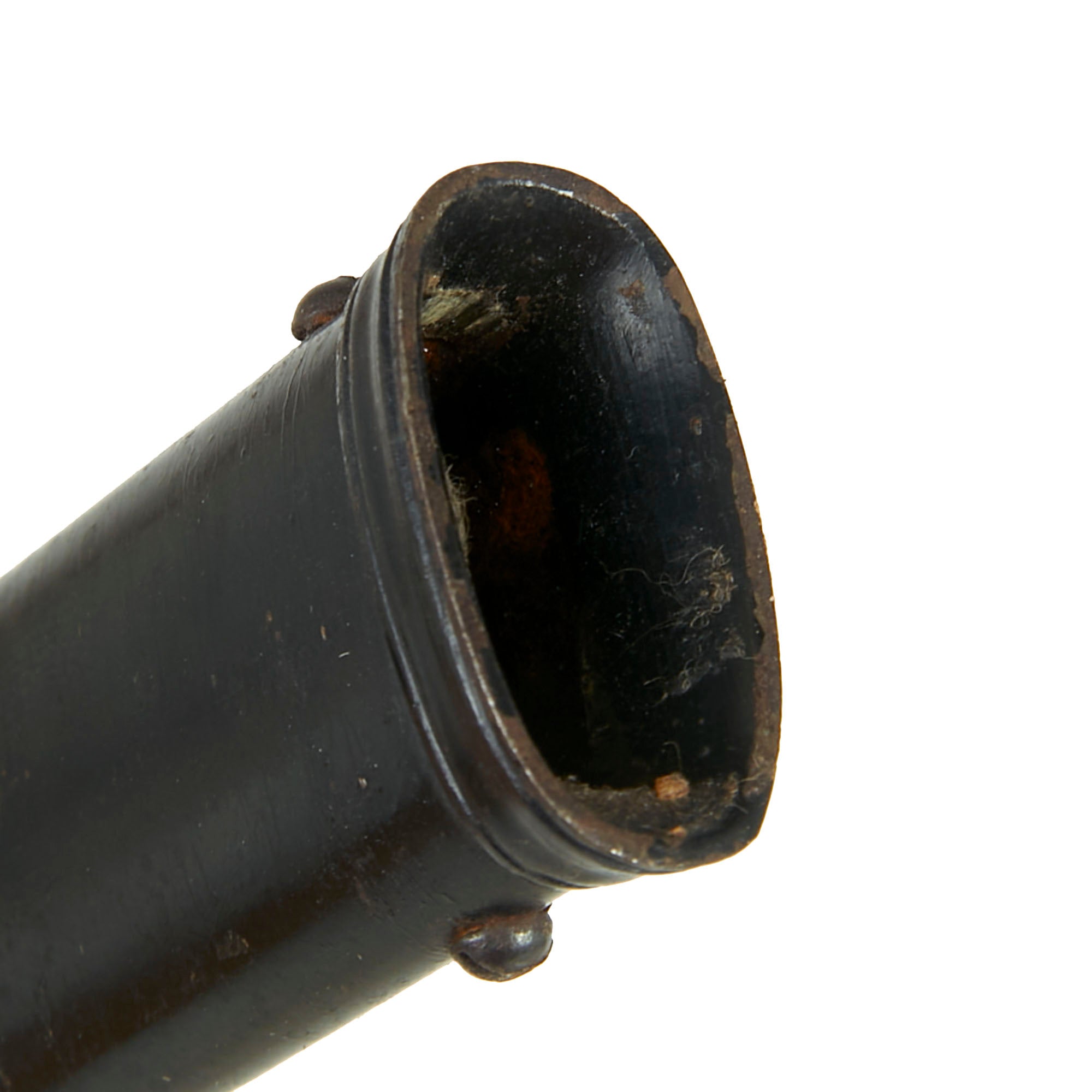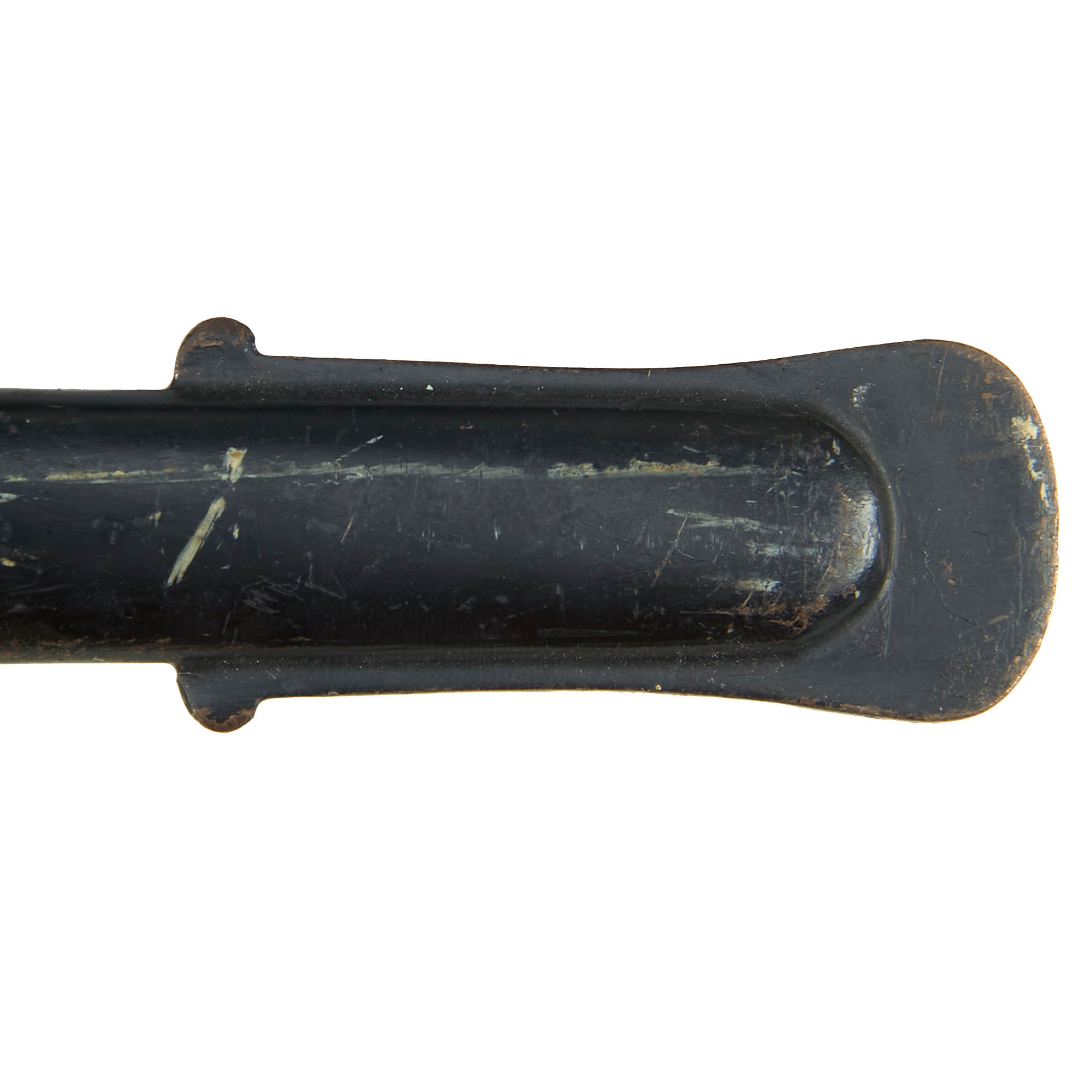 The steel scabbard has a single hanging ring, as the second fitting was for a hook on the hanger. It has the standard black enamel finish, which has worn off in some areas in the middle, and the underlying steel has oxidized. The scabbard is mostly straight, though it does have two dents on one side in the middle which do not interfere with placing the blade in the scabbard. The blade is very tight in the scabbard.