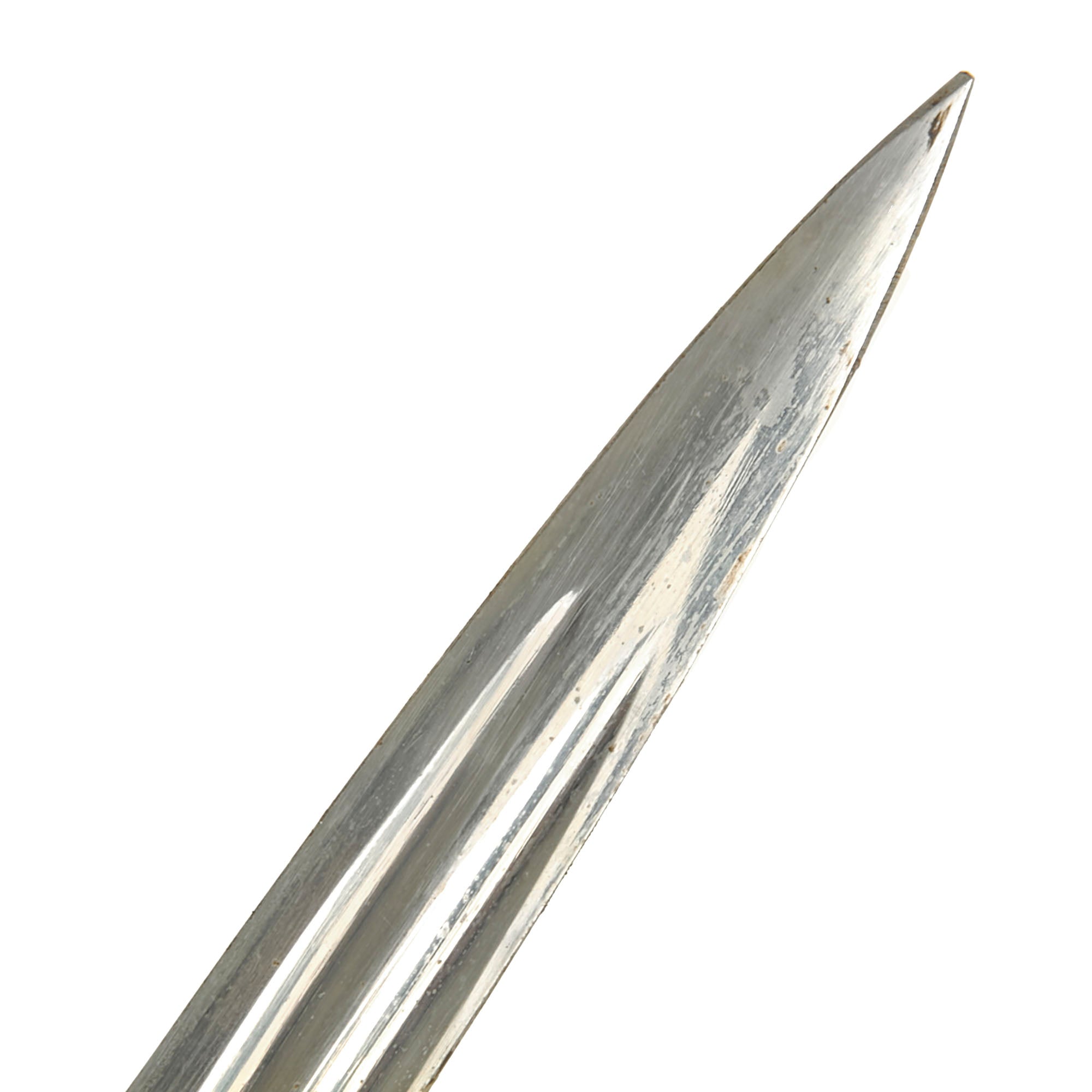 The nickel-plated straight blade is in very good condition and has a double fuller on each side. The blade is 29 1/4” inches from the spear point to the hilt. The blade has some wear to the plating with some scattered oxidation.