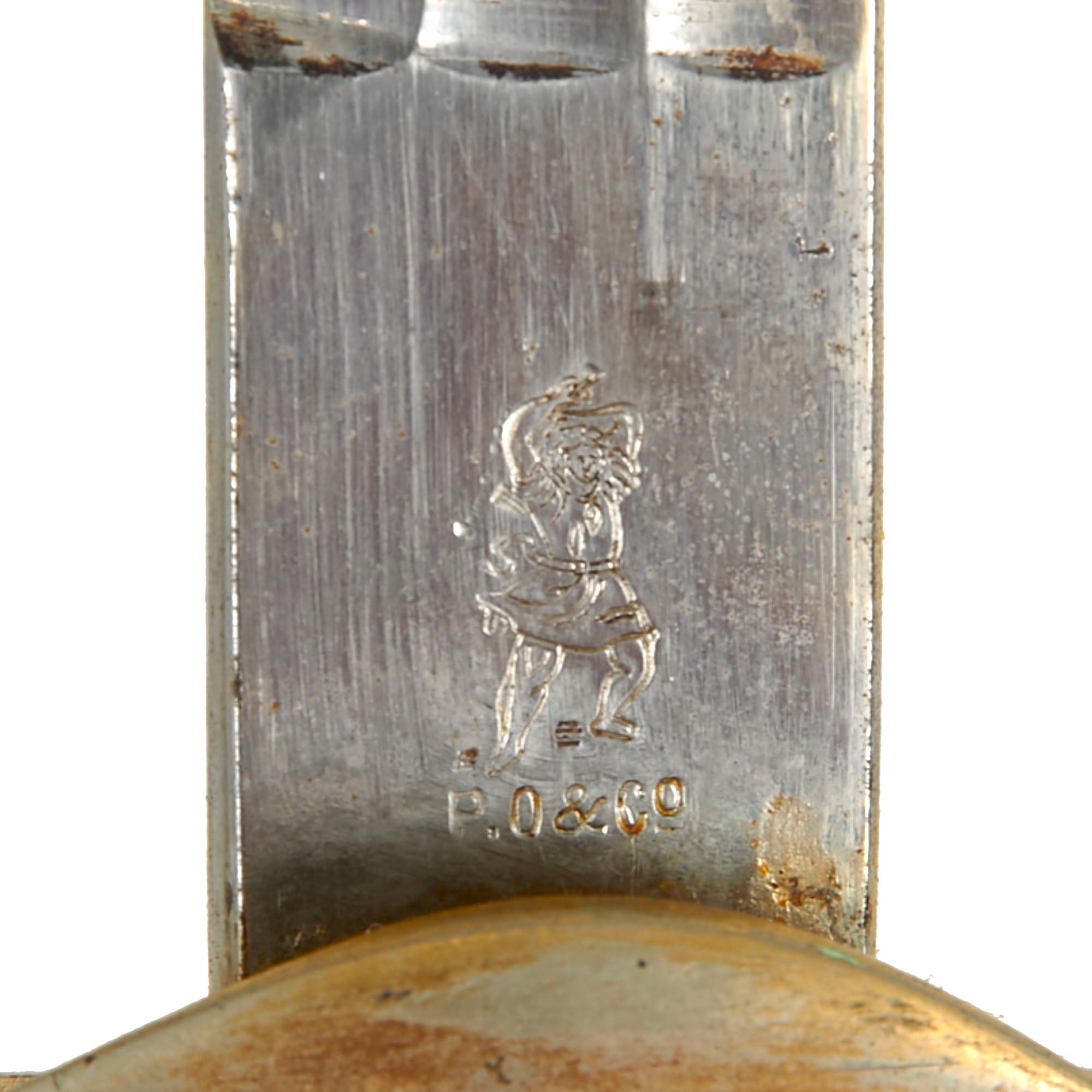 The sword ricasso is stamped with the trademark "Young Siegfried Wielding a Hammer" logo over P. O & Co., the markings used by Pack, Ohliger & Co. GmbH, Waffen - und Stahlwarenfabrik of Solingen, the legendary "City of Blades" in western Germany. This company was founded in 1910 by Friedrich Pack and Robert Ohliger and manufactured weapons and Steelware during the WWI Period. The company ceased to exist in 1922 when Ohliger left, and the company was taken over by Pack's son Ernst and his sons, forming Ernst Pack & Sohne, who continued to use the same "Young Siegfried" logo. This puts the sword FIRMLY in the WWI period. For more information please see J. Anthony Carter's find work GERMAN SWORD AND KNIFE MAKERS.