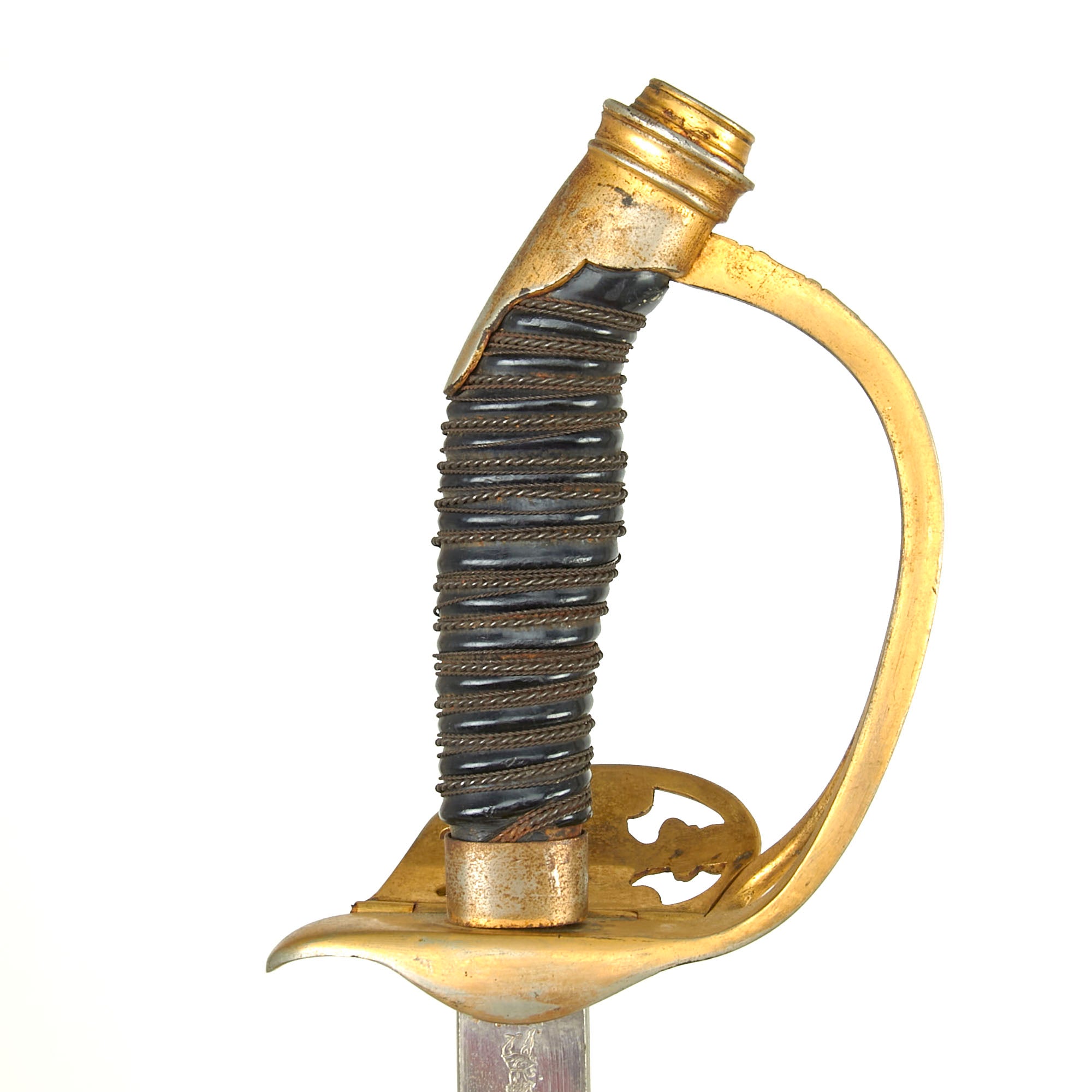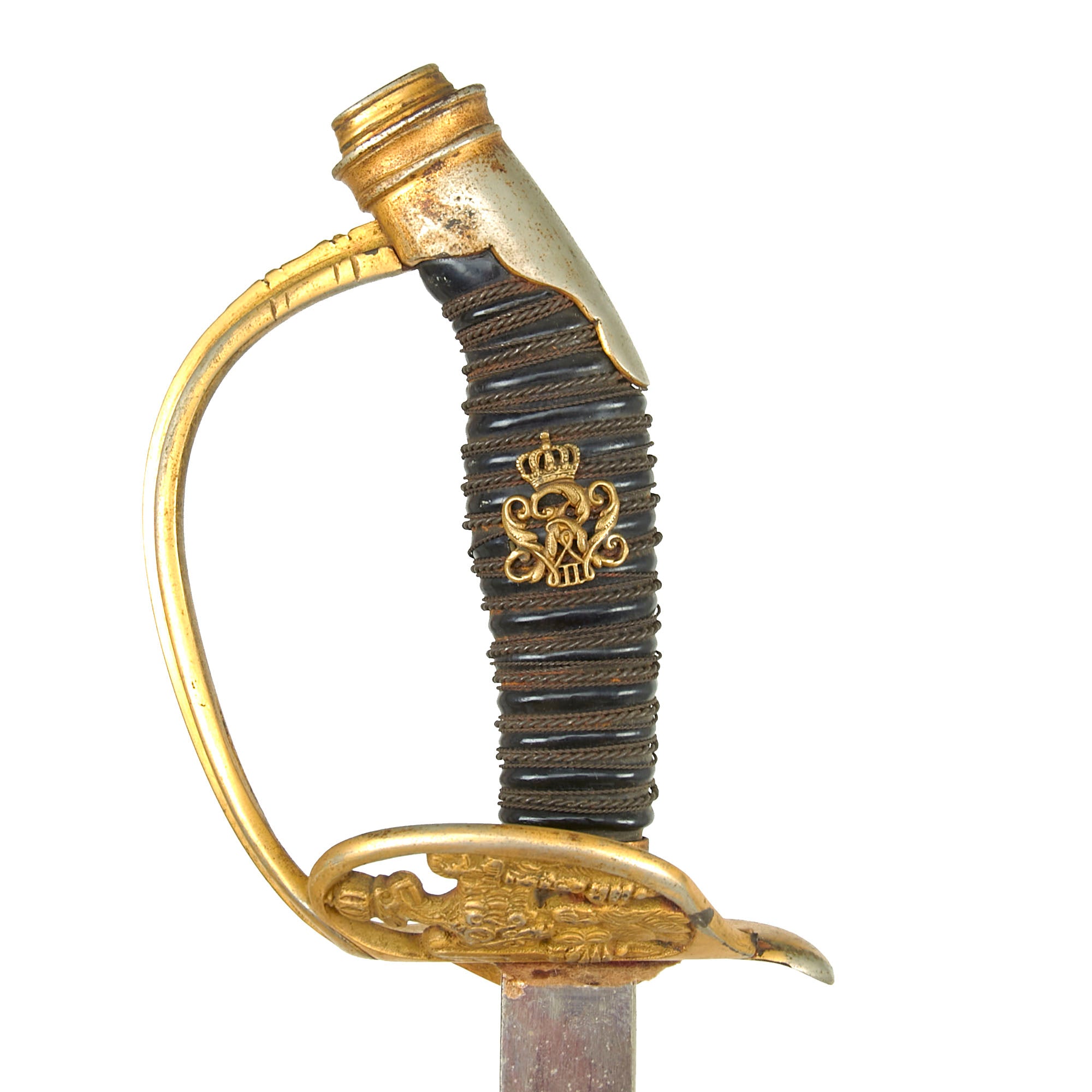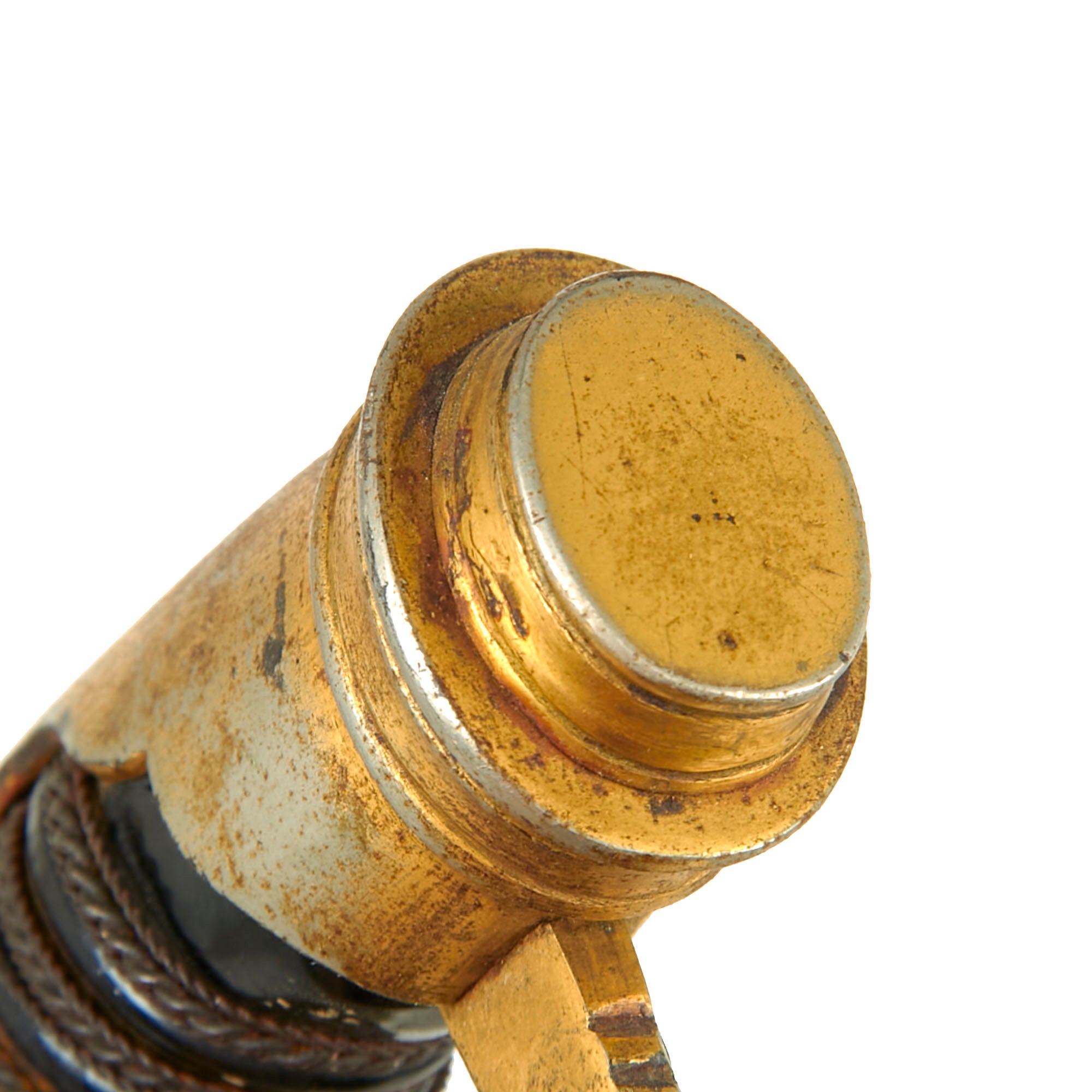 The hilt is a gilded brass “D” shape guard with the Imperial German eagle of Kaiser Wilhelm II cypher emblazoned on the grip. The Imperial Eagle portion of the guard folds in or out, depending if needed or not. The hilt overall is stunning with a gold wash on the hilt and cypher. The grip is wrapped in brass wire, bound over celluloid-covered wood. The celluloid and brass wire wrap are in good condition with the wire being loose in several places. The original leather forefinger loop on the inside of the guard is missing. This example still retains most of the leather blade washer.