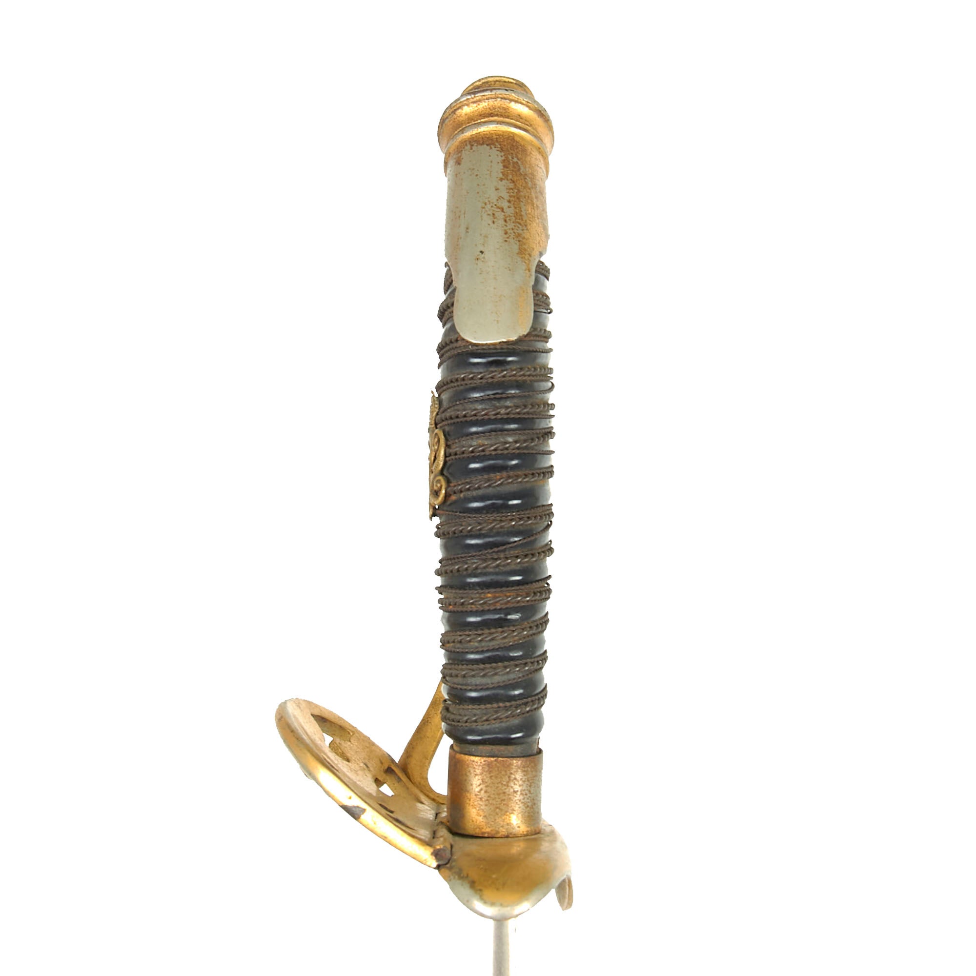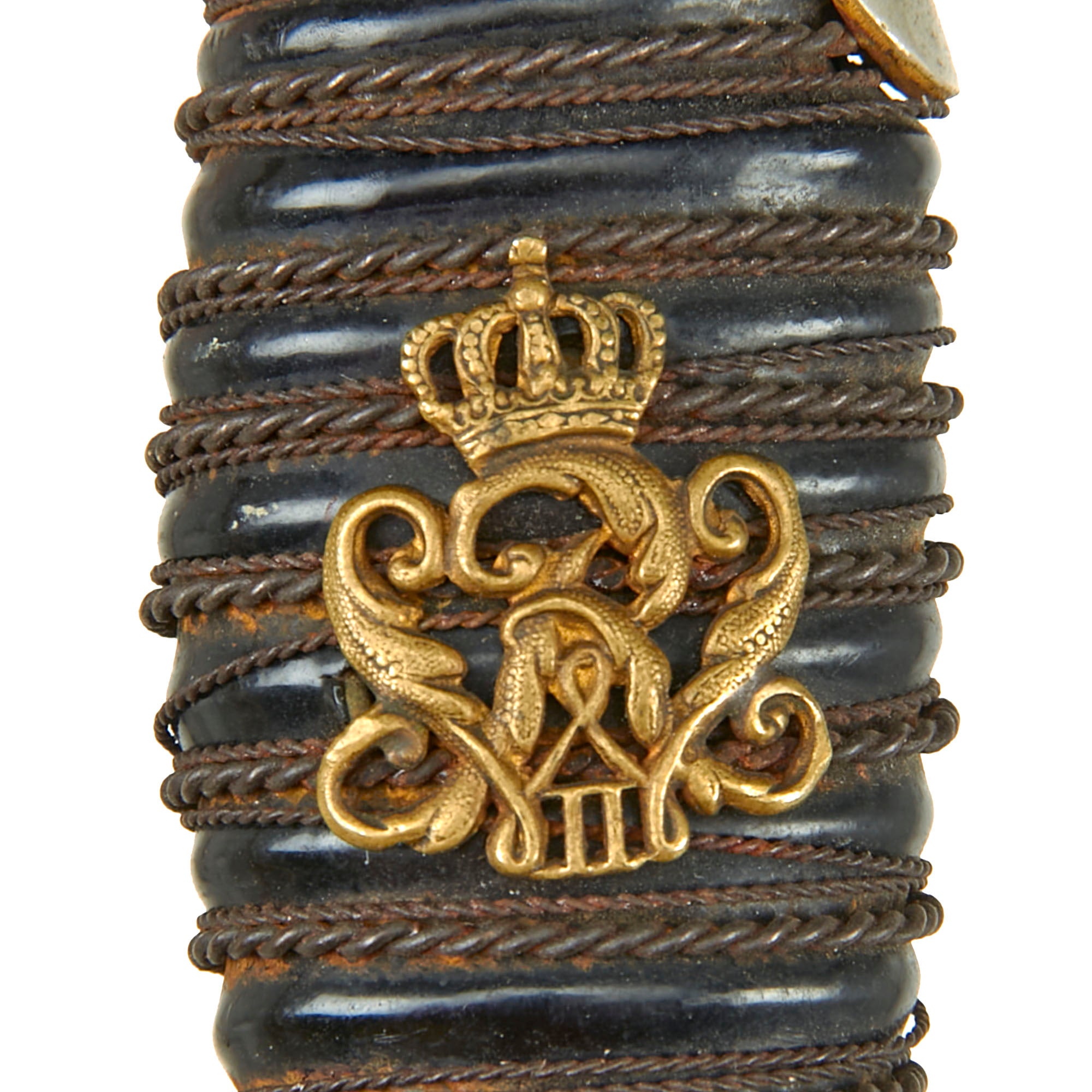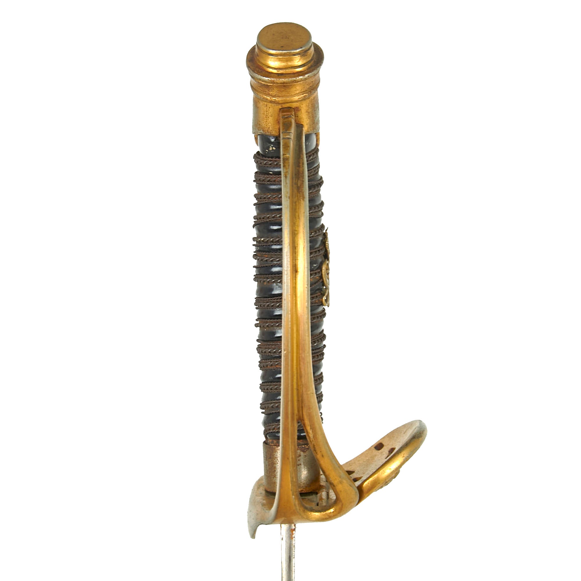 The hilt is a gilded brass “D” shape guard with the Imperial German eagle of Kaiser Wilhelm II cypher emblazoned on the grip. The Imperial Eagle portion of the guard folds in or out, depending if needed or not. The hilt overall is stunning with a gold wash on the hilt and cypher. The grip is wrapped in brass wire, bound over celluloid-covered wood. The celluloid and brass wire wrap are in good condition with the wire being loose in several places. The original leather forefinger loop on the inside of the guard is missing. This example still retains most of the leather blade washer.
