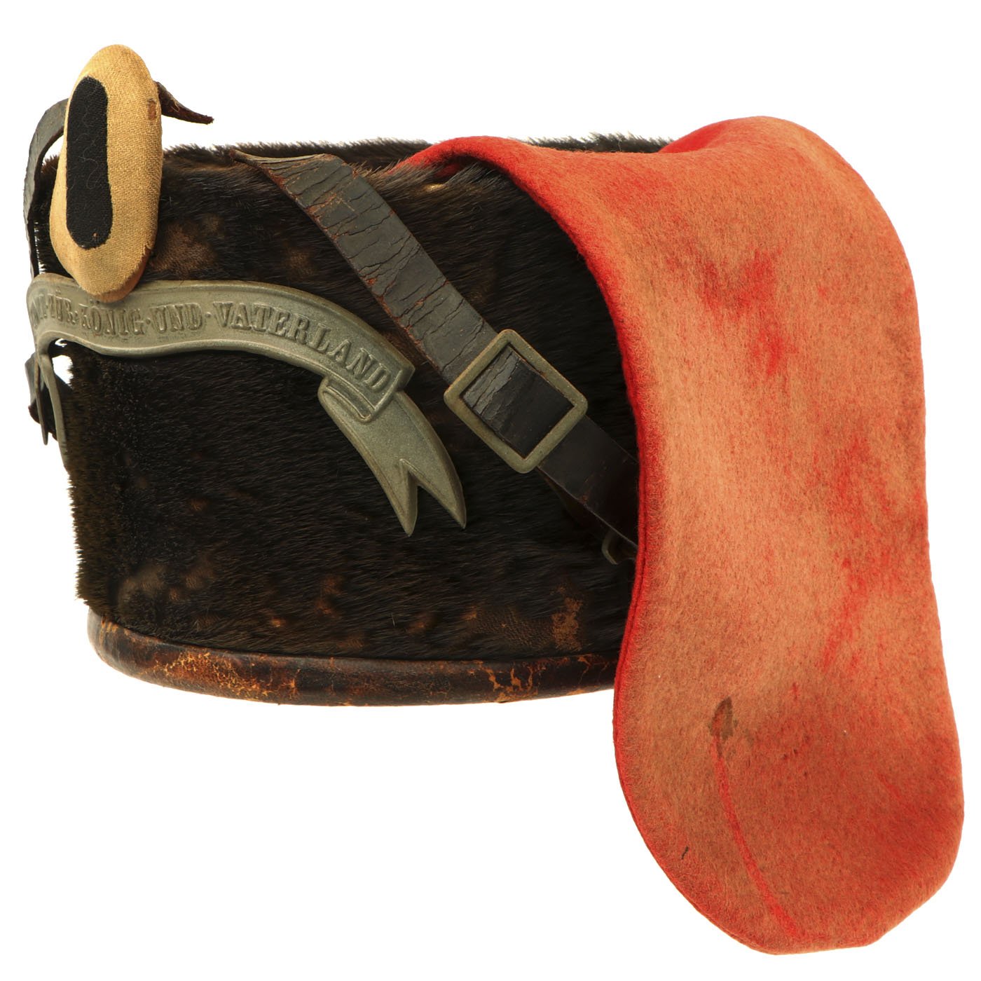 After this time the size and design were scaled down, and they became much more for looks than for actual protection. This example is very similar to the British Busby used by Hussars, but is definitely German. The exterior bearskin wrap shows it's 100+ year age and the helmet comes with its red slouch bag hanging over the left ear. On the front is a banner helmet plate with the Prussian Motto MIT GOTT FÜR KÖNIG UND VATERLAND (With God for King and Country, i.e. Prussia) on it. The busby comes complete with its steel fit leather chinstrap, indicating EM/NCO issue, still attached to the side lugs. Unfortunately however the chin strap is broken near the middle where it hangs over the top of the busby.
