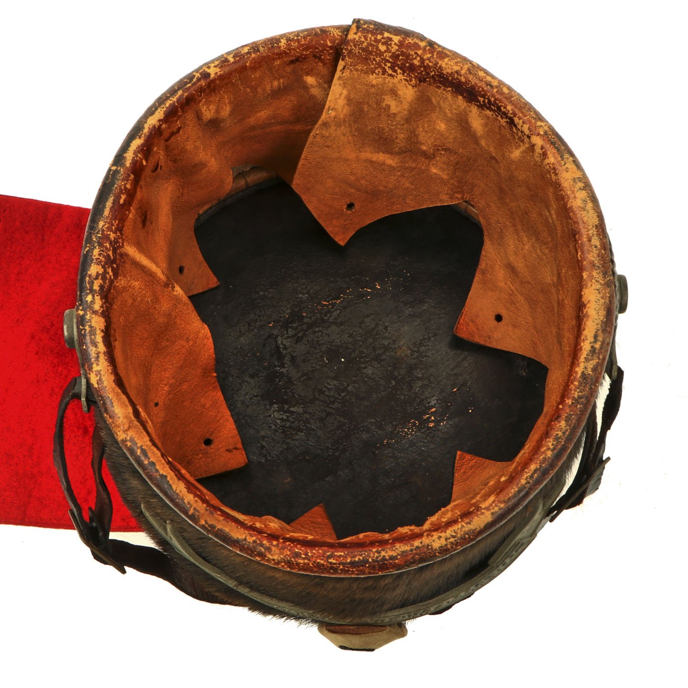It is complete with a Prussian (black and white) cockade attached to the center top of the helmet,and German National Colors (red white and black) Kokarden (cockades) around the right side chin strap lug. In 1897 the new Reichs-Kokarde in Red-White-Black was introduced for all ranks to commemorate the 100th anniversary of the birth of Kaiser Wilhelm 1st. The Reichs-Kokarde was to be worn on the right side of headwear, around the chinstrap lug. As the busby and Tschako have the state cockade on the top of the helmet, they did not have to move it from the right to left lug.