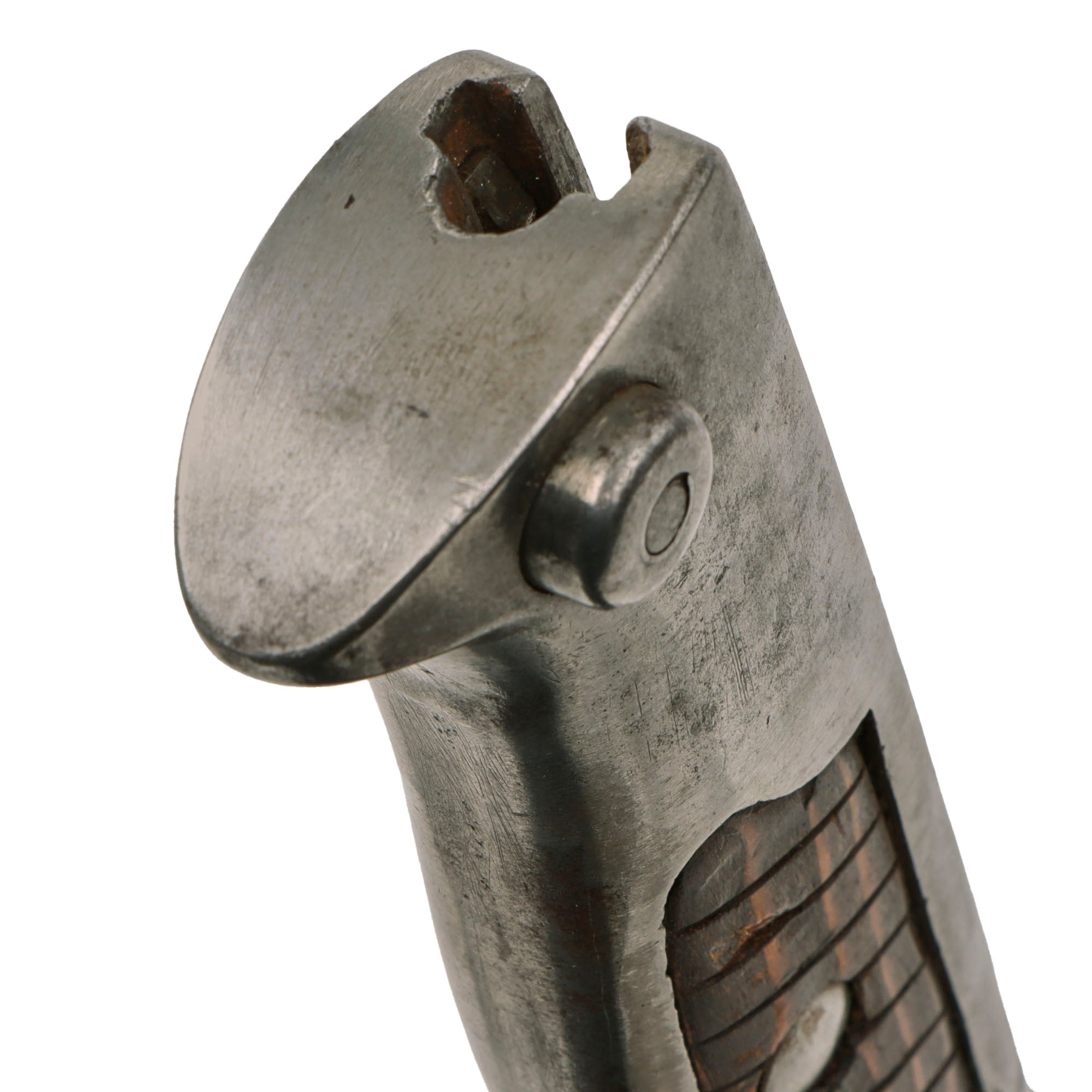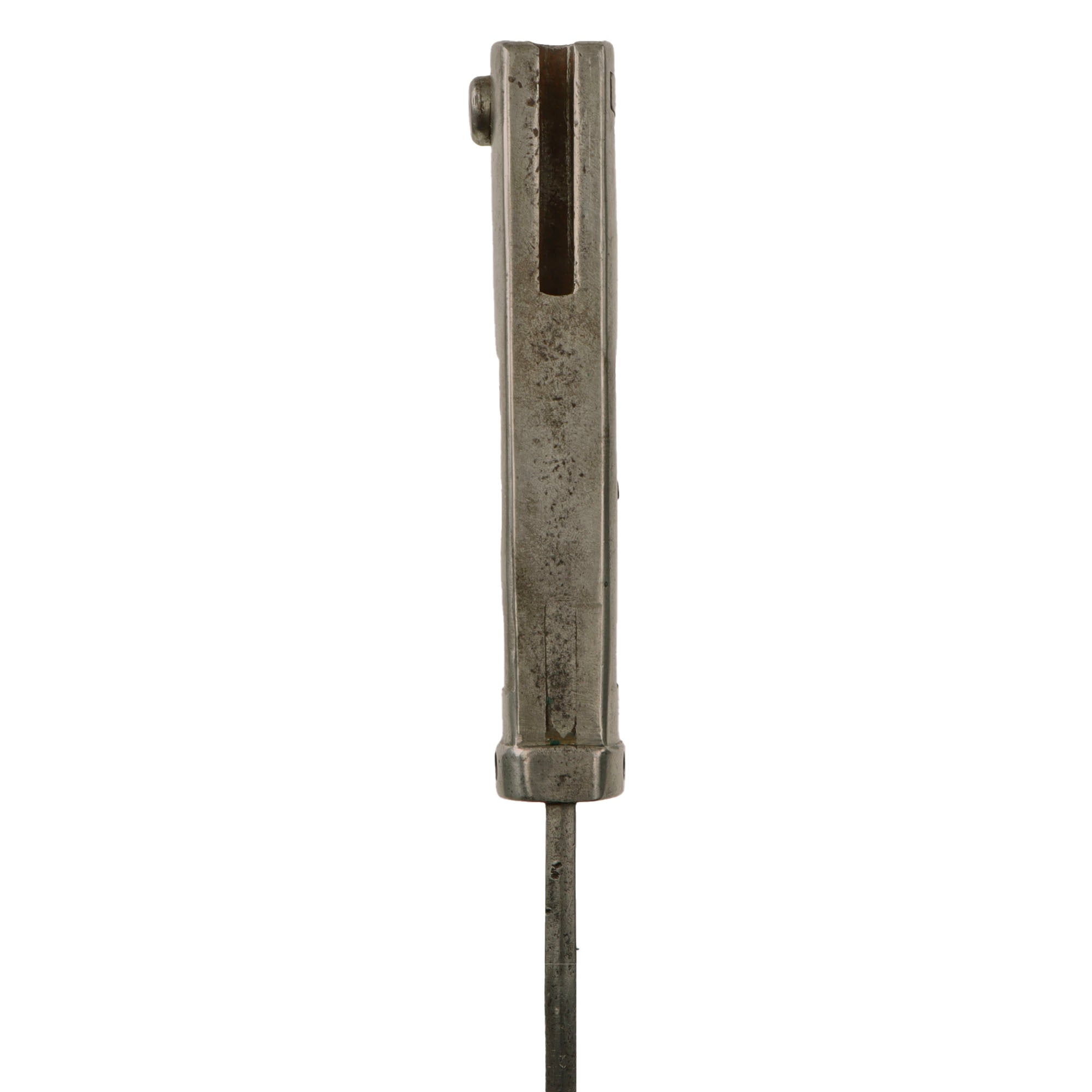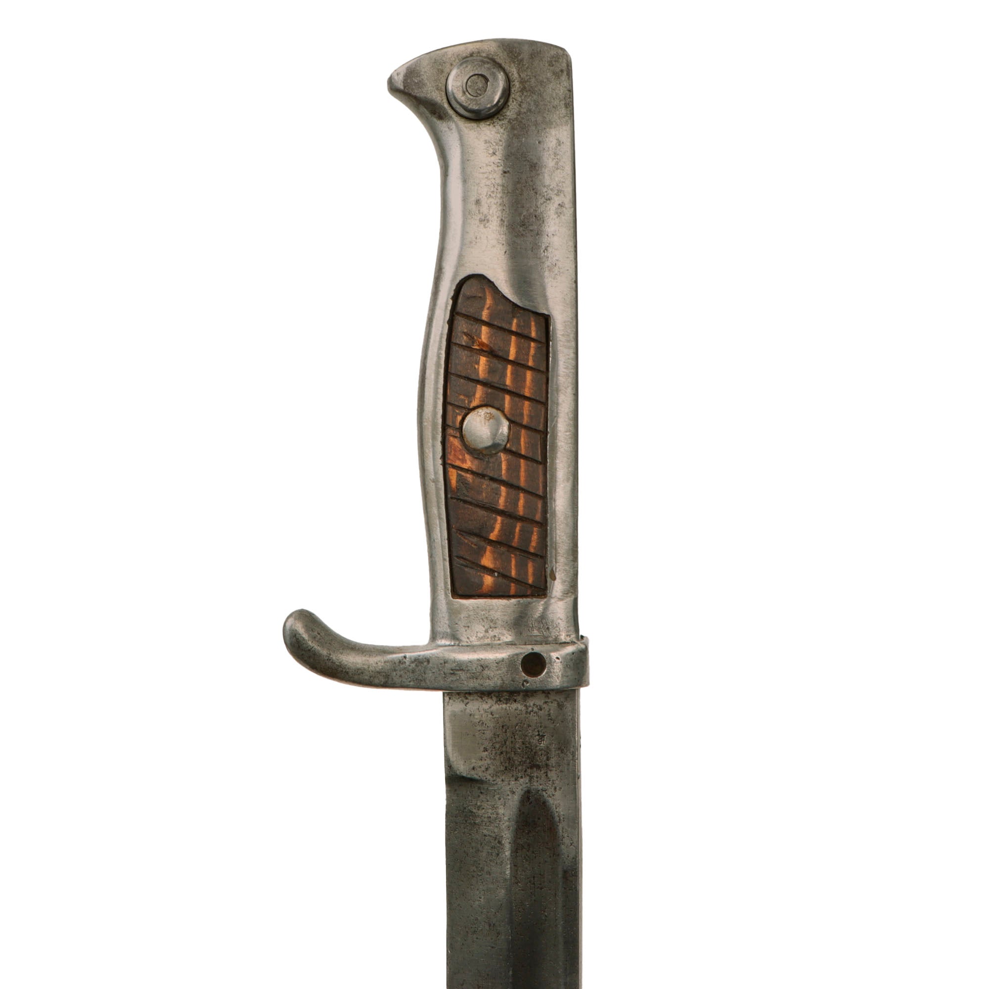 The use of wood for the grips gives the impression of a finely made item but, in my opinion, it was more of a weight saving device, the hilt was cast iron. Many ersatz bayonets were made with grips of solid cast iron or brass and are much heavier than those made with sheet metal grips, adding considerably to the weight the soldier has to carry. This example still retains the lovely fluted wooden inlaid grips. The 12 ¼” blade shows good service wear with peppered oxidation and a fuller on both sides near the spine. The overall length is roughly 17”.