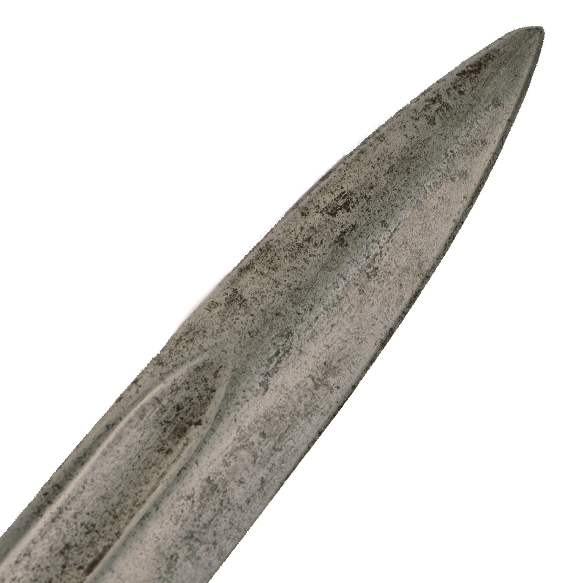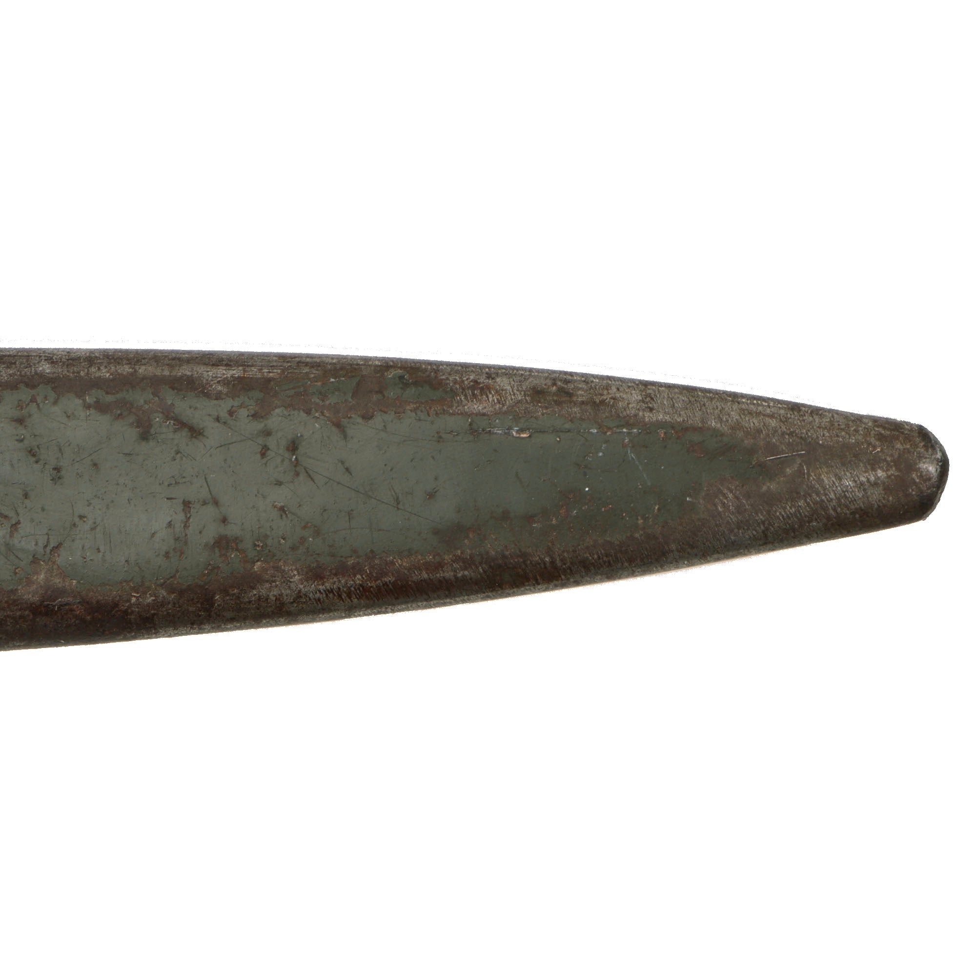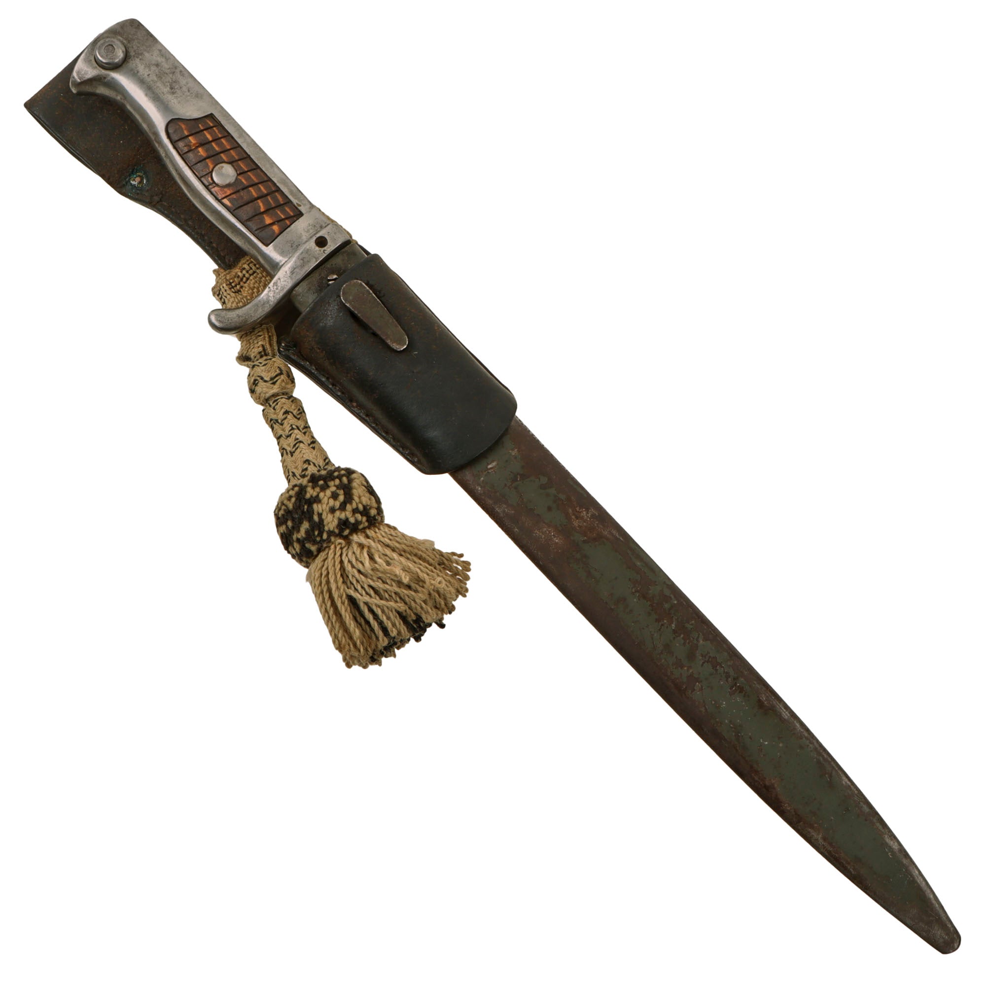 The use of wood for the grips gives the impression of a finely made item but, in my opinion, it was more of a weight saving device, the hilt was cast iron. Many ersatz bayonets were made with grips of solid cast iron or brass and are much heavier than those made with sheet metal grips, adding considerably to the weight the soldier has to carry. This example still retains the lovely fluted wooden inlaid grips. The 12 ¼” blade shows good service wear with peppered oxidation and a fuller on both sides near the spine. The overall length is roughly 17”.