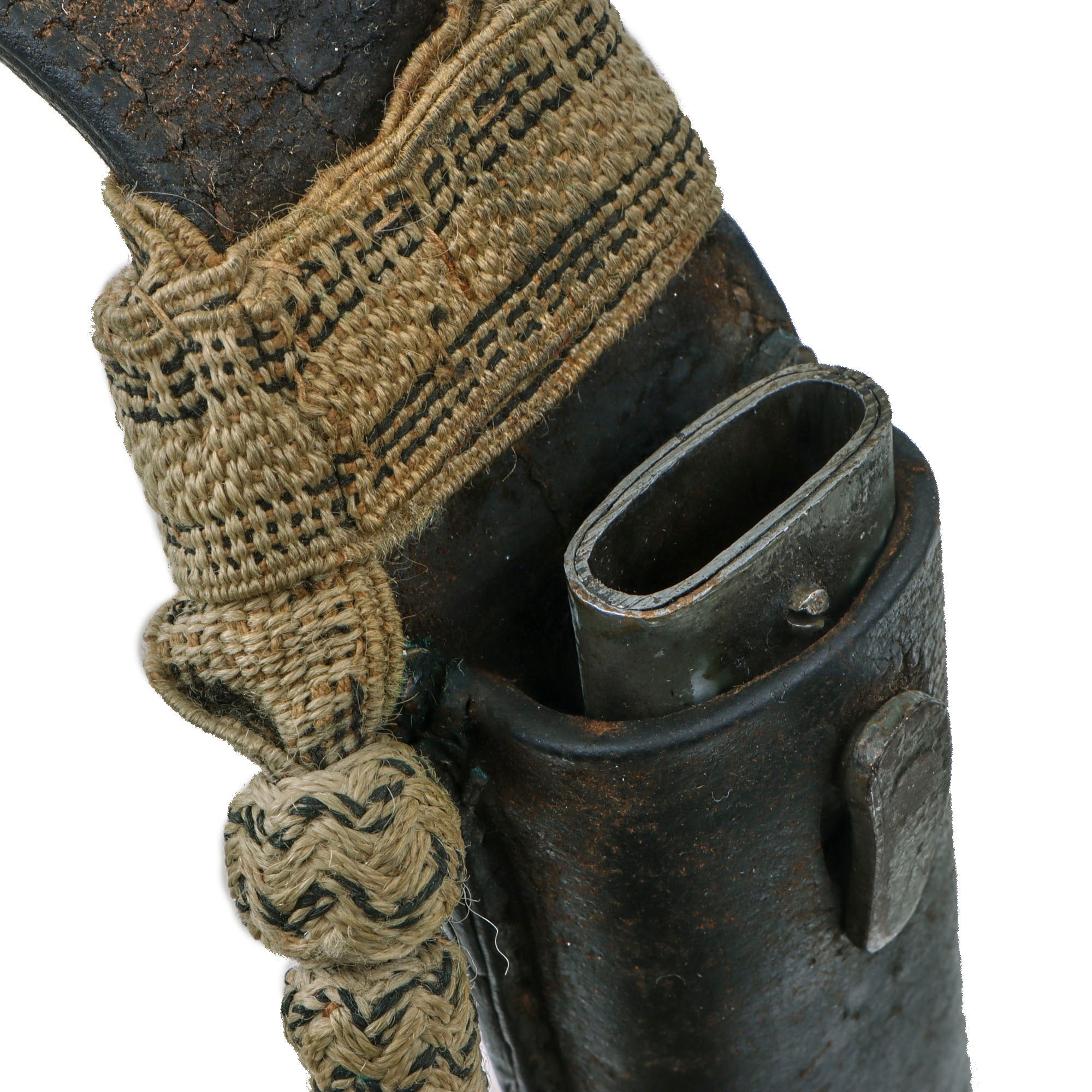 This example is housed in the correct scabbard with some of the feldgrau paint still retained but most has worn away. It is held in a great period frog which is stamped on the back “BJ / Co. 1 J”. Attached to the frog throat is a great troddel knot with Prussian colors still in great condition without much serious fraying.