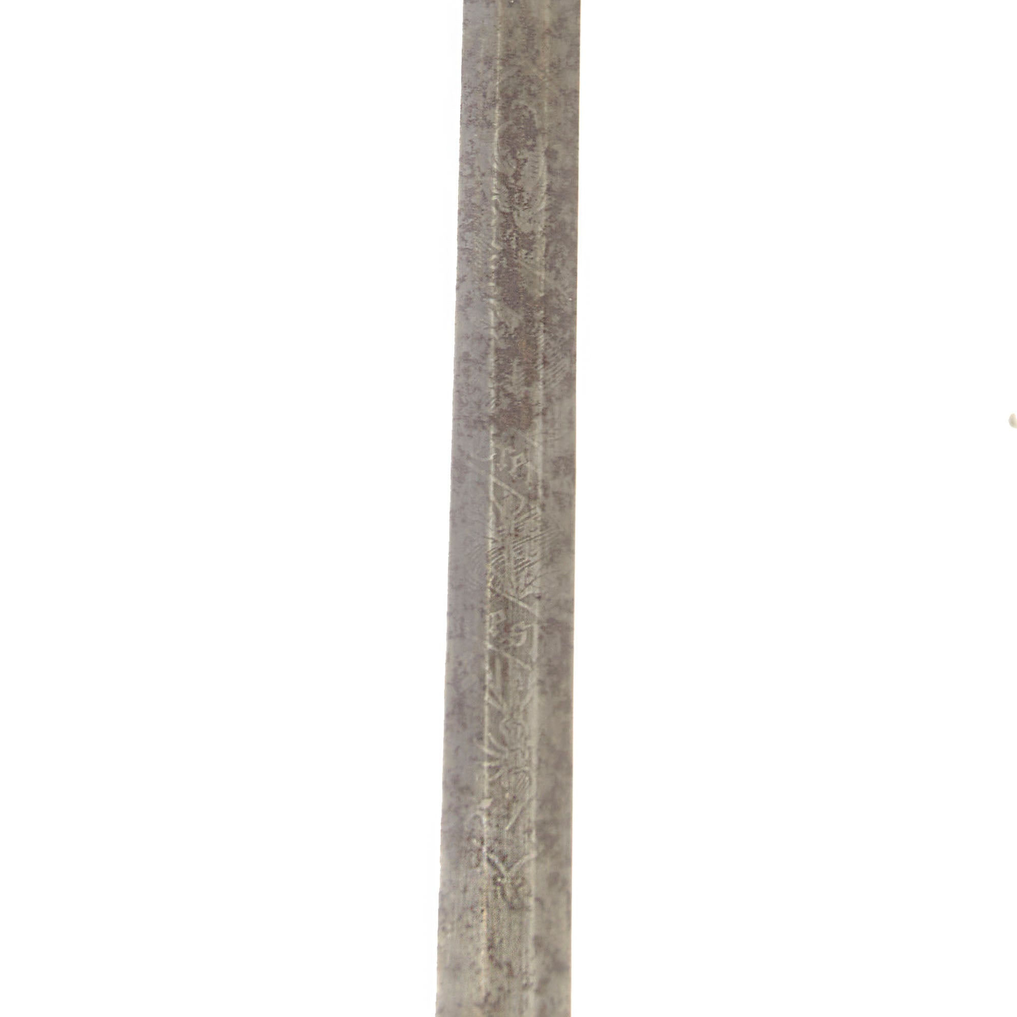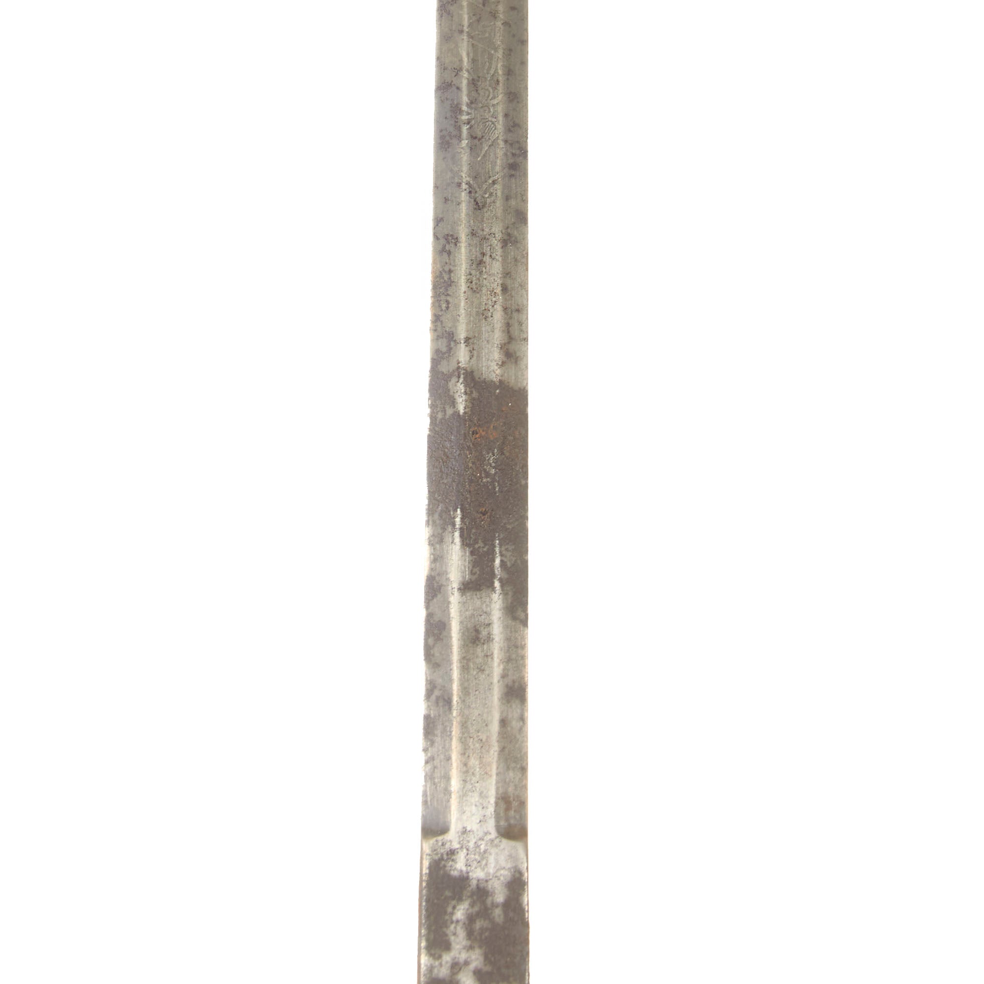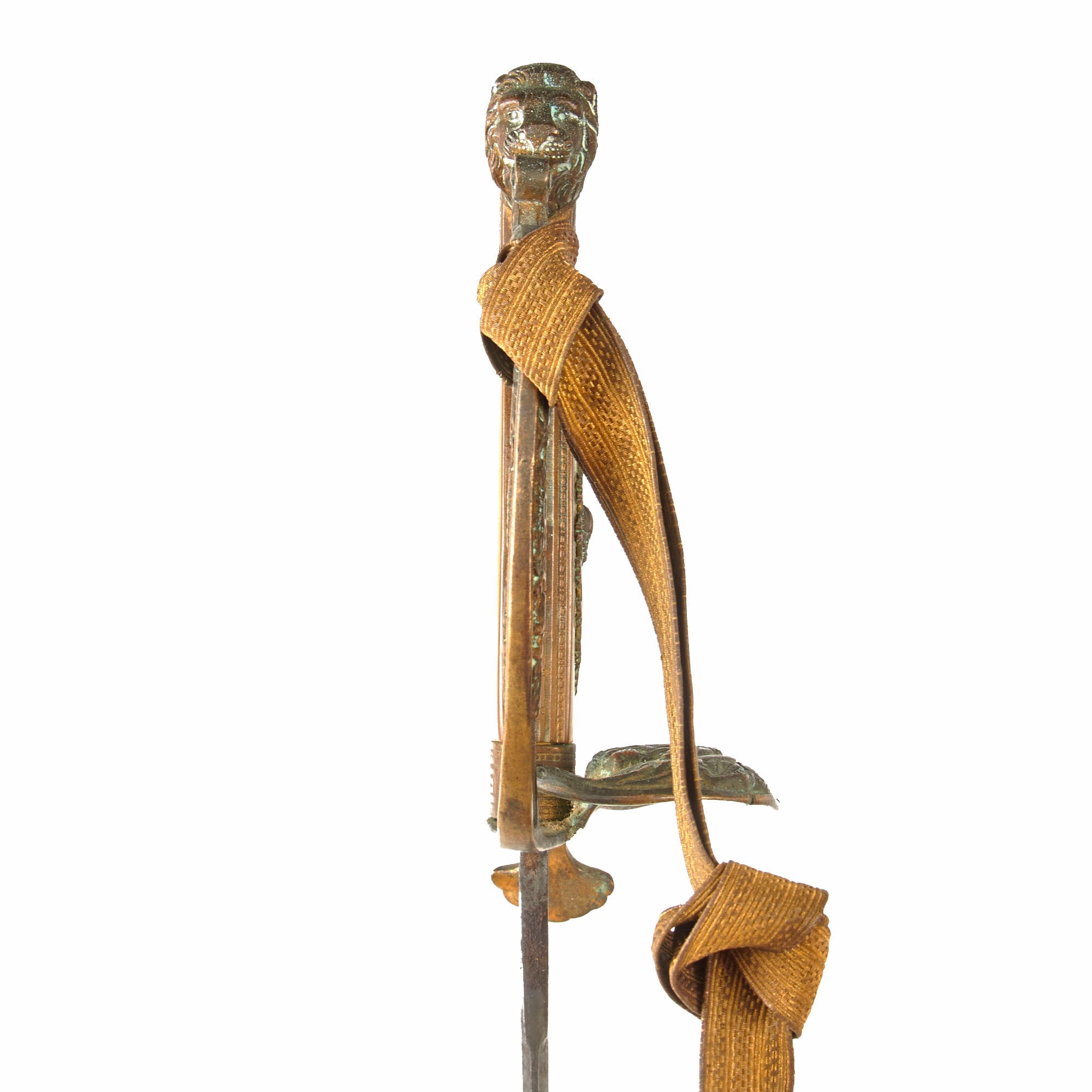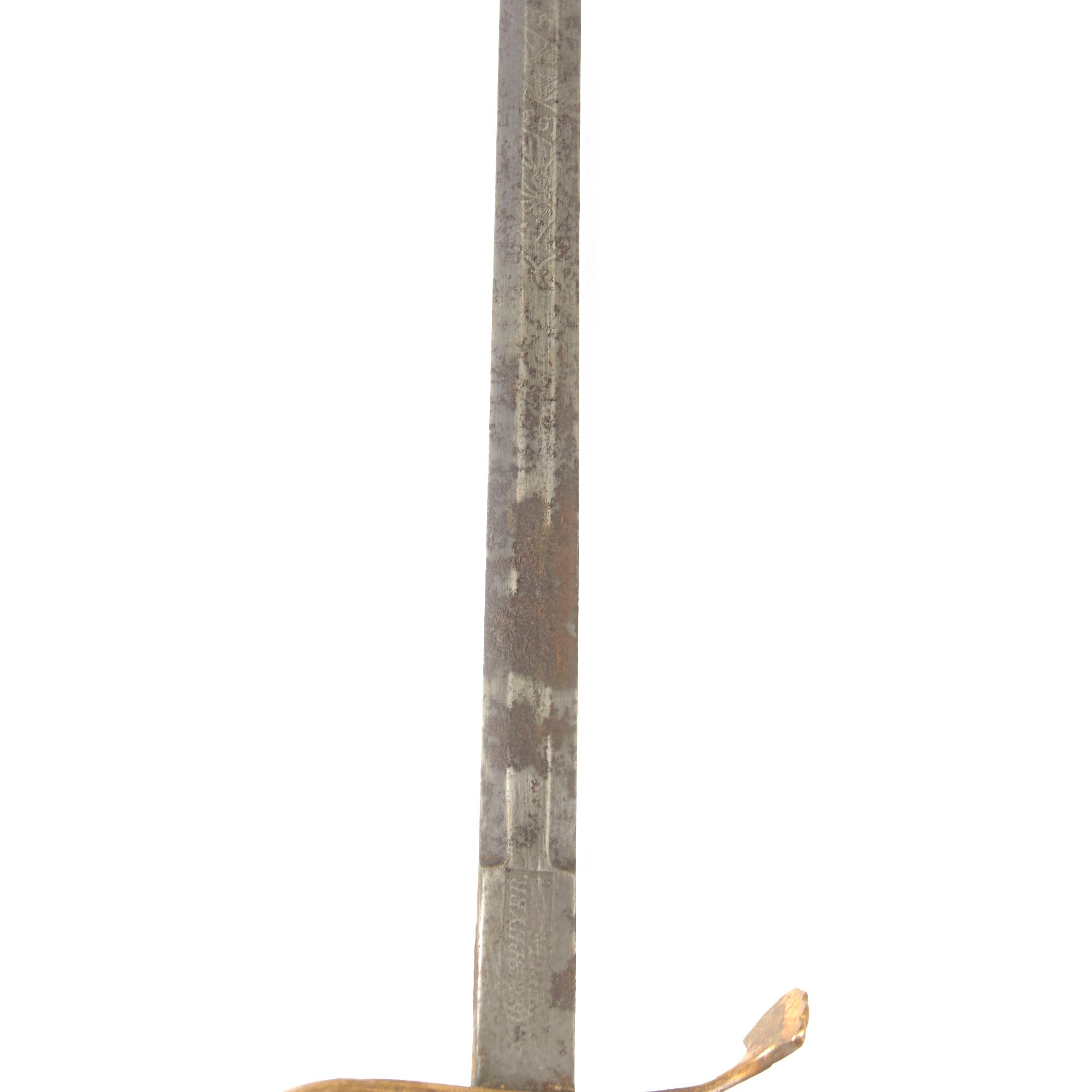 The 30 ¾” blade bears the motto IN TREUE FEST surrounded by decorative border and foliage on both sides, though the blade now has very heavy oxidation across its length with some edge chipping and staining. The entire sword has a very heavy patina as shown. The overall length is 36”. The hilt has a heavy brass chape to one side with a lion and foliage, also covered in verdigris. The blade buffer is gone but the hilt is tight.