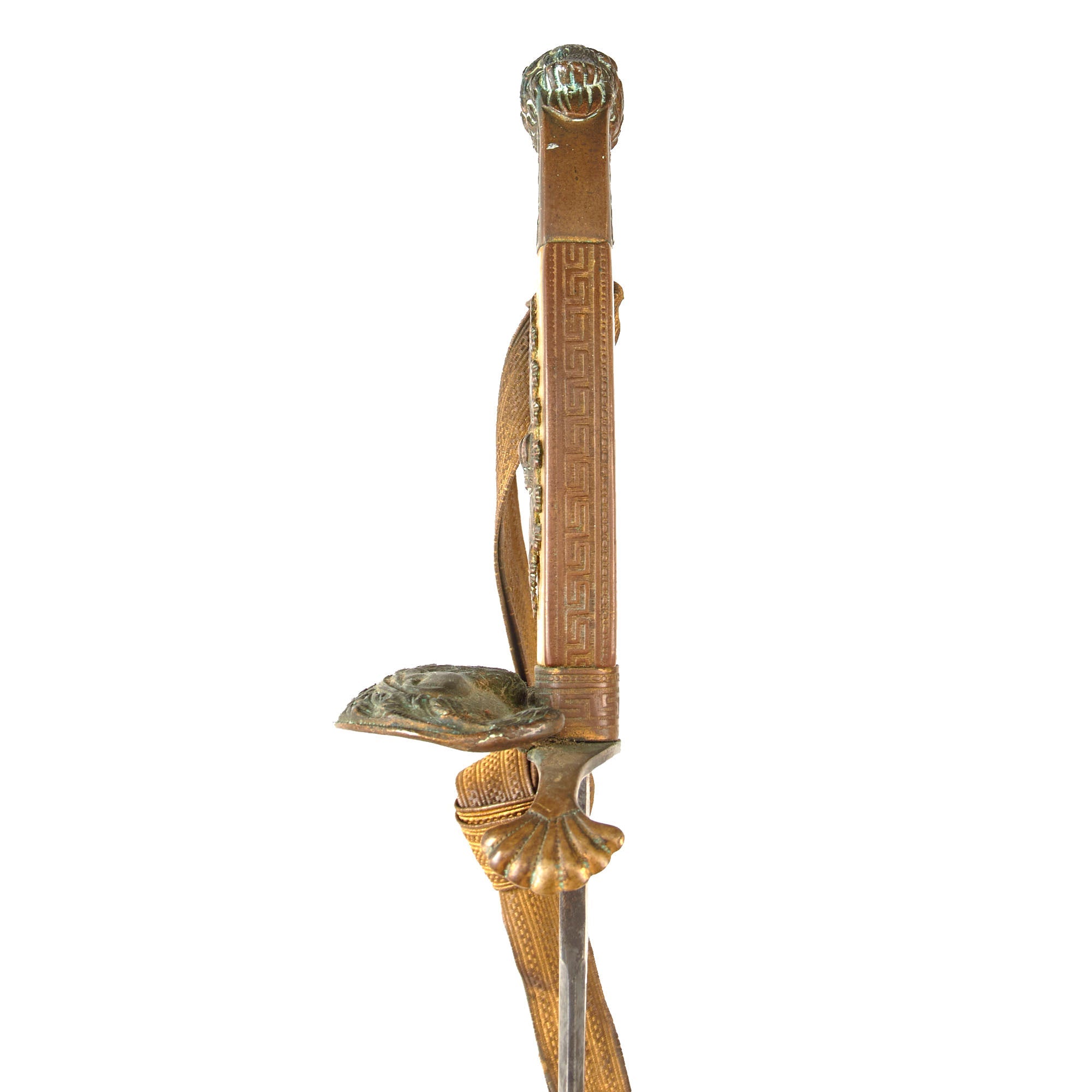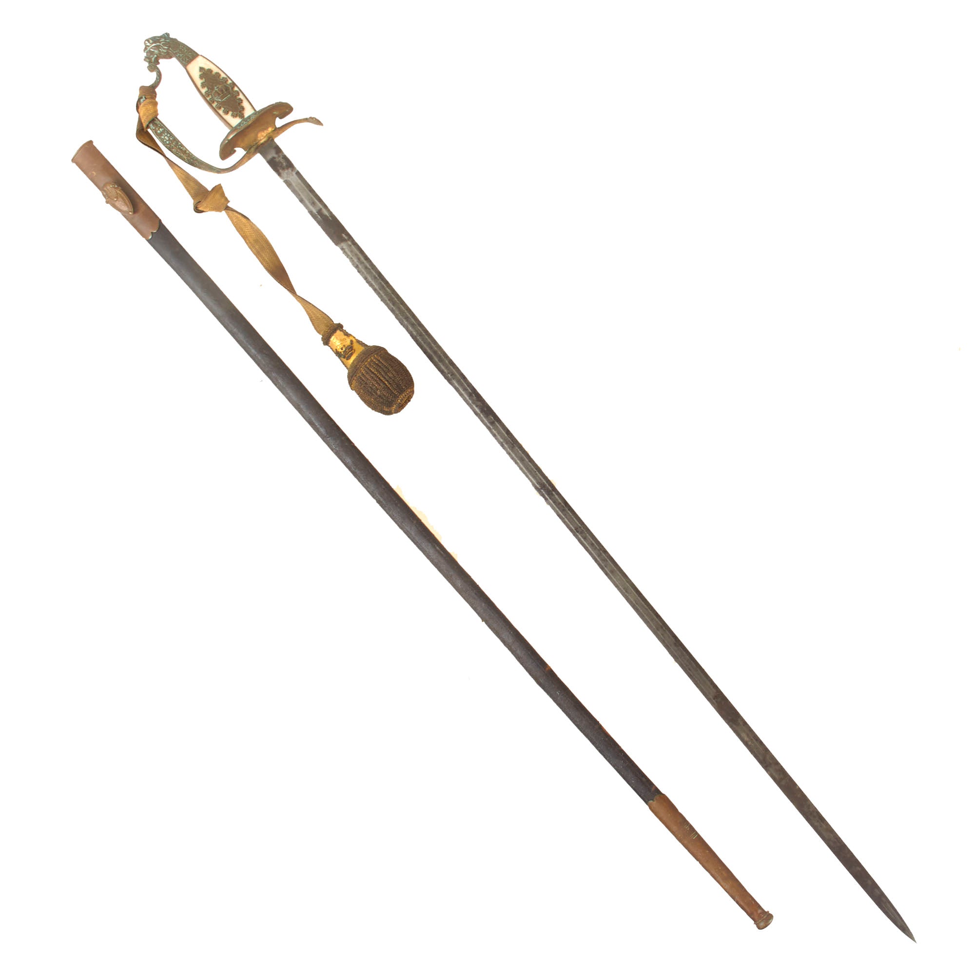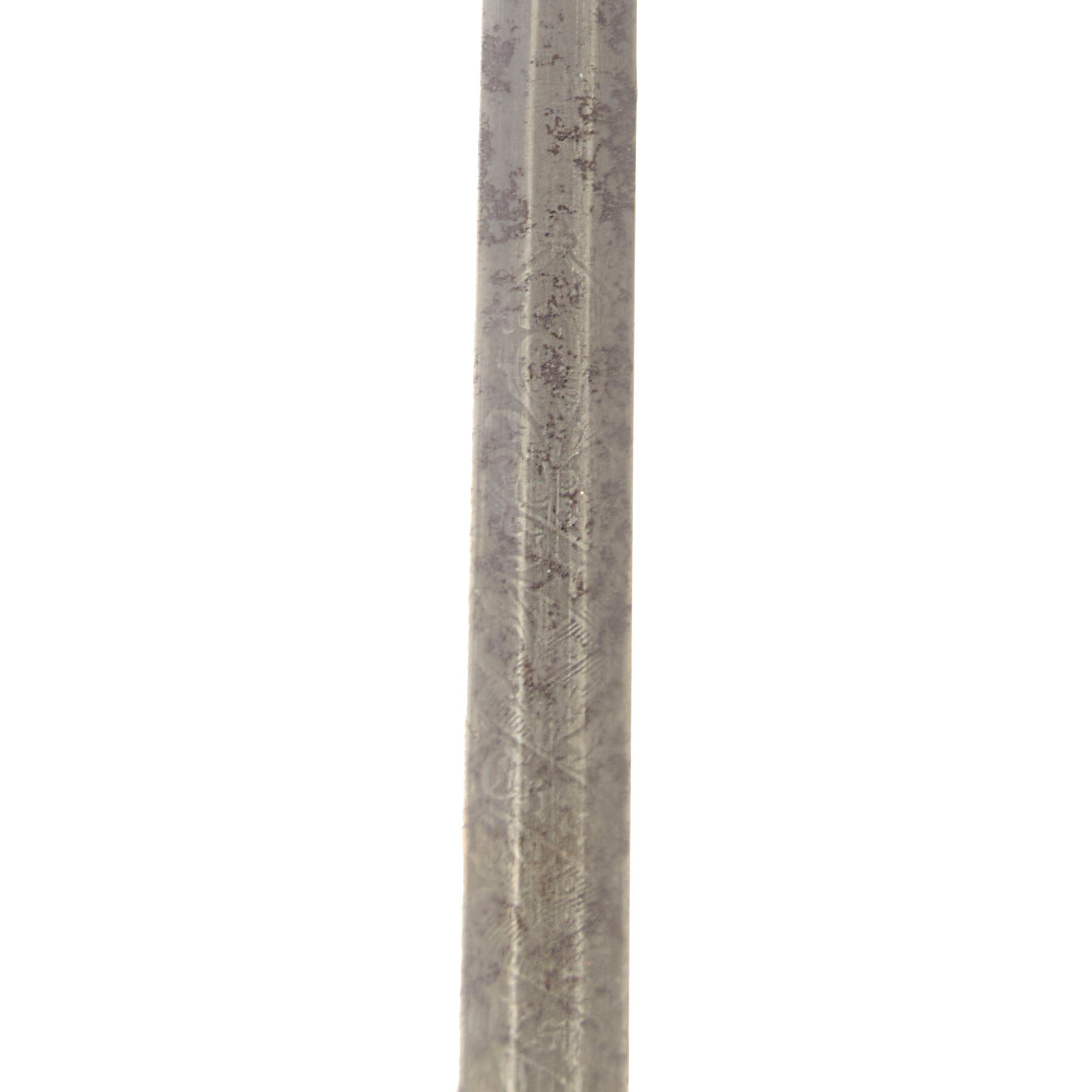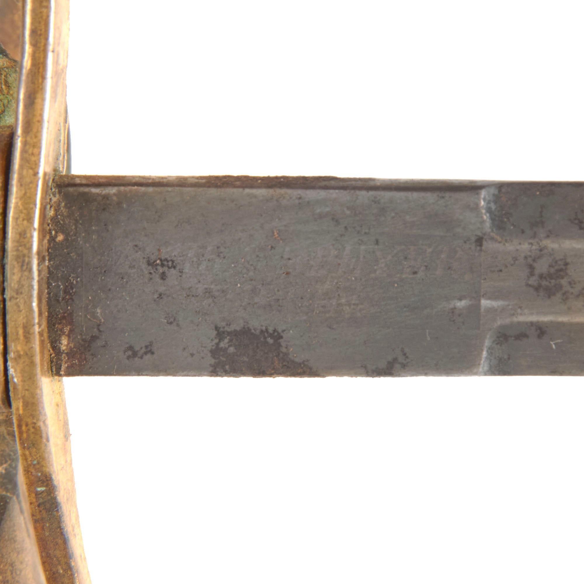 The 30 ¾” blade bears the motto IN TREUE FEST surrounded by decorative border and foliage on both sides, though the blade now has very heavy oxidation across its length with some edge chipping and staining. The entire sword has a very heavy patina as shown. The overall length is 36”. The hilt has a heavy brass chape to one side with a lion and foliage, also covered in verdigris. The blade buffer is gone but the hilt is tight.