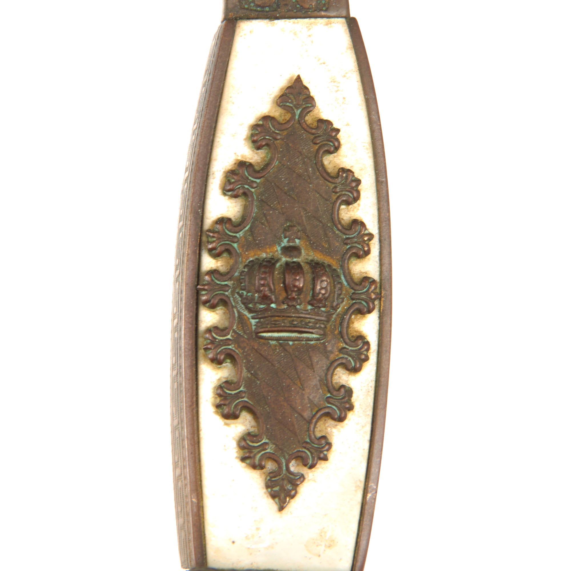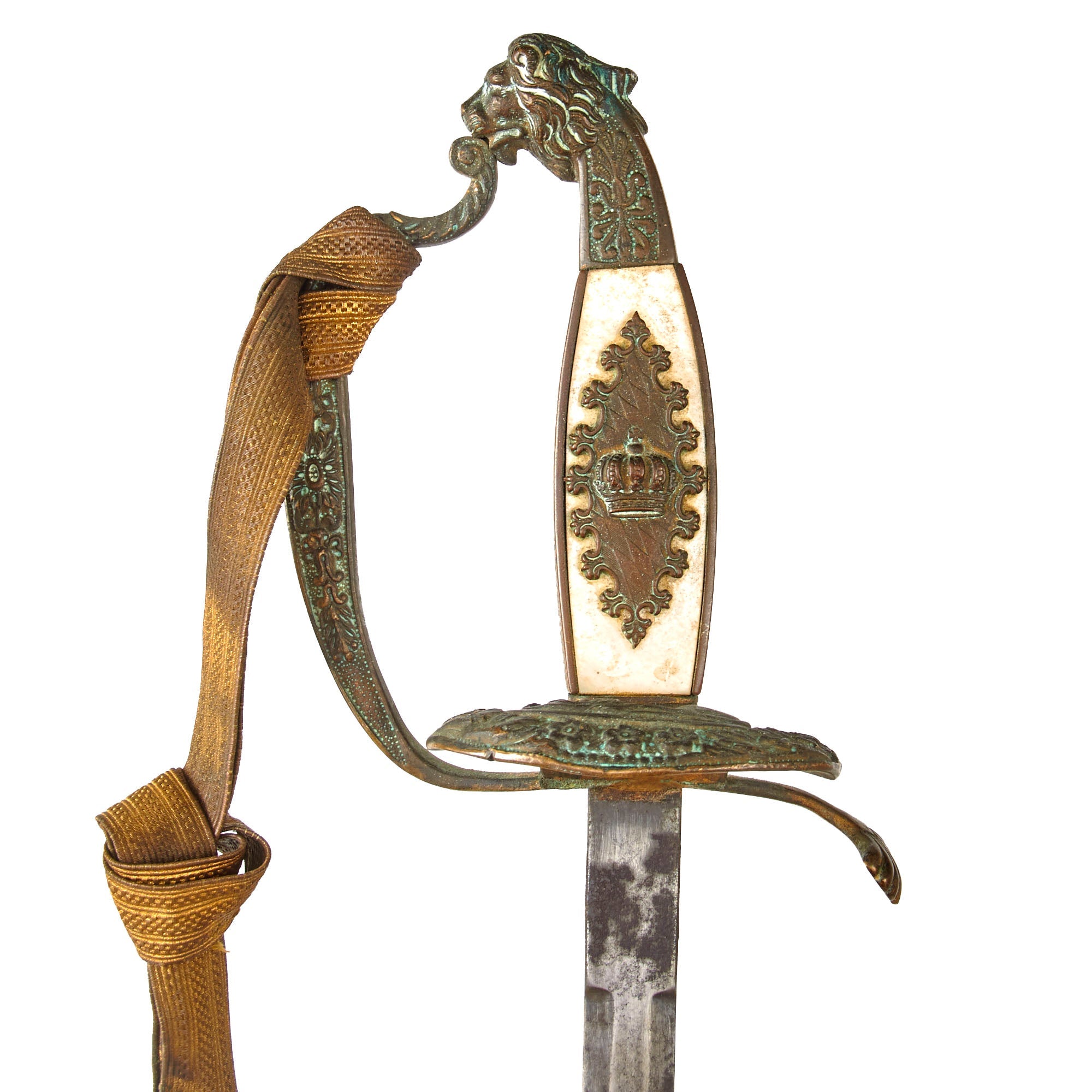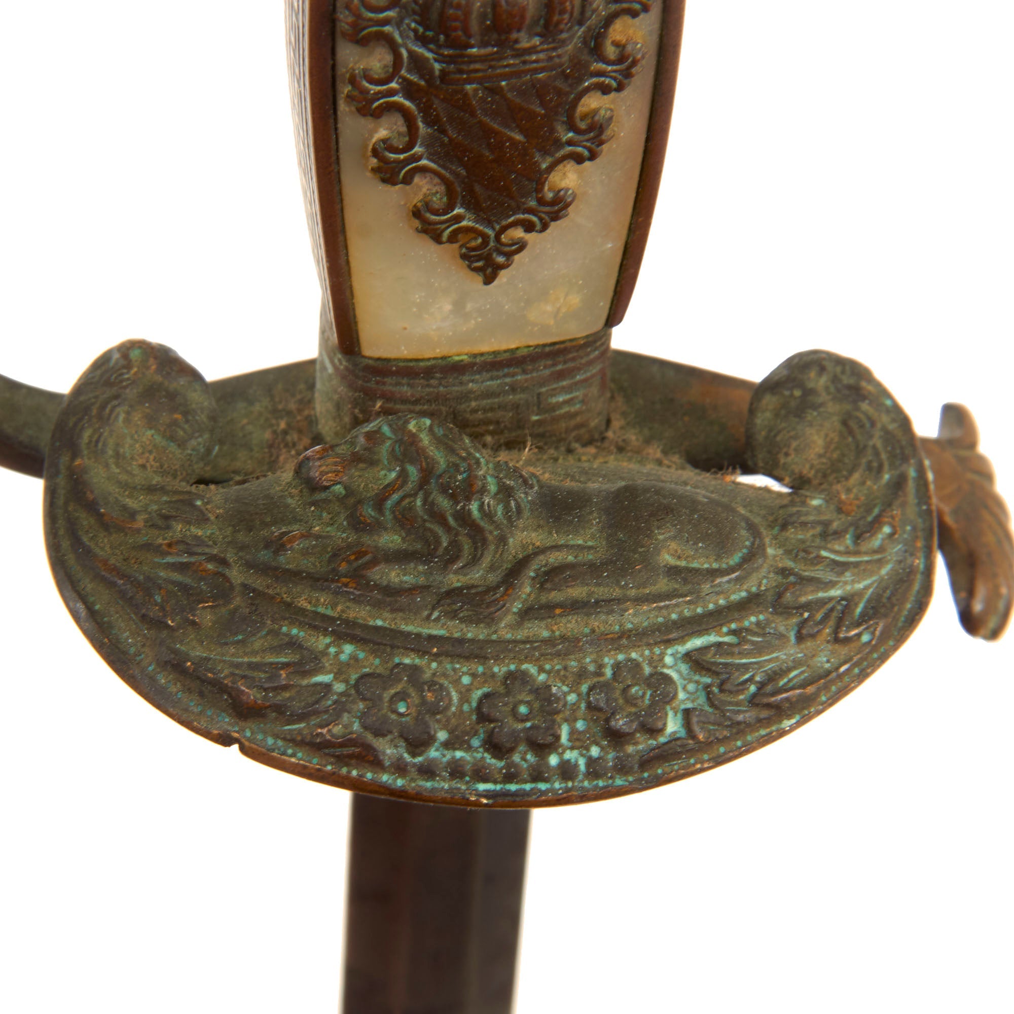 Original Item. Only One Available. This is a rather lovely Bavarian officer’s court sword manufactured by the prestigious firm of Mohr & Speyer of Berlin, suppliers of the Berlin Court. The sword has heavy verdigris across the hilt with a brass lion’s head pommel and mother of pearl grip inlaid with a Bavarian crown motif to one side.